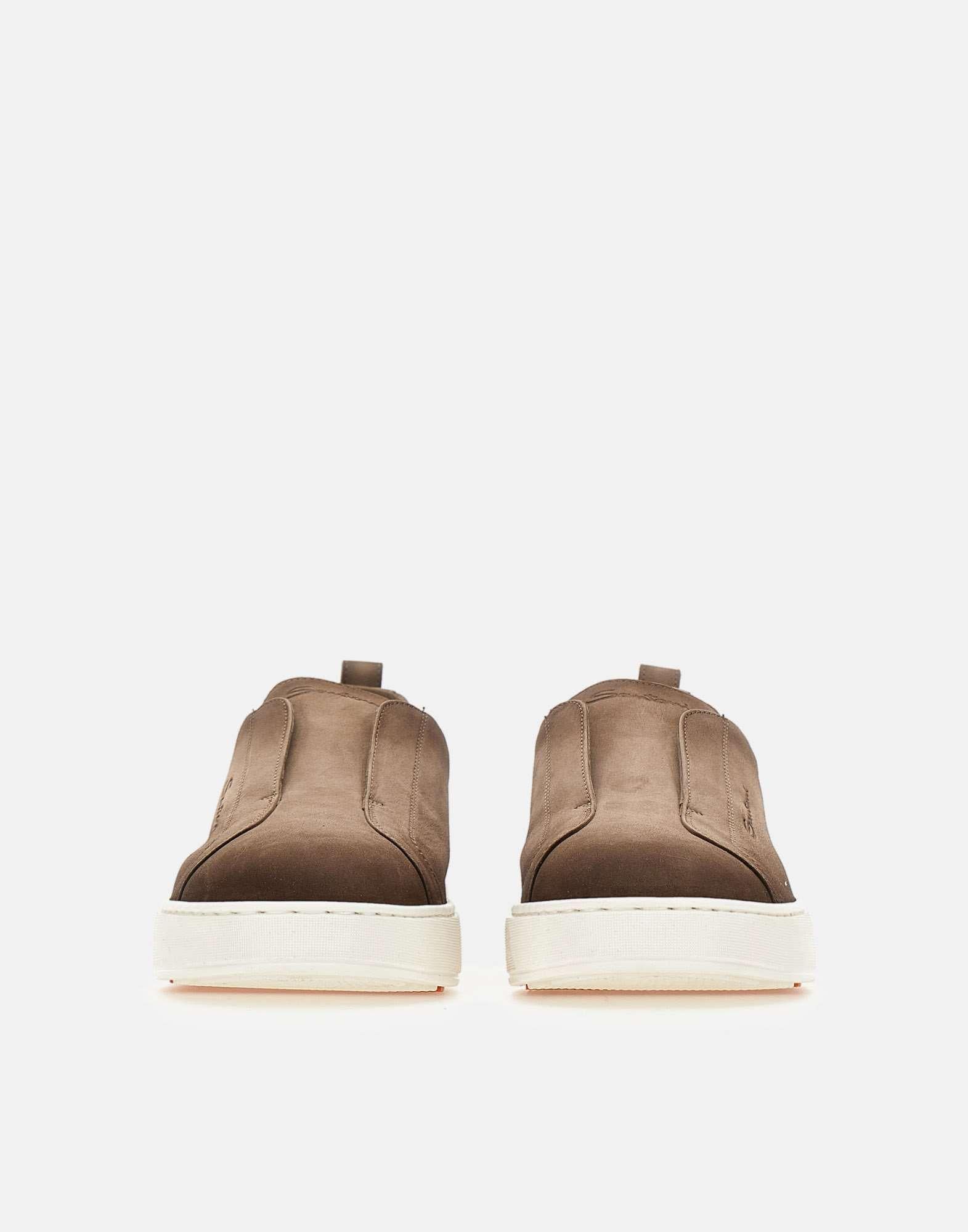Santoni "Victory" men's suede sneakers , slip-on model, brown, rounded toe, visible handcrafted stitching, 4cm rubber cassette sole, Santoni lettering engraved on the tread, pull tab on the back, regular fit. Made in Italy. Single fabric pouch included. Ncf Icon system, follow the instructions inside with the appropriate card.