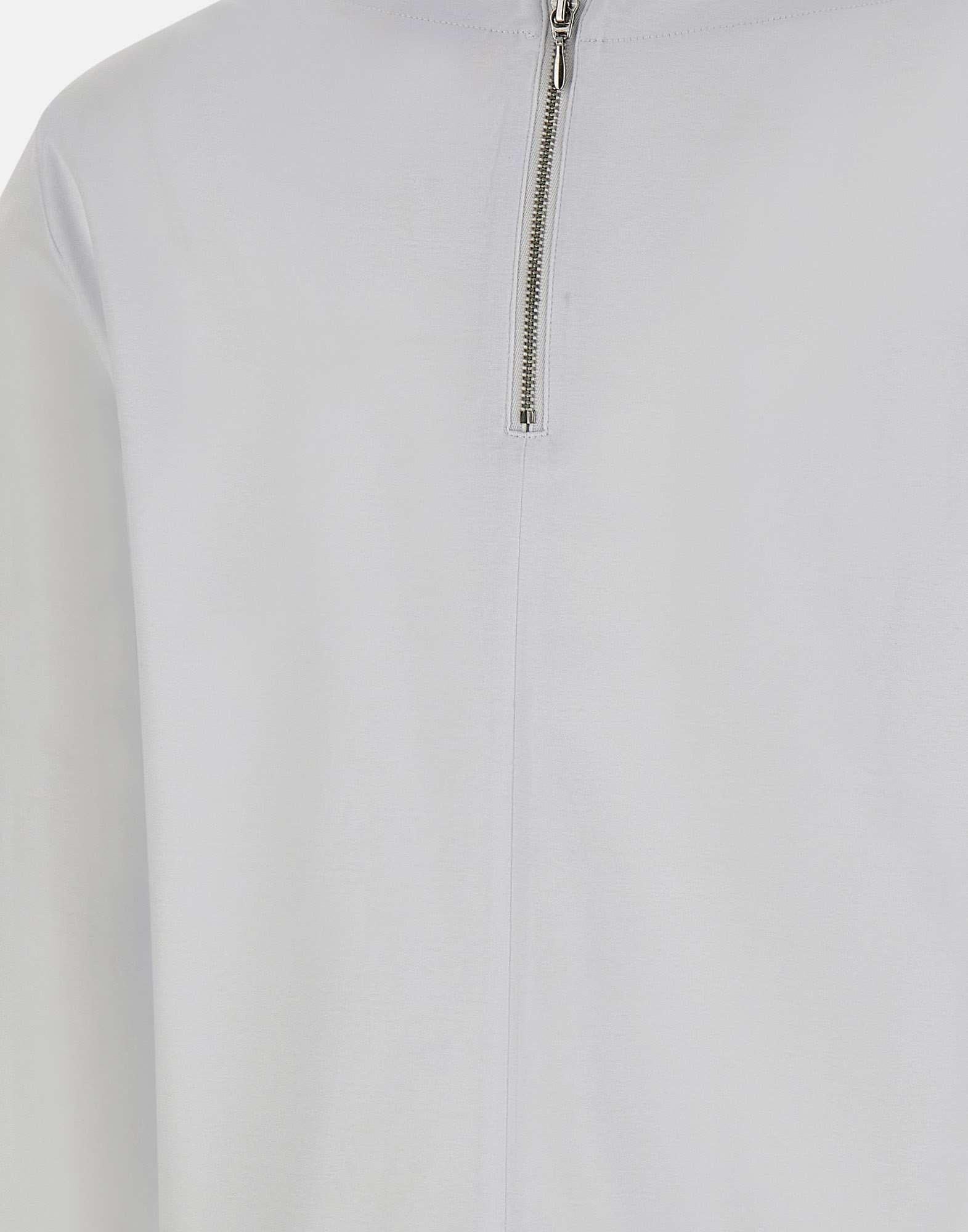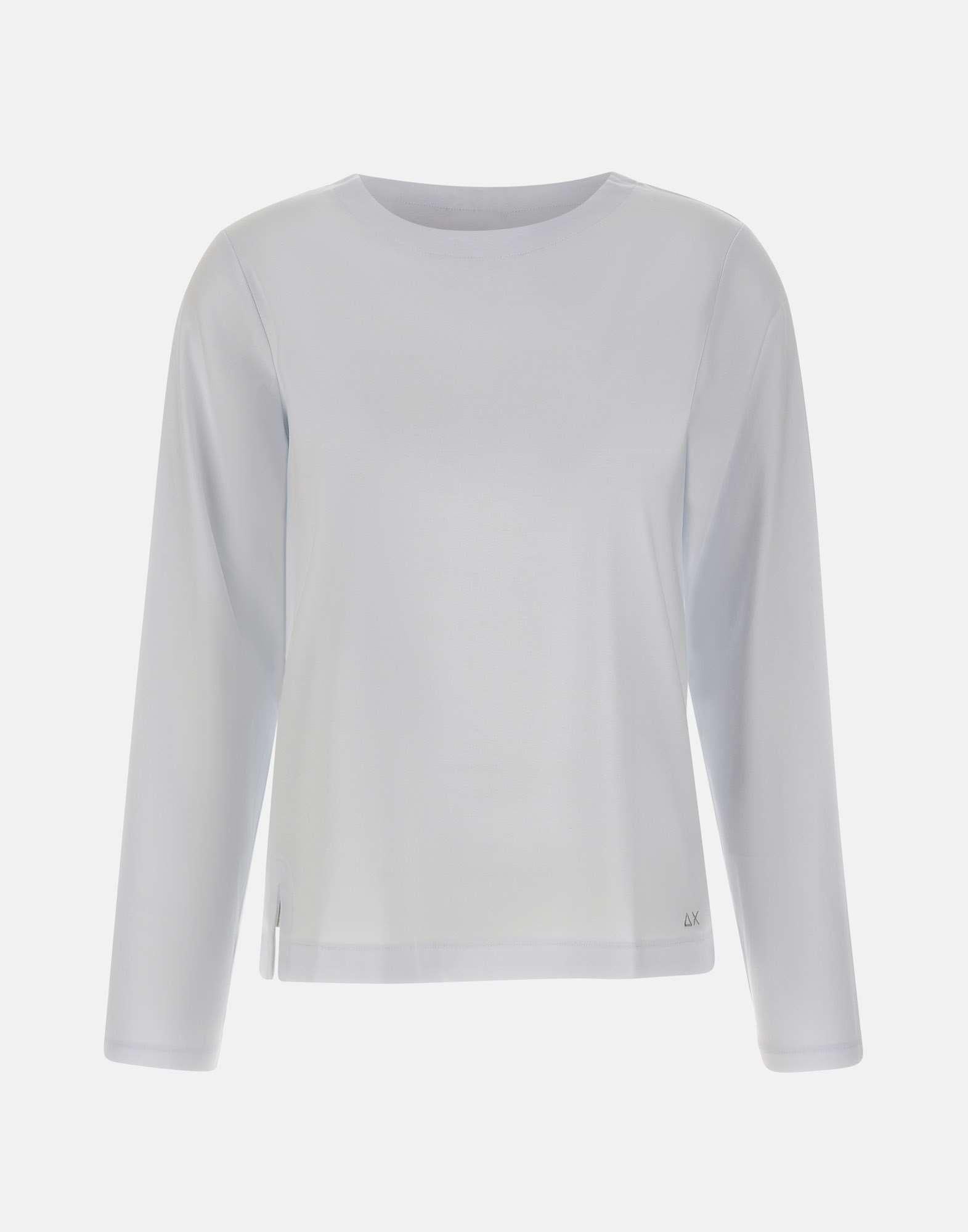 Sun68 "Luxury" women's t-shirt in white cotton jersey with a modern, minimalist design. It features long sleeves, a crew neck, and a back zip for a refined and functional detail. The side slit at the hem and tone-on-tone embroidered logo complete look. The boxy fit creates a relaxed, contemporary silhouette, ideal for casual-chic outfits.
