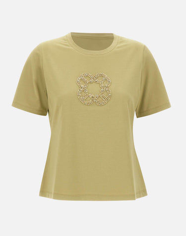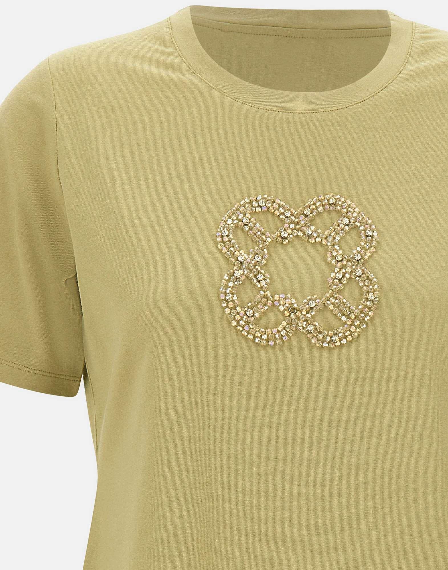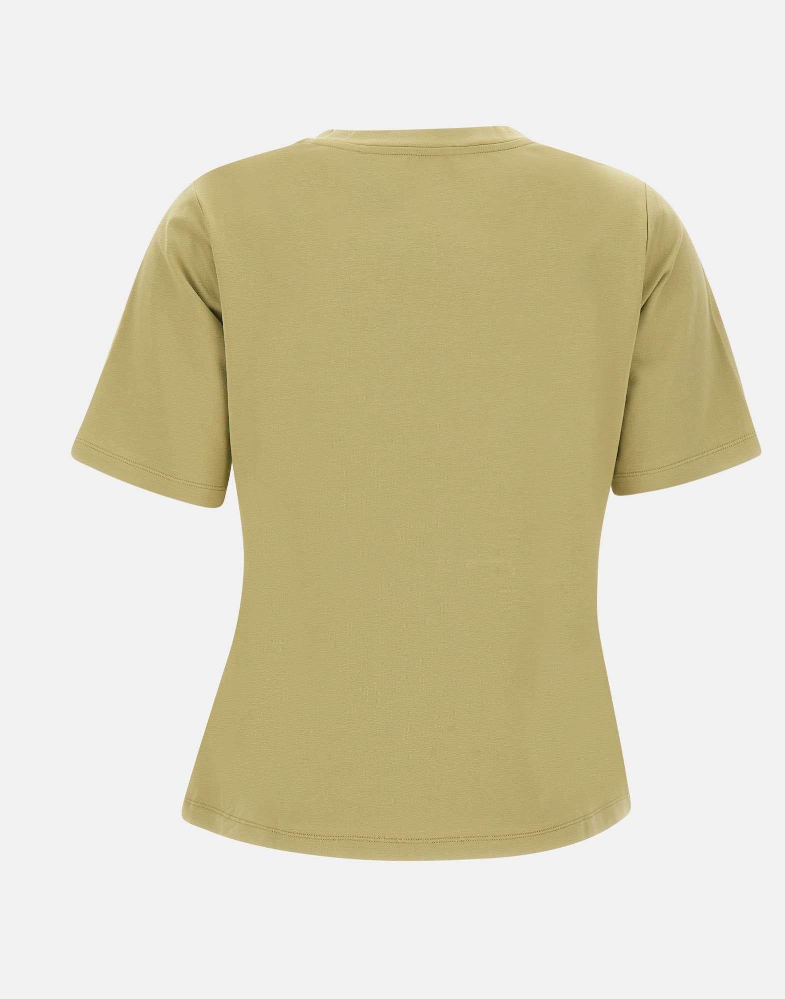 Elena Mirò women's T-shirt crafted from stretch cotton in pistachio green. Designed with short sleeves and a ribbed crew neck, it is finished with a jewel-style monogram logo on the chest for a refined signature detail. The regular fit ensures comfort and easy styling, perfect with jeans for off-duty looks or layered under a blazer from morning to evening.
