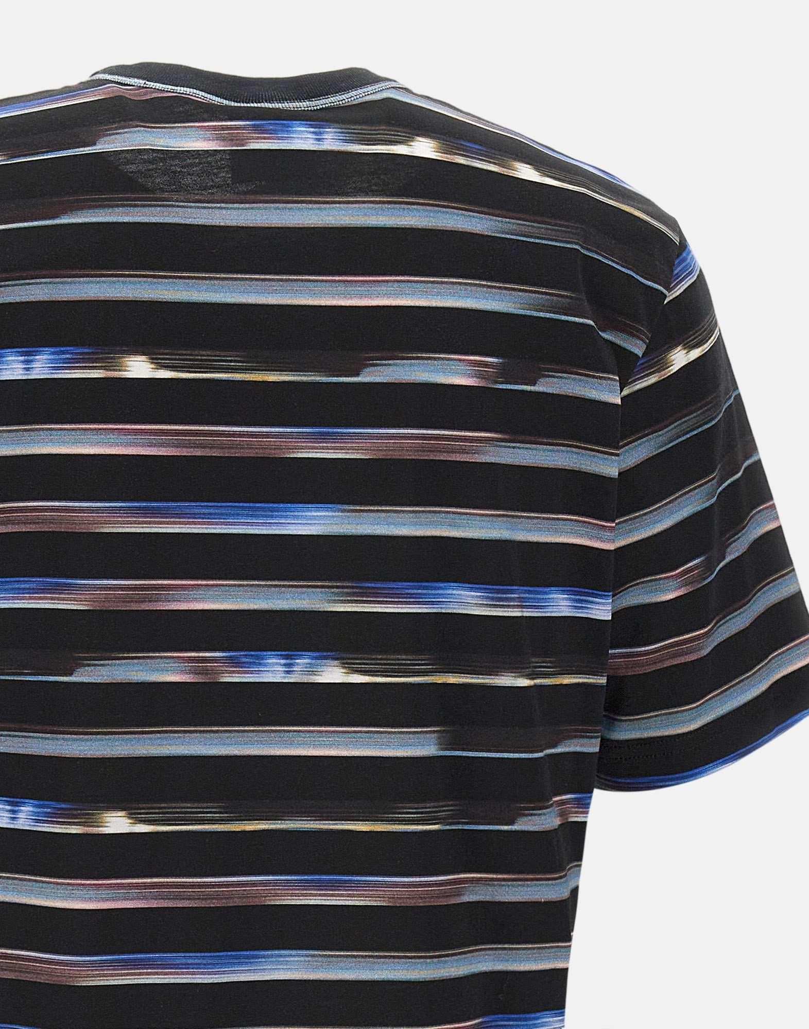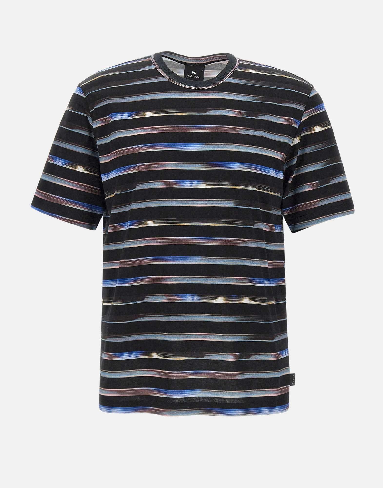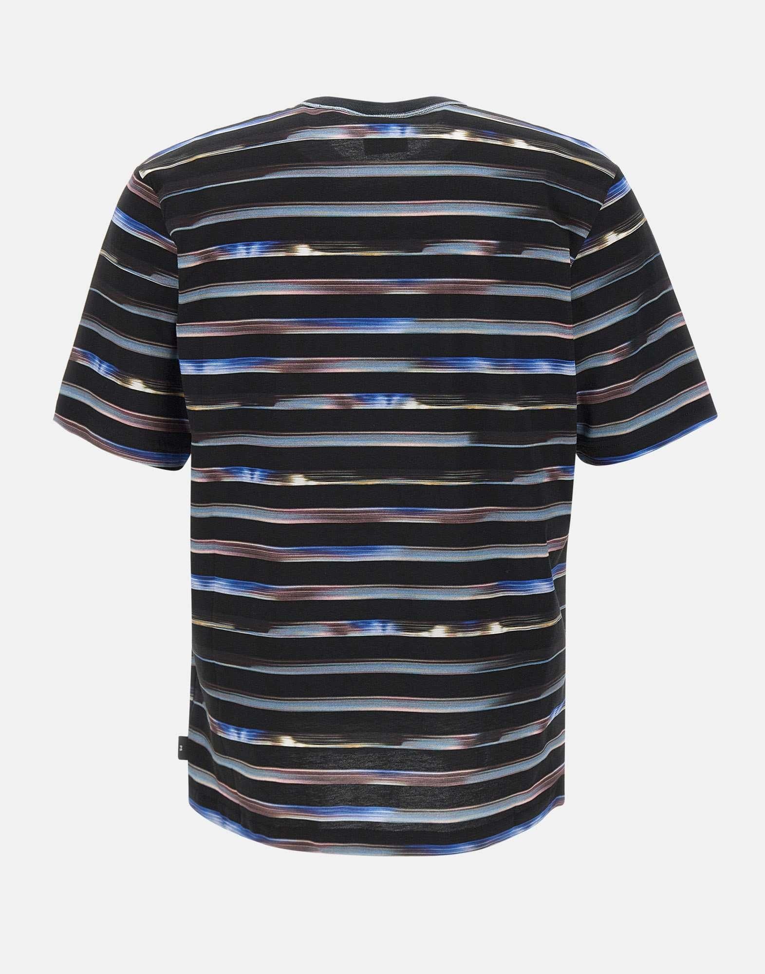 PS Paul Smith "Digital Stripes" t-shirt crafted from organic cotton, featuring a multicolor horizontal stripe pattern on a navy blue base. Designed with a stitched ribbed crew neck, short sleeves, and a regular fit for everyday comfort. A vibrant and timeless piece that embodies Paul Smiths playful aesthetic. Machine washable.