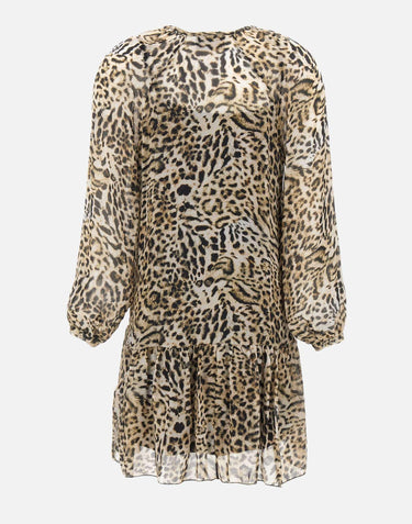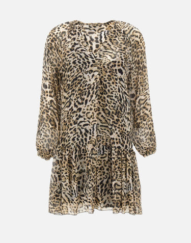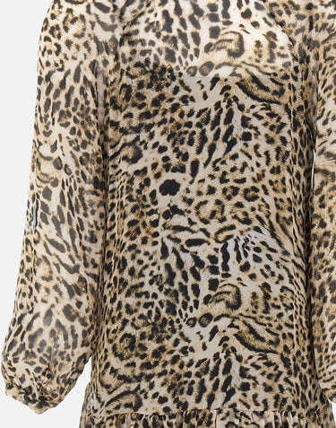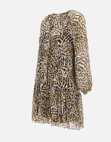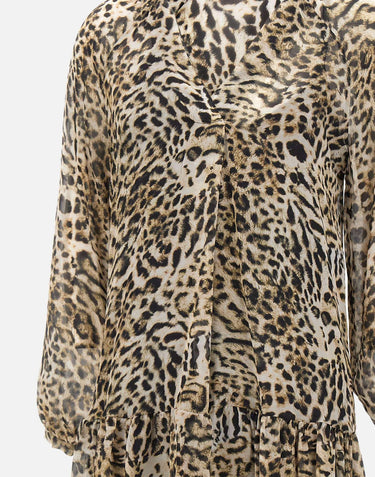 Kaos dress in viscose crepe with animalier print in black and beige tones. Featuring a V-neckline and long sleeves with fabric-covered button cuffs, it is enhanced by flounces at the hem that add fluidity and movement. Black slip included. Regular fit, for an elegant and contemporary look.