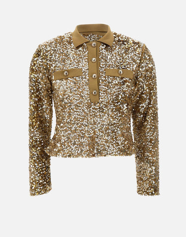 Marella "Betta" crepe blouse, embellished with a cascade of gold sequins for a luminous and sophisticated effect. Inspired by classic polo shirt, this style features a classic collar, long sleeves, patch pockets on chest, and a jeweled button closure. Regular fit, ideal for evening looks or special events.