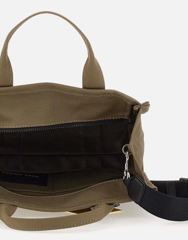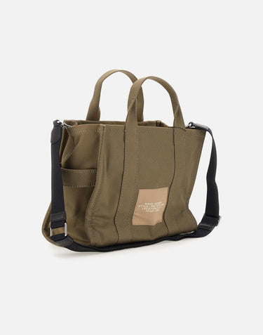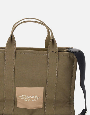 Marc Jacobs "The Medium Tote" bag, crafted from sage-green fabric with a white maxi logo on front and a woven logo patch on back.