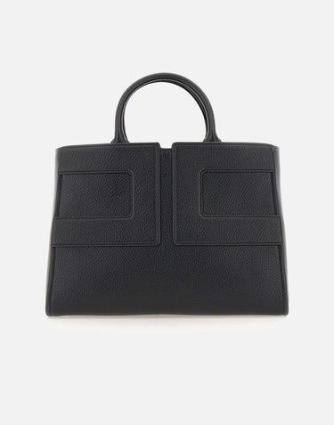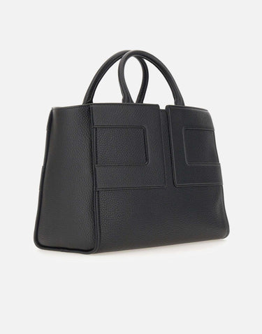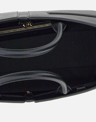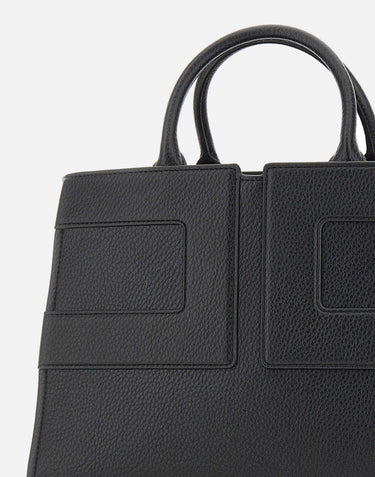 Large tote bag by Elisabetta Franchi in black faux leather with a soft, compact shape. Features tubular double handles, front tonal logo stitching, hook closure, and single-compartment interior with pocket and removable pouch. Comes with adjustable, detachable shoulder strap, gold-tone hardware, and fabric dust bag. Size: 24 x 34 x 16 cm.