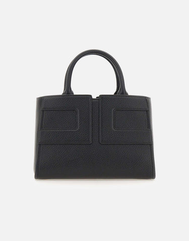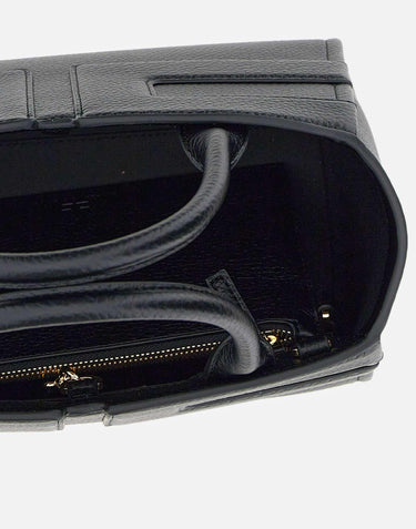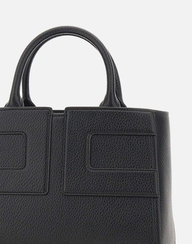 Elisabetta Franchi medium tote bag in black faux leather with a soft, compact shape. Featuring a double tubular top handle, hook closure, and stitched details with a tone-on-tone logo on the front. Single interior compartment with a pocket and removable pouch included. Adjustable and removable shoulder strap, gold-tone hardware, and fabric dust bag.