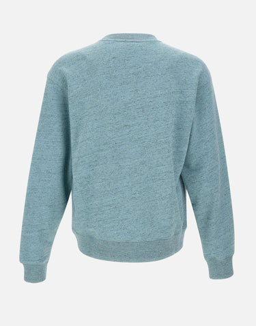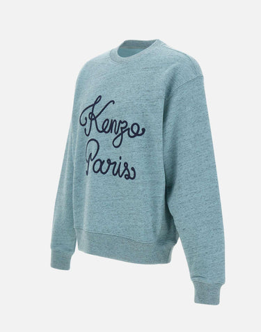 Kenzo Paris "Chainstitch" men’s sweatshirt in soft stretch fleece fabric, presented in light blue. Features crew neck, long raglan sleeves, and chain-stitch embroidered Paris logo on the chest. Ribbed side panels and wide ribbed hem complete the design. Relaxed fit.
