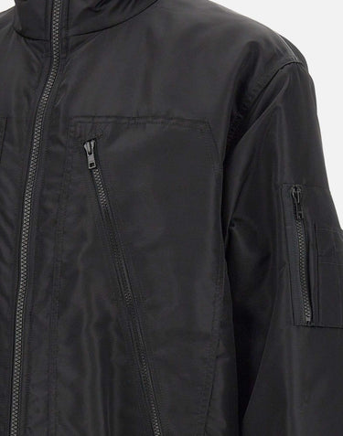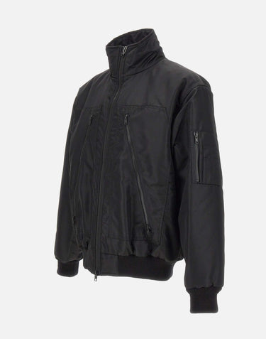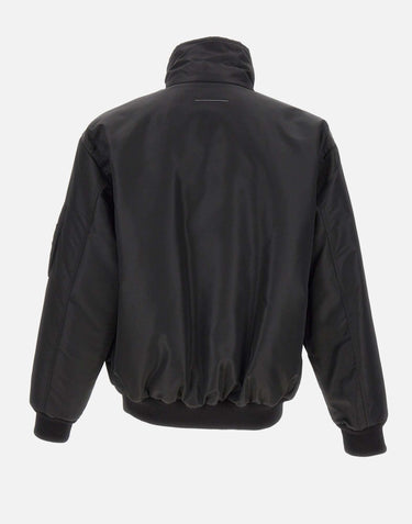 Men’s MM6 Maison Margiela bomber jacket in black nylon, featuring diamond quilting with a soft, voluminous shape. Designed with two-way zip fastening, diagonal zip pockets, sleeve utility pocket, and rib-knit trims at collar, cuffs, and hem. Polyester padding ensures warmth and comfort, while the Maison’s signature white stitched line on the back adds a distinctive touch. Made in Italy. Relaxed fit.
