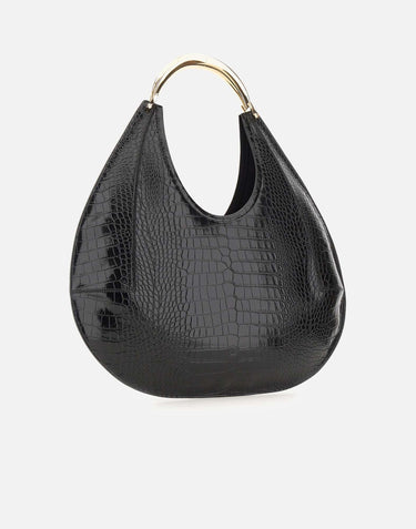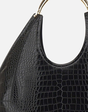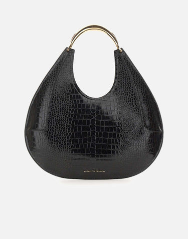 Large Elisabetta Franchi hobo bag crafted in black faux leather with crocodile-embossed texture. Features a gold-tone jewel handle and logo detail at hem. Comes with fabric dust bag. Size: 47x51 cm.