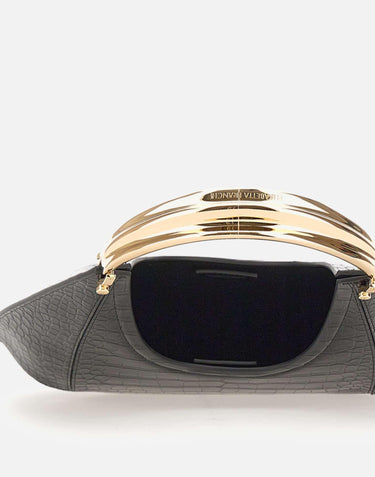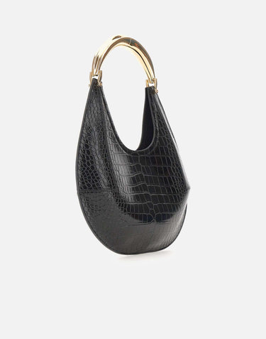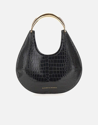 Medium Elisabetta Franchi "Daily" hobo bag in black croc-embossed faux leather. Features a gold-tone jewel handle and bottom logo detail, with a single roomy compartment. Comes with fabric dust bag. Size: 35 x 39 cm.
