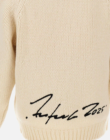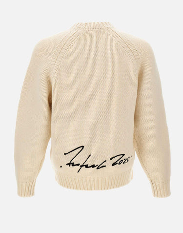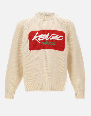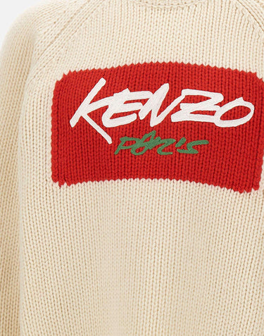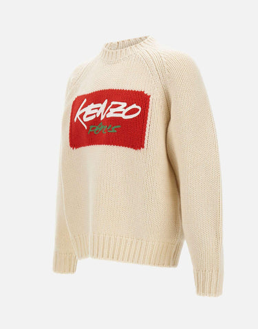 Kenzo Paris "KenzoxFutura200" wool sweater, cream color. Part of the collaboration with artist Futura 2000, it showcases bold graffiti-inspired typography. Features long raglan sleeves, round neckline, ribbed edges, Kenzo Paris by Futura 2000 logo on chest, and Futura 2025 signature on back. Relaxed fit.