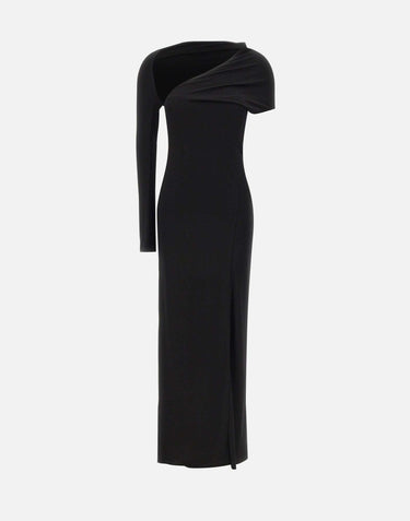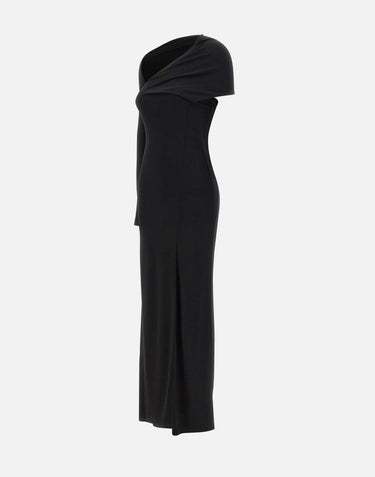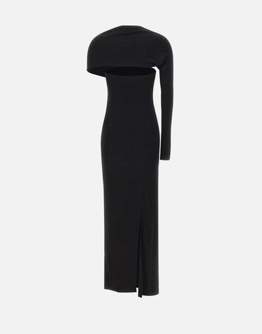 Courrèges "One Shoulder Crepe Jersey Dress", crafted in black viscose crepe. The long, refined design features an asymmetrical one-shoulder neckline with matching scarf, hem slit, and tailored construction enhancing the silhouette. Slim fit.