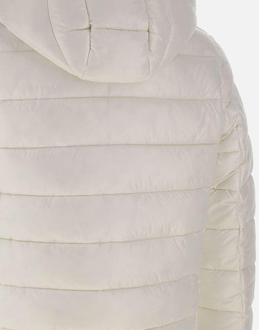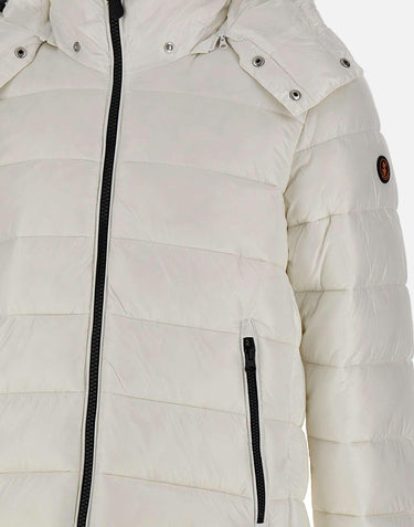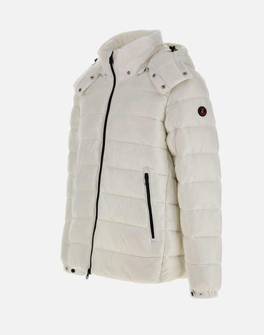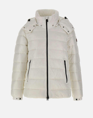 Men's Save The Duck "Florian Love21" puffer jacket in glossy white fabric with detachable hood for a versatile look. Filled with 100% Animal Free eco-friendly padding, it provides warmth and lightness while respecting the environment. Horizontal quilting, two-way front zip closure, side zip pockets, and adjustable cuffs with button. Iconic round logo patch on the left sleeve. Storage bag included. Regular fit.