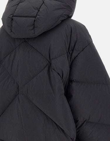 Duno "Peggie" women's down jacket, black colour, fixed hood with drawstring, front closure with double slider zip, elasticated cuffs, bottom with drawstring, logo patch on left sleeve, diamond quilting, light and warm padding, oversized fit.