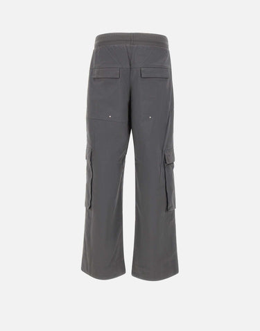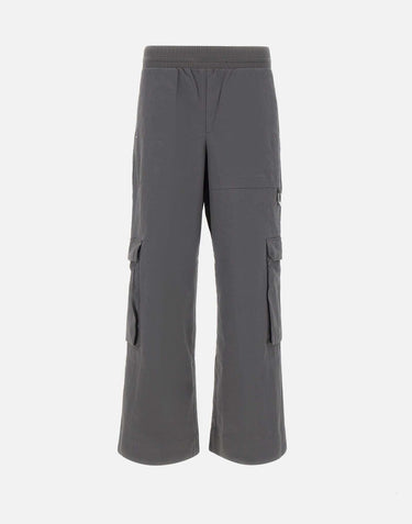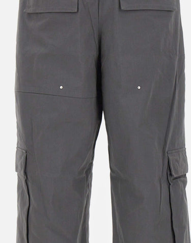Heliot Emil "Pulsar cargo" pants in dark grey technical cotton blend. Featuring elasticated drawstring waist, straight wide-leg silhouette, multiple utility pockets, and signature H detail on left leg. 33 cm hem and 80 cm inseam (size M). Relaxed fit for a modern utilitarian aesthetic.