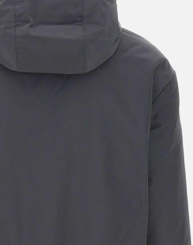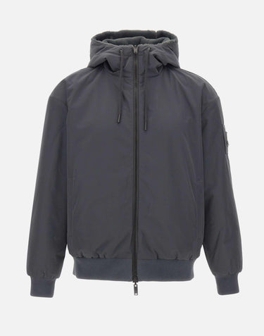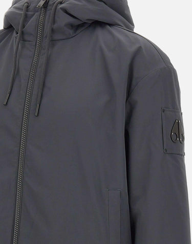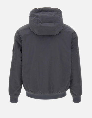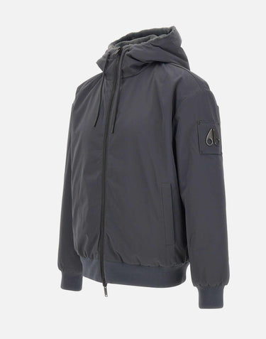 Moose Knuckles "Roland Reversible Bunny" jacket in smoke grey, featuring two styles in one: side A in soft faux fur for a cozy look, and side B in high-performance shell for weather protection. Designed for optimal warmth (thermal experience 0°F to 14°F). Adjustable drawstring hood, two-way front zip closure, welt pockets on side A, and zip pockets on side B. Iconic Moose Knuckles metal logo on one side and patch logo on other. Back length 69 cm for size M. Regular fit.