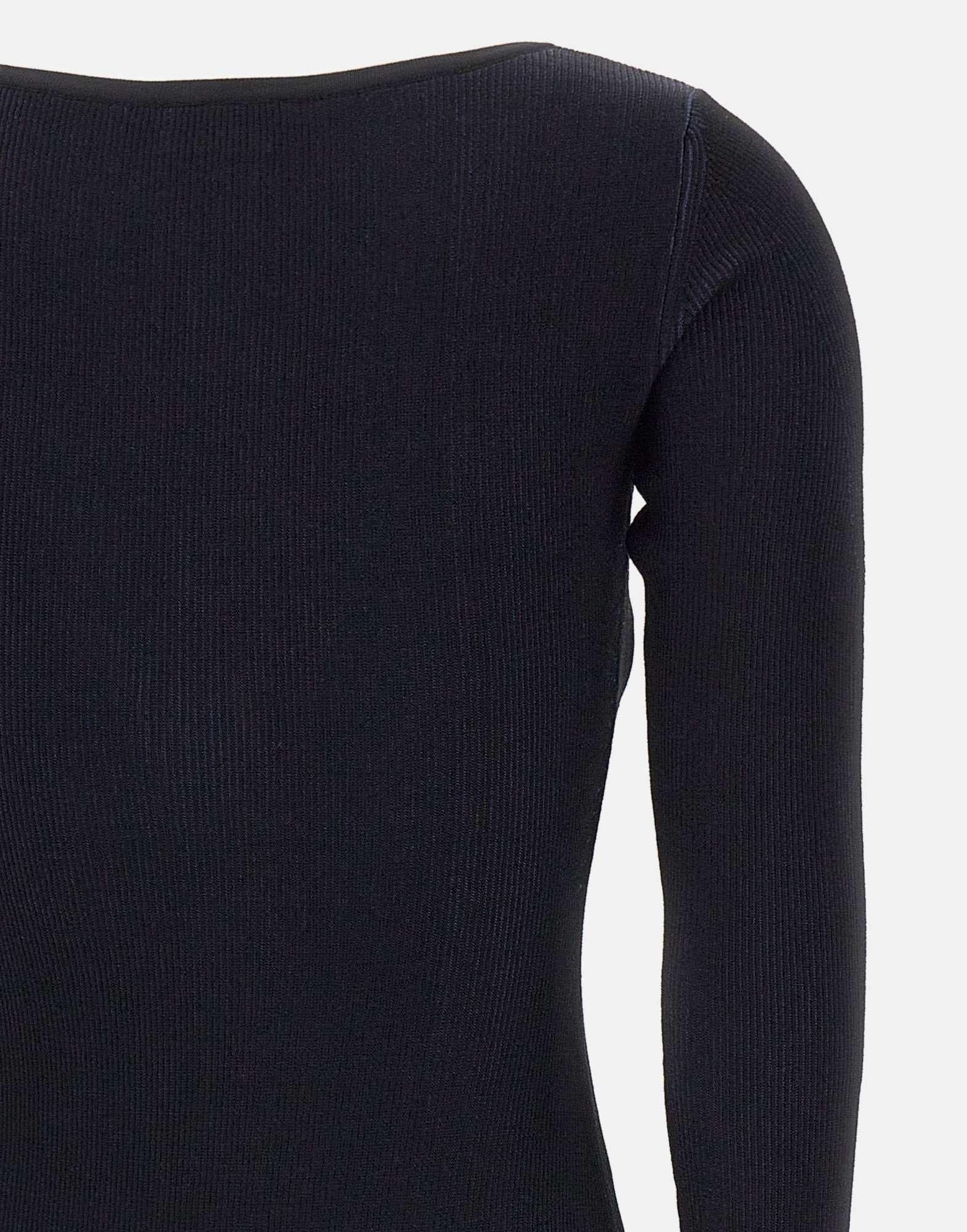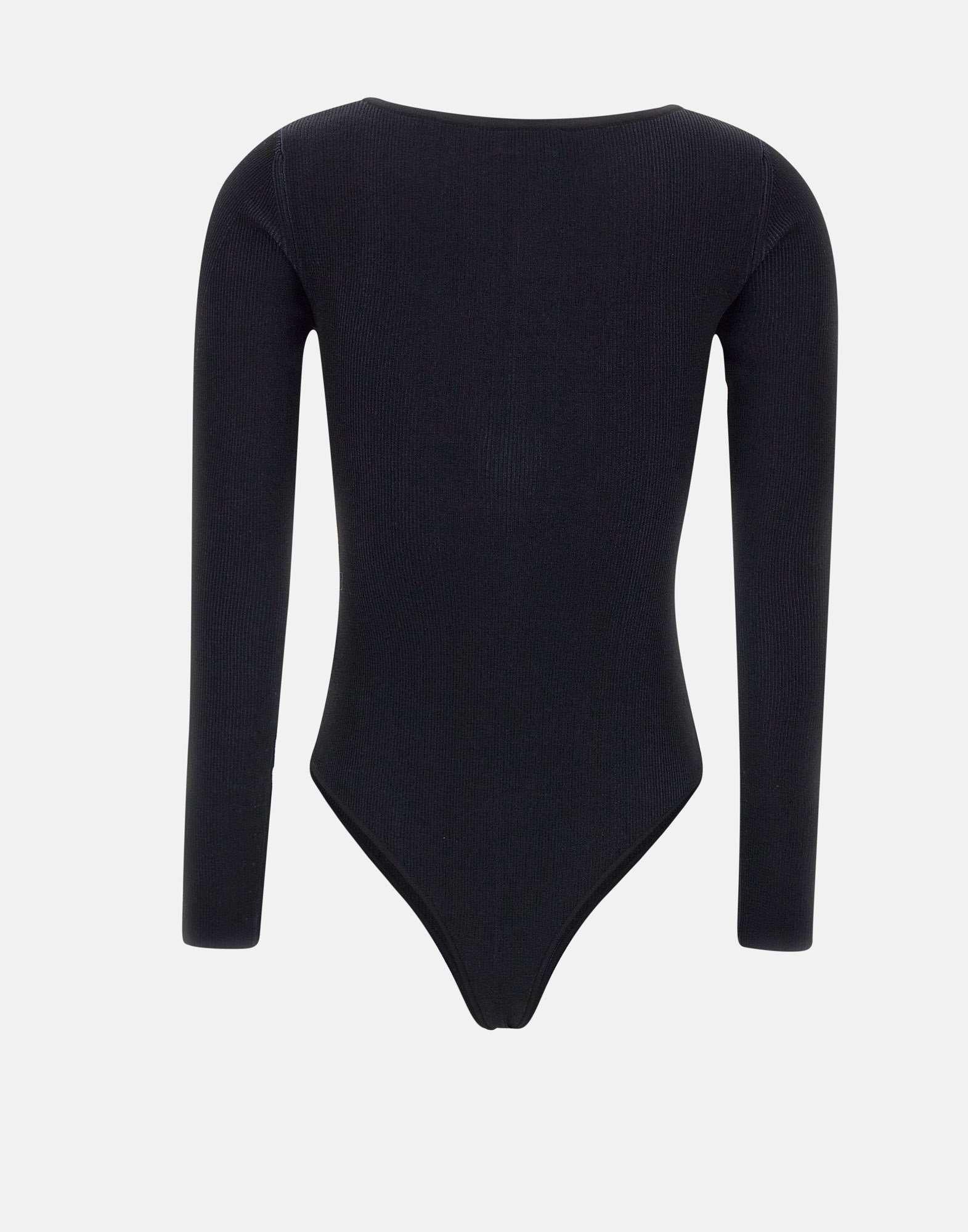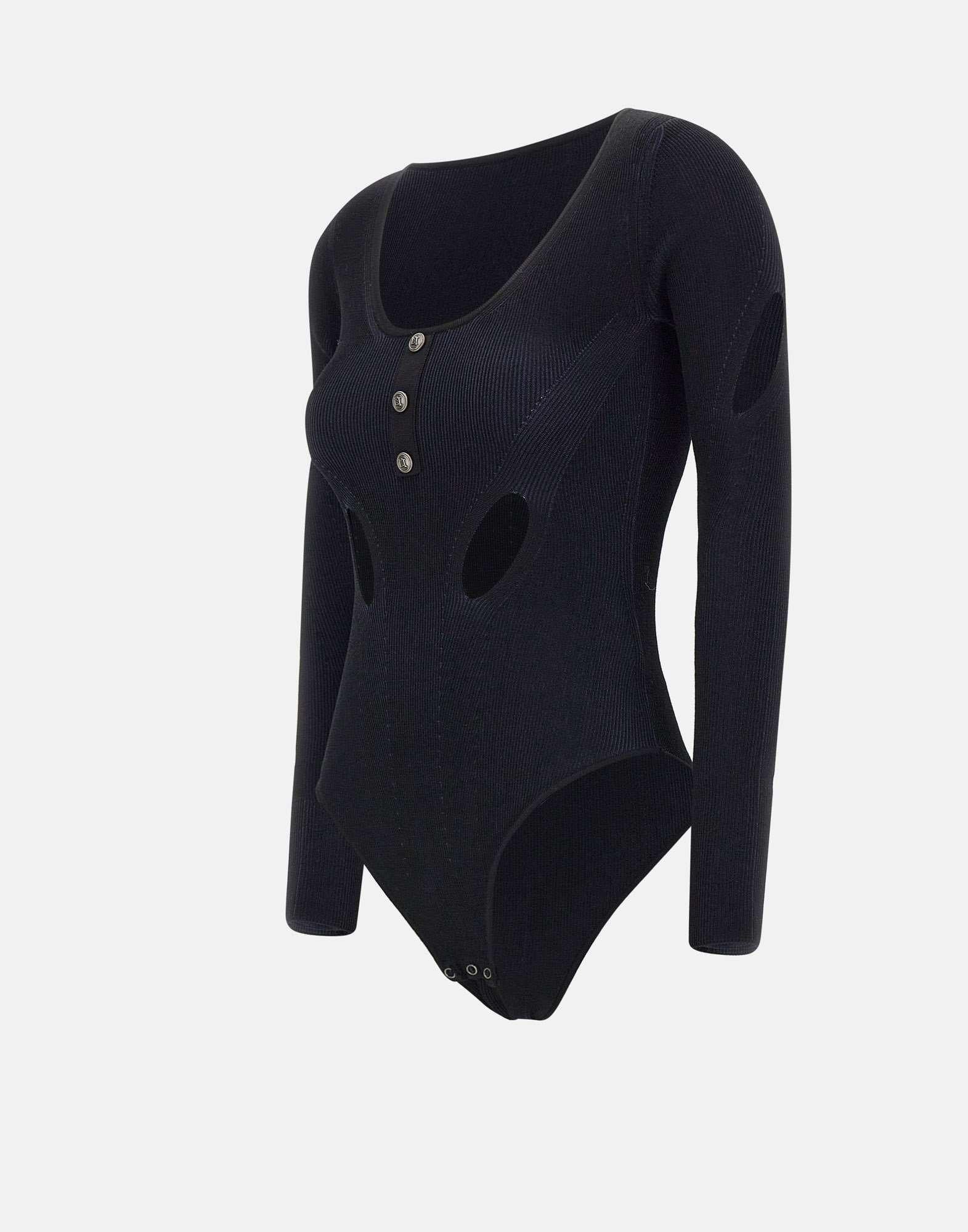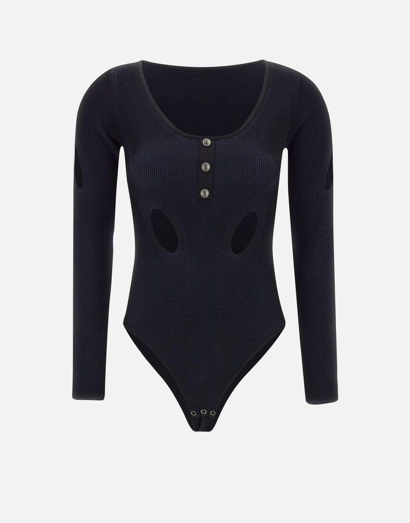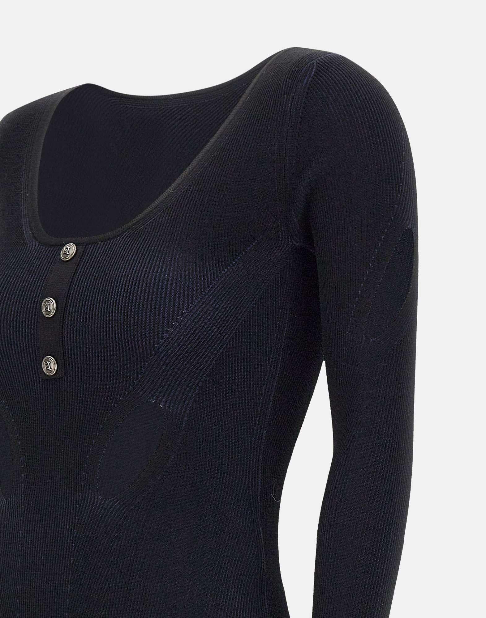 Elisabetta Franchi "Daily" black, viscose blend bodysuit, long sleeves, madonna neckline, logo buttons, cut-outs on sleeves and waist, culotte-style briefs, button closure at hem. Length 60 cm for size 40 IT, slim fit.
