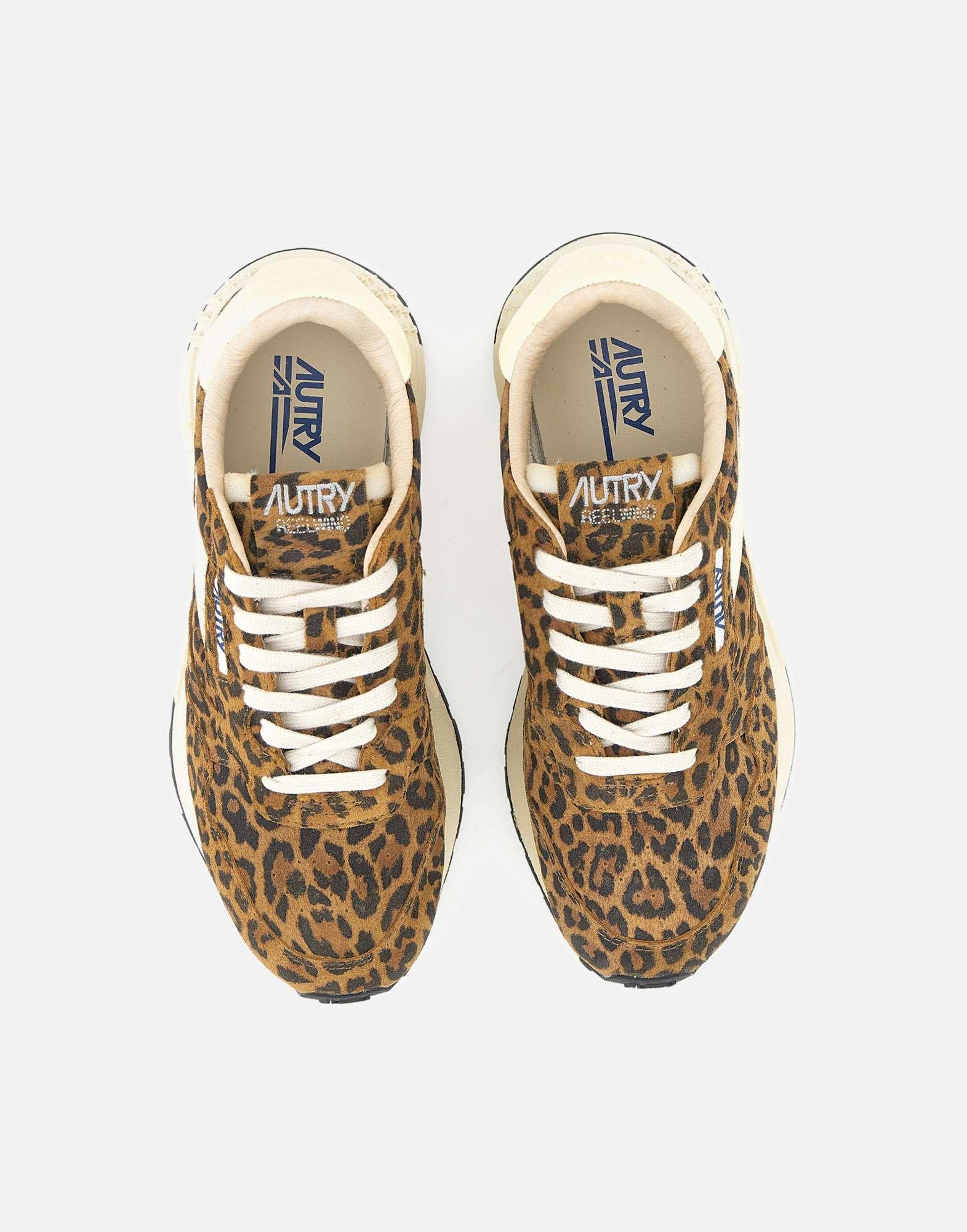Autry women's sneakers "Reelwind Low" crafted from leopard-print suede with smooth ivory leather inserts and branded heel tab. Featuring a slim silhouette and 1980s inspired retro design, they blend Autry's signature aesthetic with running shoe functionality. White cotton flat laces, branded tongue, and side logo. The 3.5 cm rubber sole, detailed with star motifs and the A-arrow graphic logo, ensures lightness, flexibility, and superior grip. Perfect for a modern, active lifestyle.