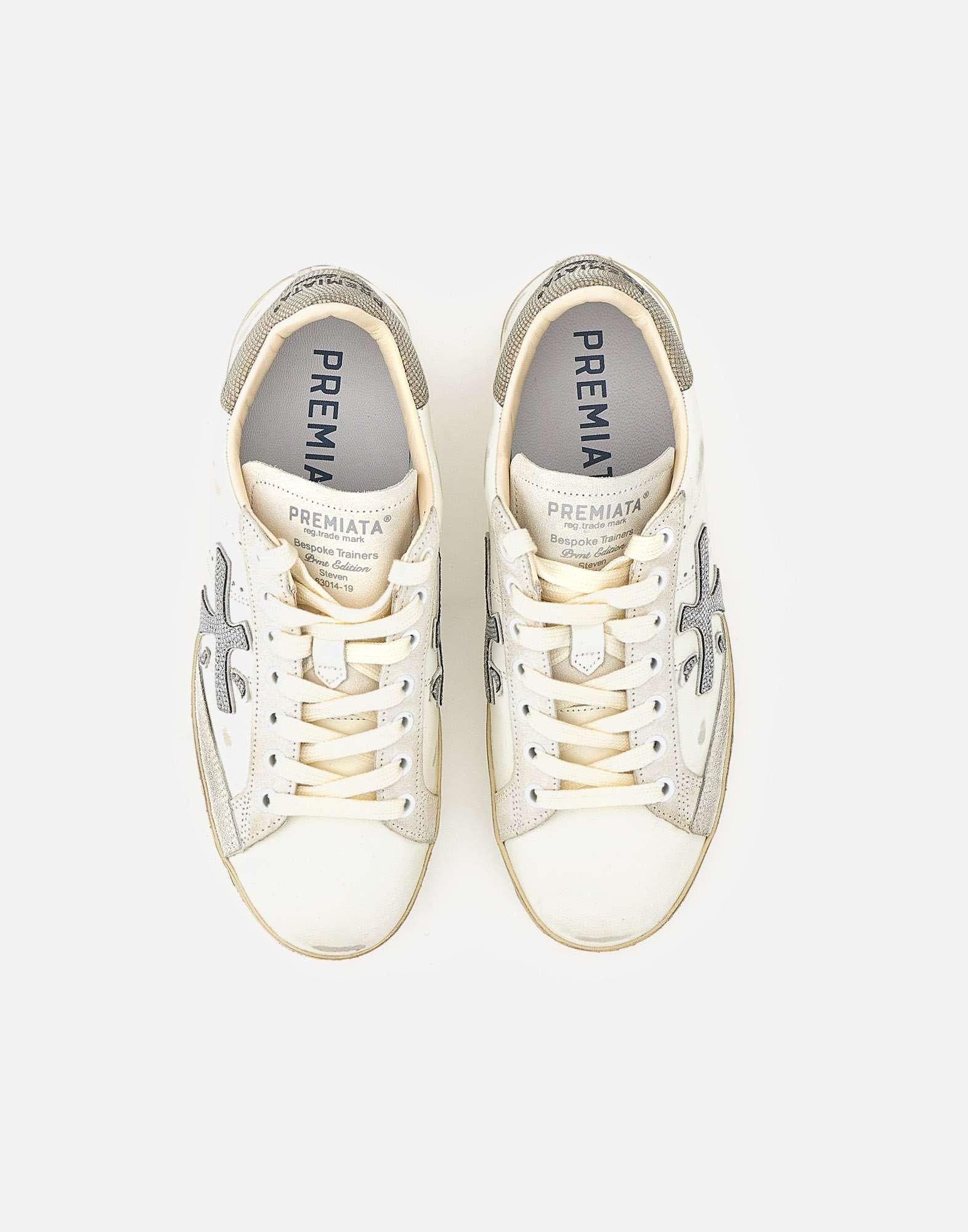 Premiata "StevenD 8127" women's sneakers crafted in dirty-effect white leather, featuring flat matching laces and a contrasting logoed heel tab in metallic fabric. The style includes a branded tongue, silver color Premiata logo on the sides, and a rubber cupsole measuring 2.2 cm that completes the silhouette with an essential profile. Iconic and forward-looking, these sneakers are perfect for street and youthful outfits, defined by refined details and modern design.