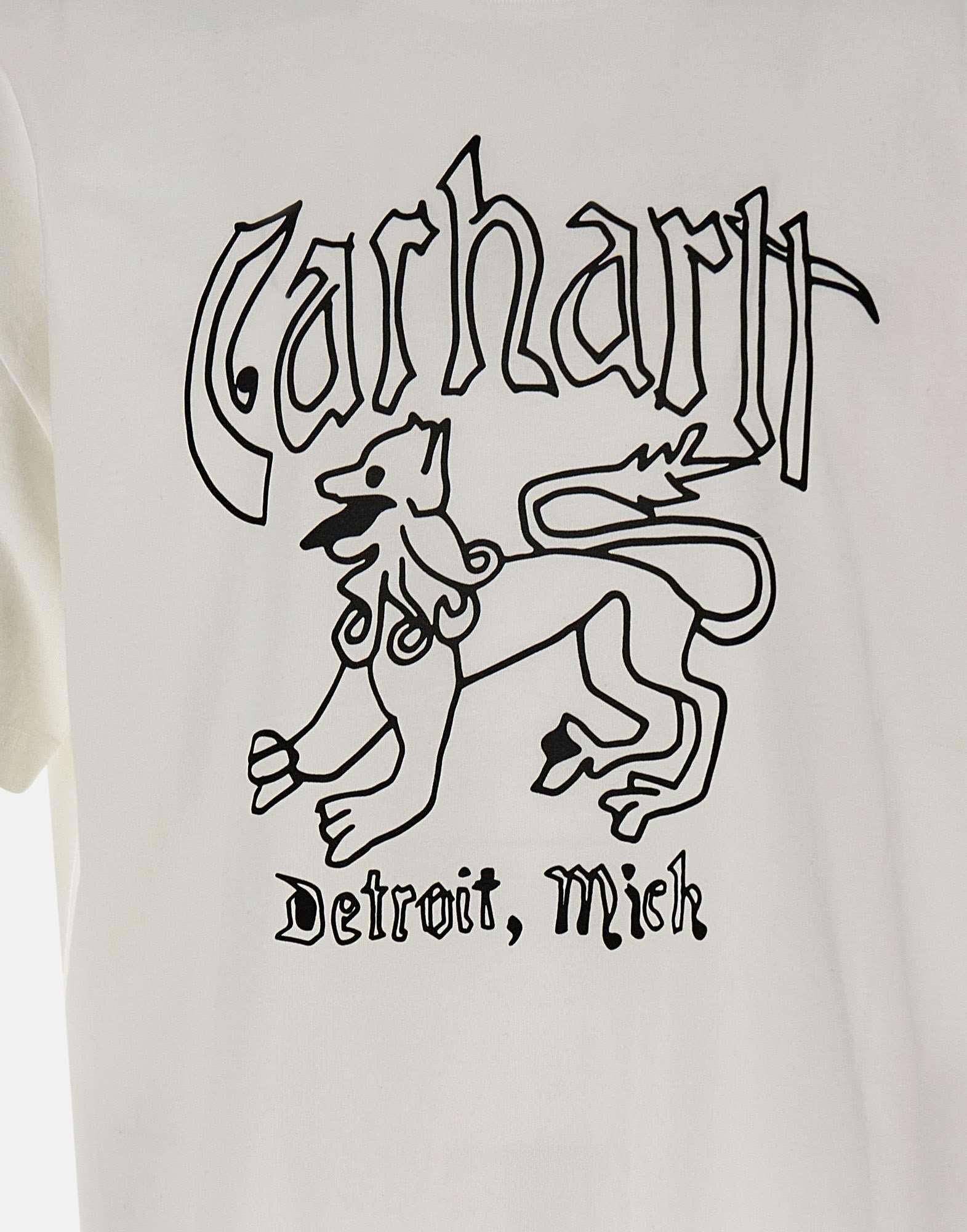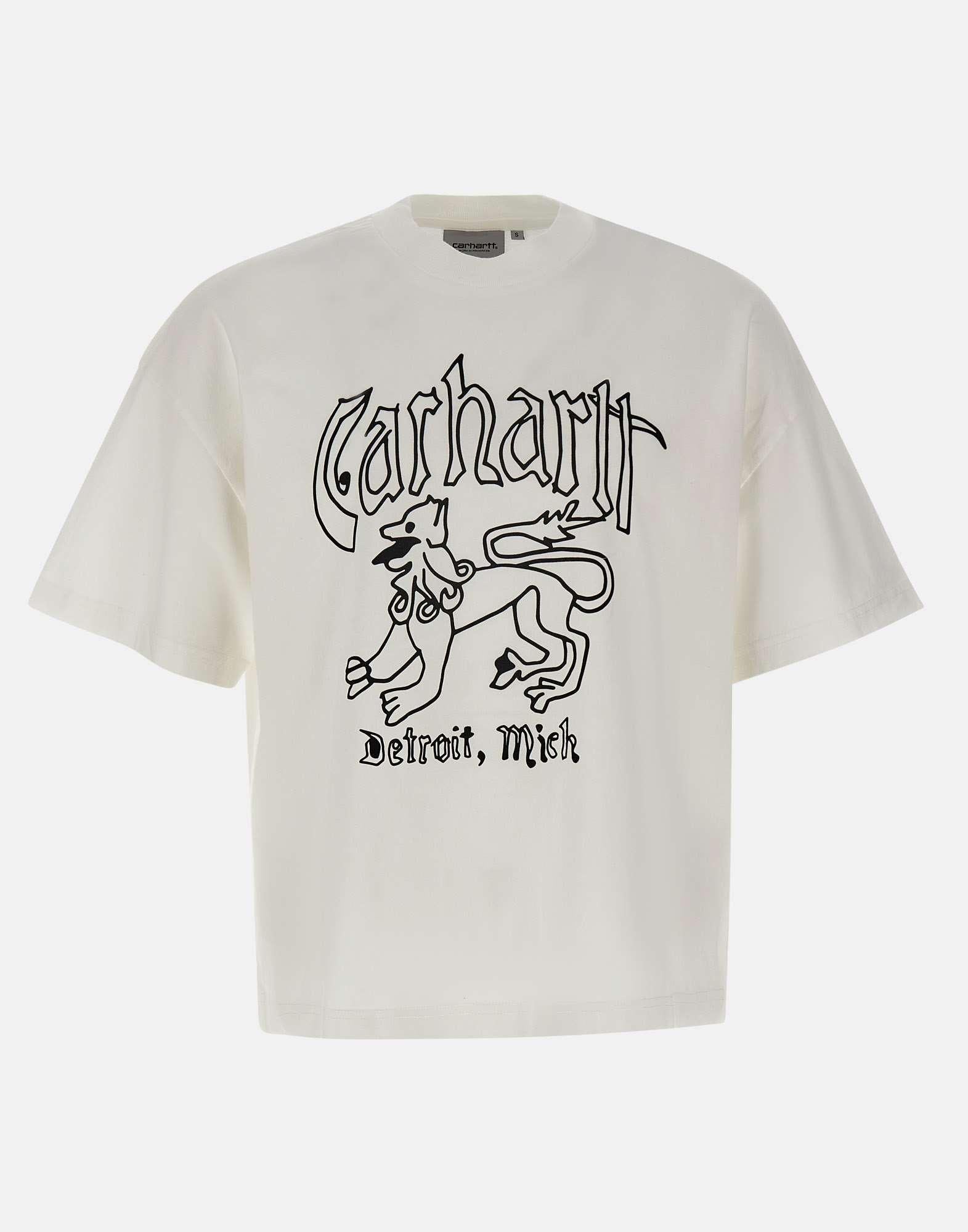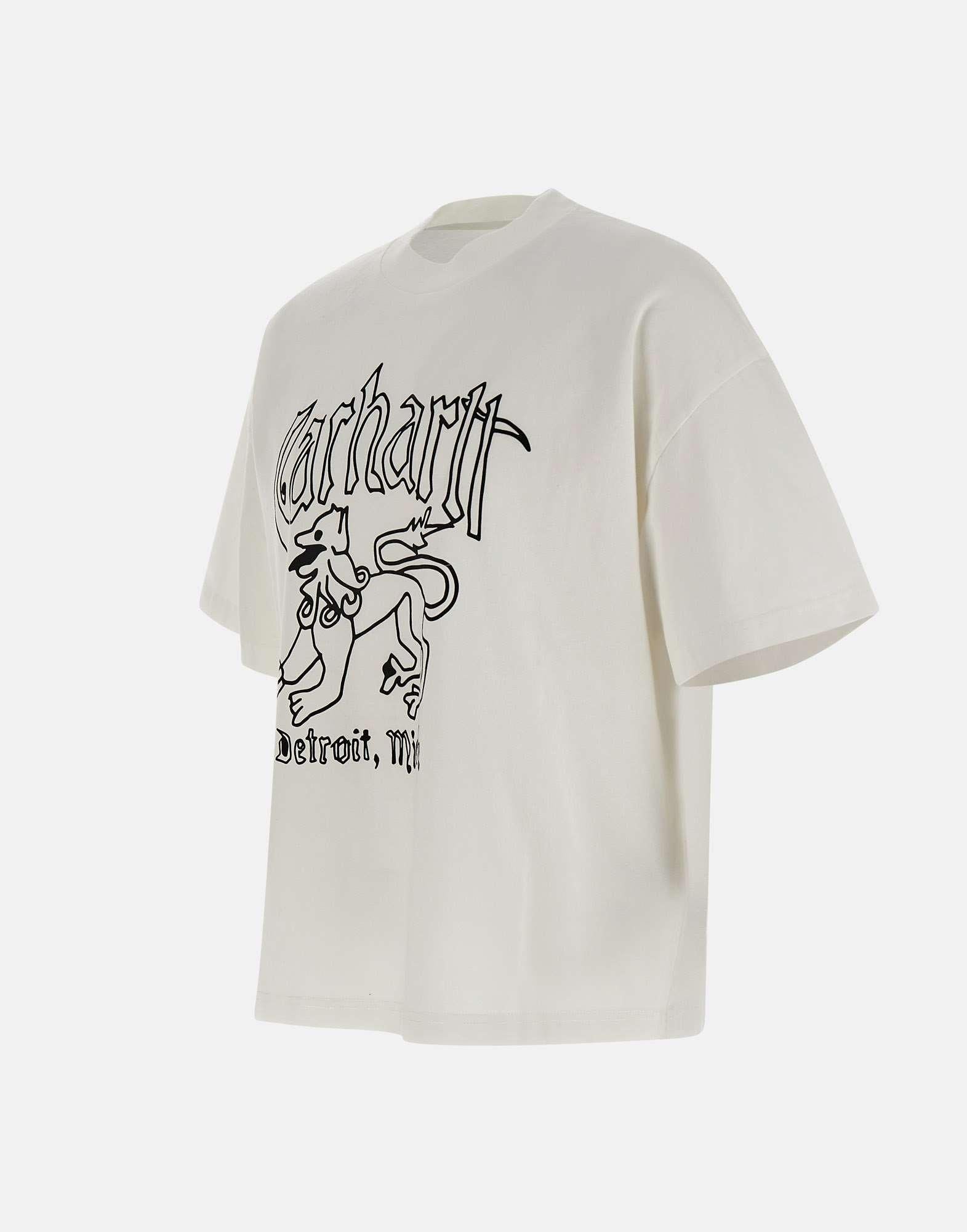 Mens Carhartt WIP "S/S Hackwork" t-shirt in stone-washed midweight cotton jersey in white, offering a slightly worn-in look. Features short sleeves, a crew neck, and a contrasting graphic print on the front. The boxy loose fit provides a relaxed, modern silhouette true to Carhartts urban style.