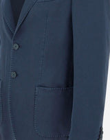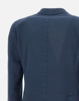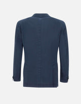Blazer uomo Santaniello in cotone e lino, color blu navy, collo con rever, chiusura con due bottoni in tinta, polsini con bottoni, tasche frontali, taschino sul petto, cuciture sartoriali mf a vista, spacchetti laterali posteriori, regular fit. Made in Italy.
