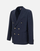 Blazer uomo Santaniello in lana e lino, blu, collo con rever a lancia, chiusura doppiopetto con bottoni gioiello silver, polsini con bottoni, tasche frontali, taschino sul petto, cuciture sartoriali francesi, spacchetti laterali posteriori, slim fit. Made in Italy.