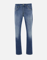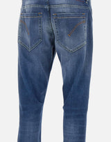 Jeans uomo Dondup "George" in cotone, blu con schiariture, cinque tasche, chiusura con bottoni logati, vita con passanti per cintura, gamba dritta fondo17cm, mini logo D in metallo sul retro, skinny fit, made in Italy