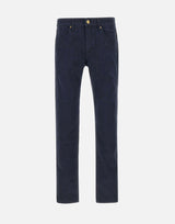 Jeckerson "John" men's cotton trousers , dark blue, regular waist with belt loops, five pockets, zip closure and logoed buttons, mini embroidered logo on front on the pocket, matching logo patch on back, iconic stitching on legs, slim fit .
