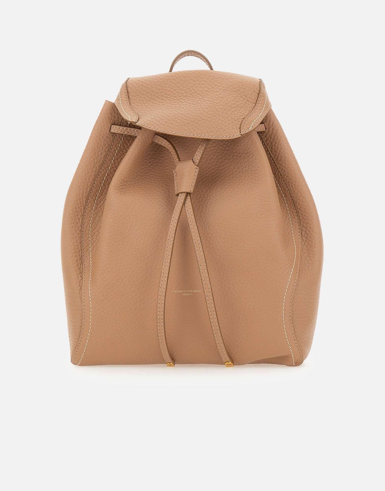 Women's Gianni Chiarini "Violette" backpack crafted from dark beige hammered leather with a bold grain, designed to blend elegance and everyday practicality. Features contrast stitching that enhances the shape, a drawstring with gold-tone tips, and a closure with snap button and flap for secure wear. The top handle and adjustable shoulder straps ensure comfort and versatility. Finished with a gold-tone logo print on the front, it is a refined accessory for a modern lifestyle. Made in Italy. Dimensions 29x12x33 cm.