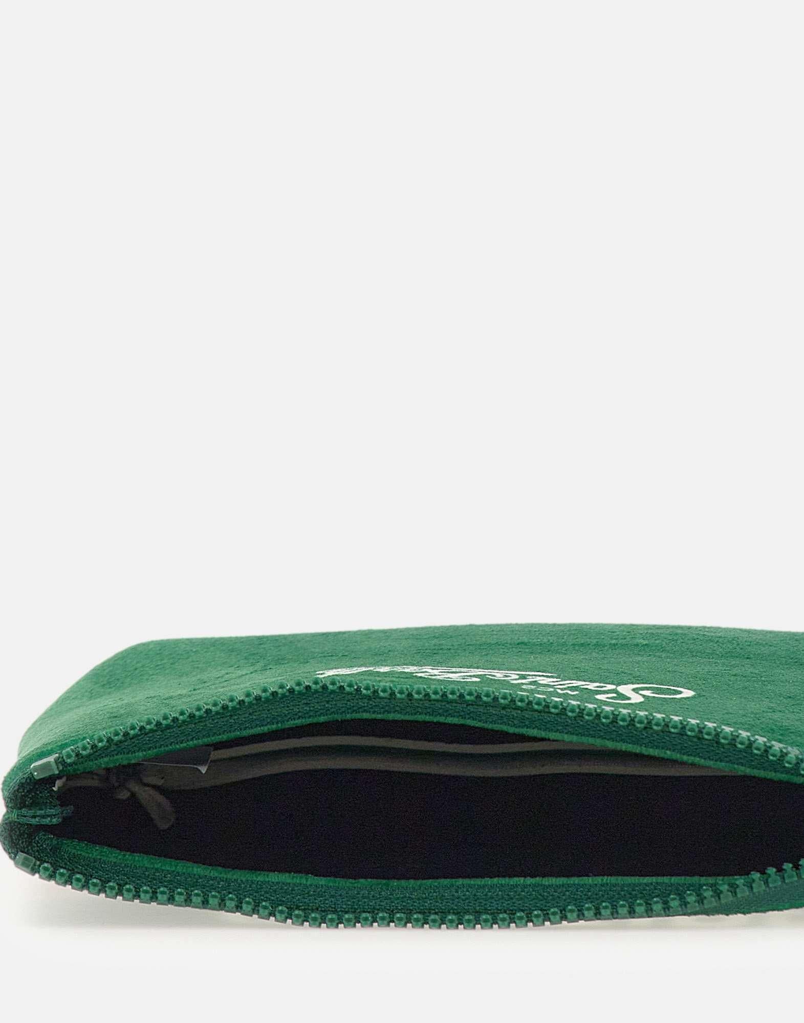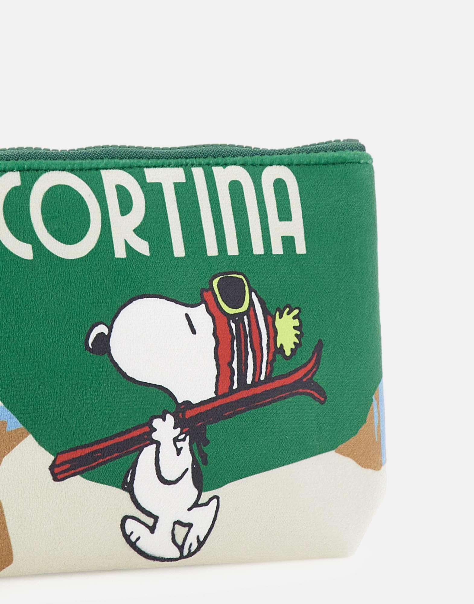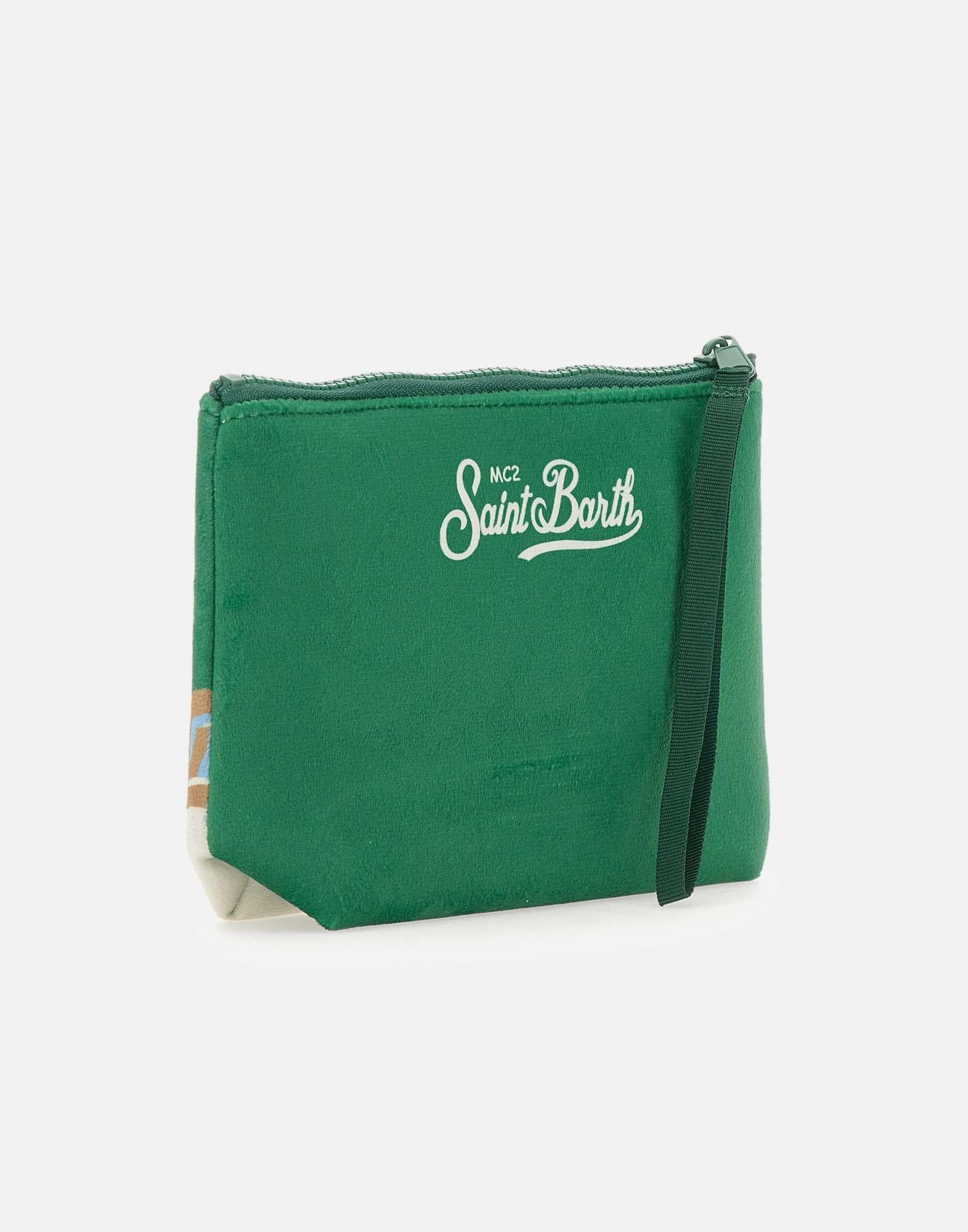 Green "Aline Snoopy Cortina" clutch bag, made of super soft velvet-effect fabric. Featuring contrasting logos on front and back and a top zip closure. An iconic and versatile accessory, perfect for adding a distinctive touch to any look. Dimensions: 22 x 16 x 7 cm.