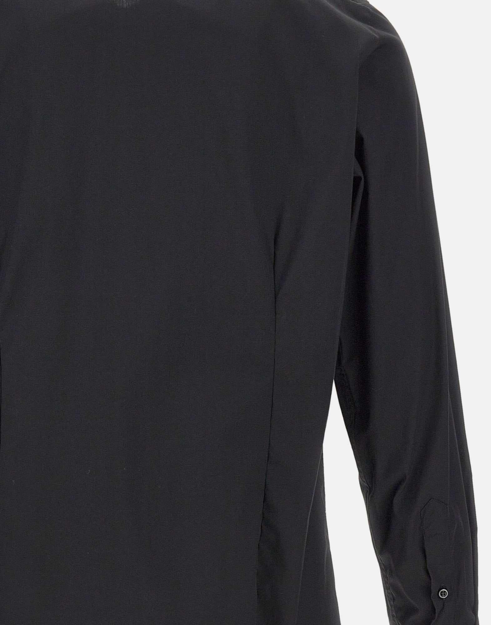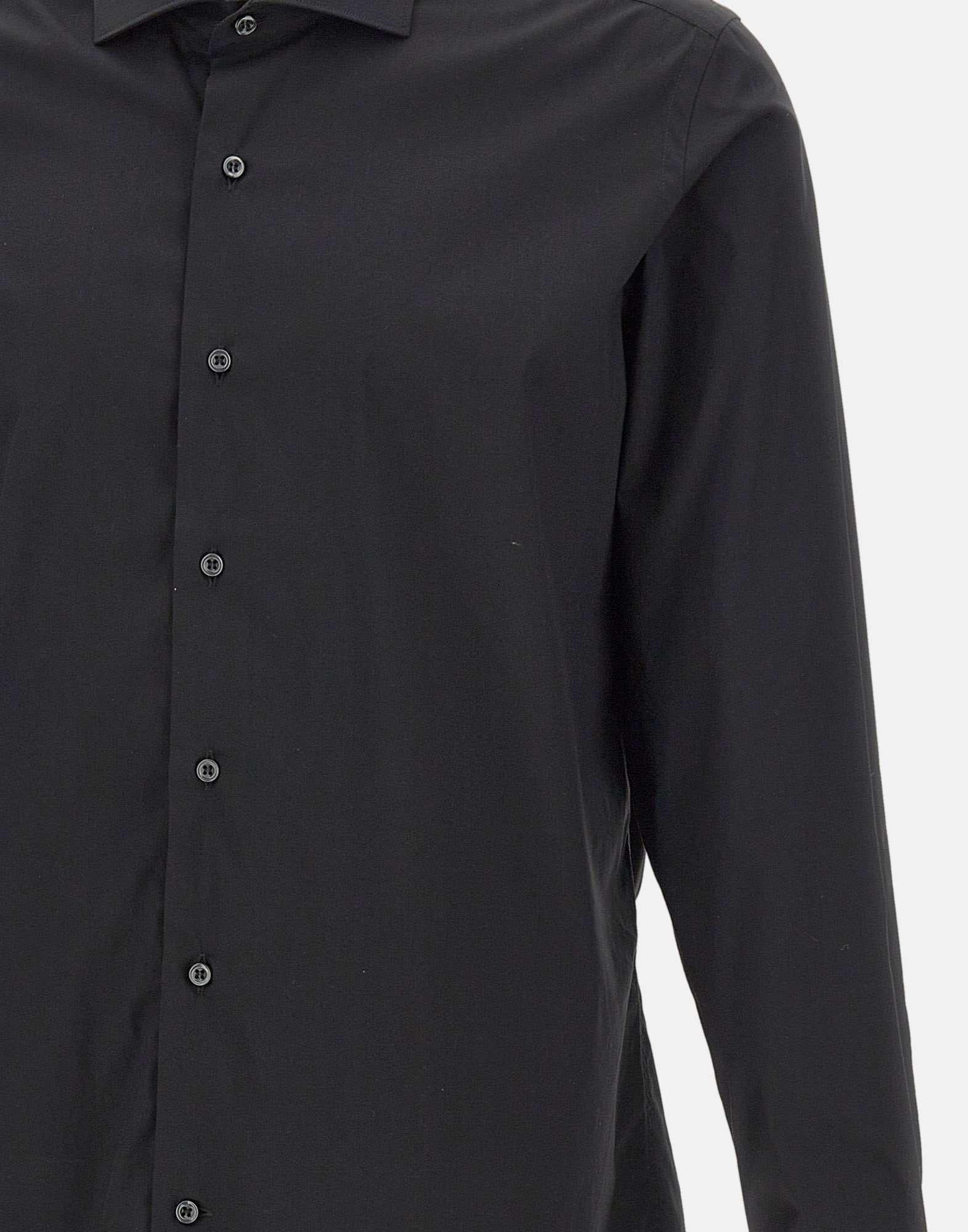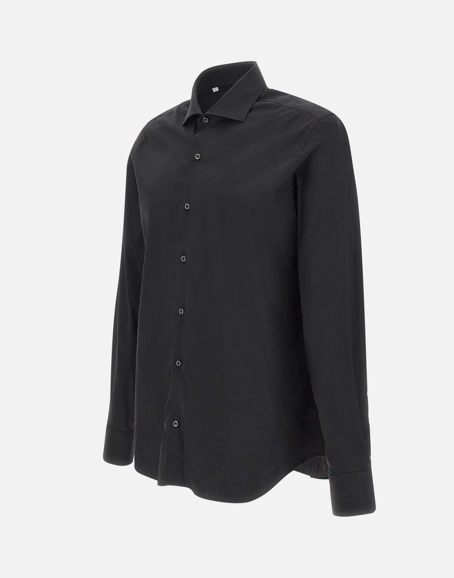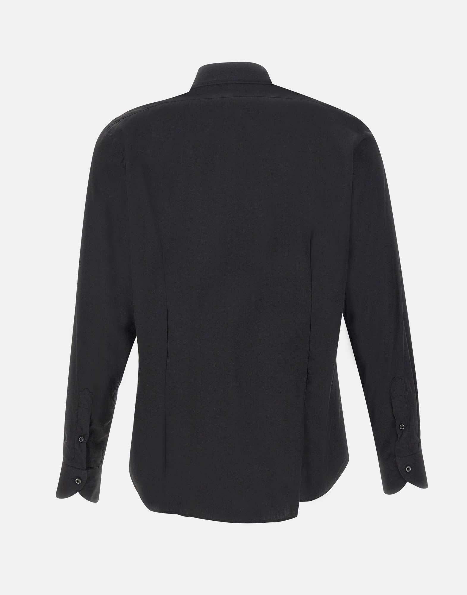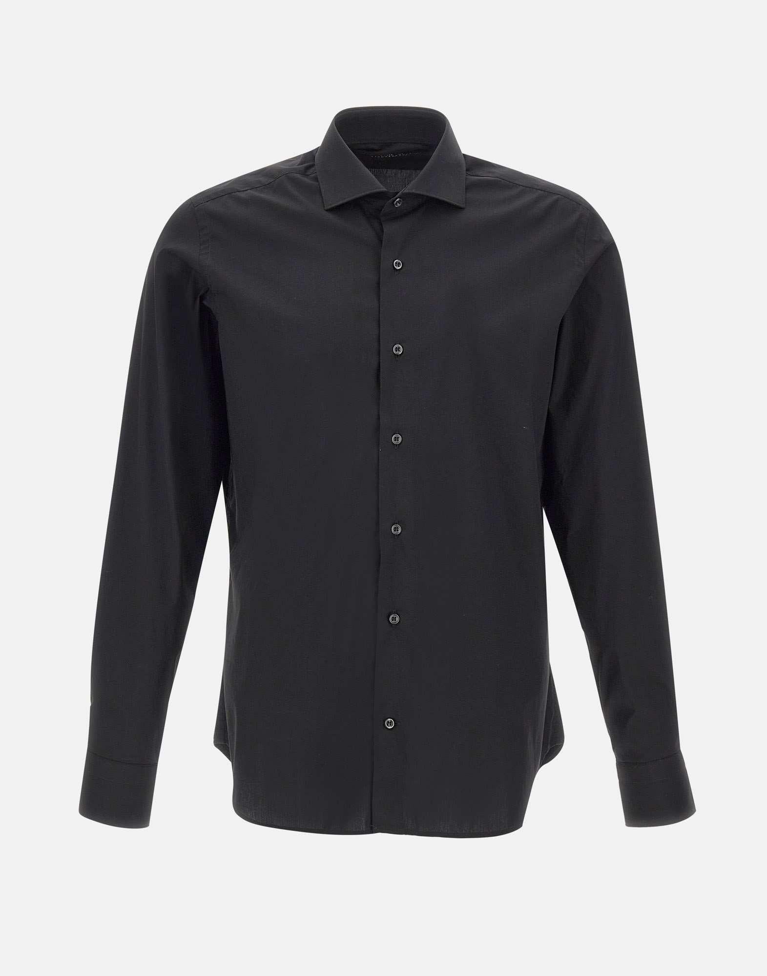 Marchesani men's "Bologna50" cotton-blend shirt in all-black. It features a classic collar with updated short points, long sleeves, a mother-of-pearl button closure, and cuffs with dual-use buttons. The tailor fit elegantly flatters the figure.