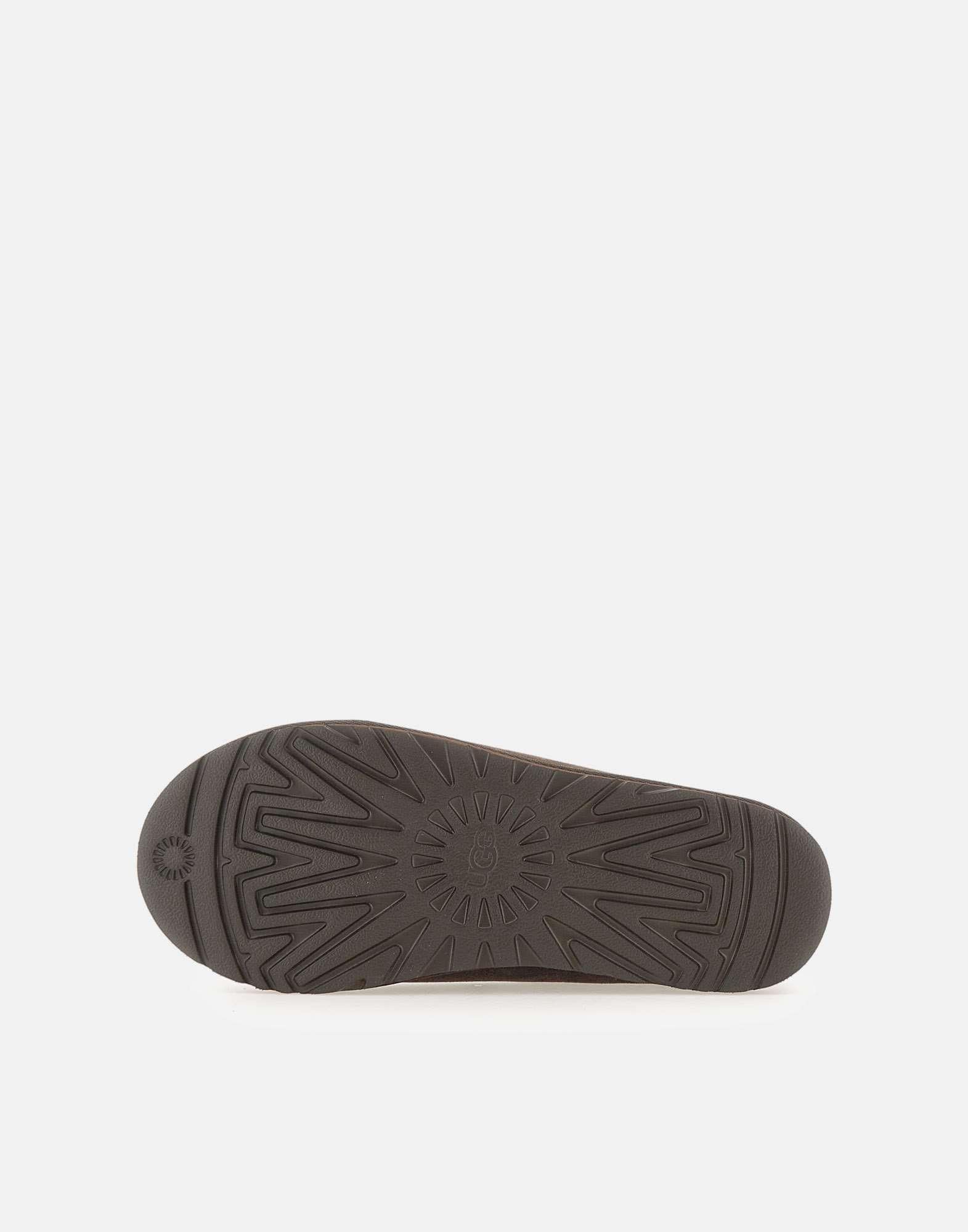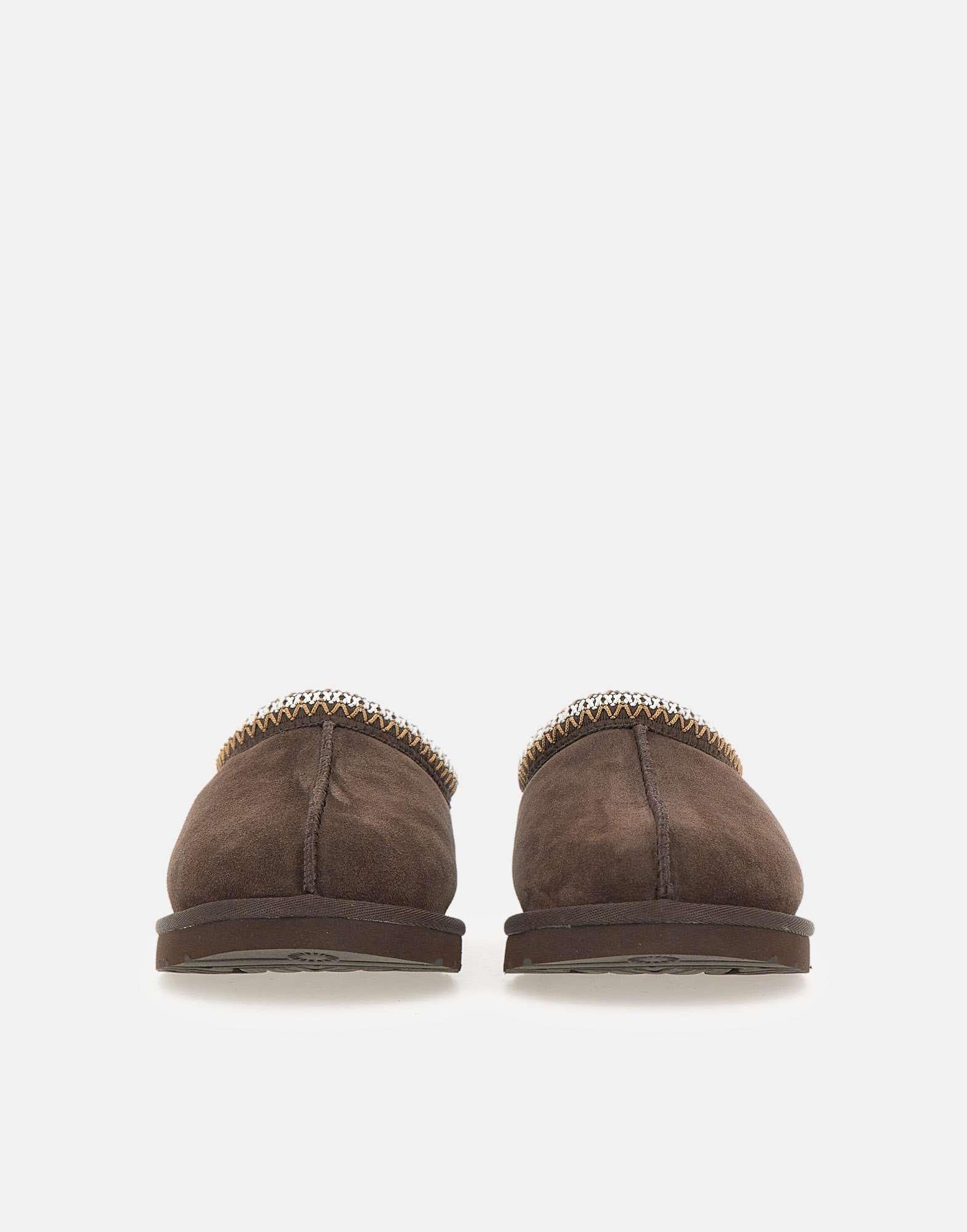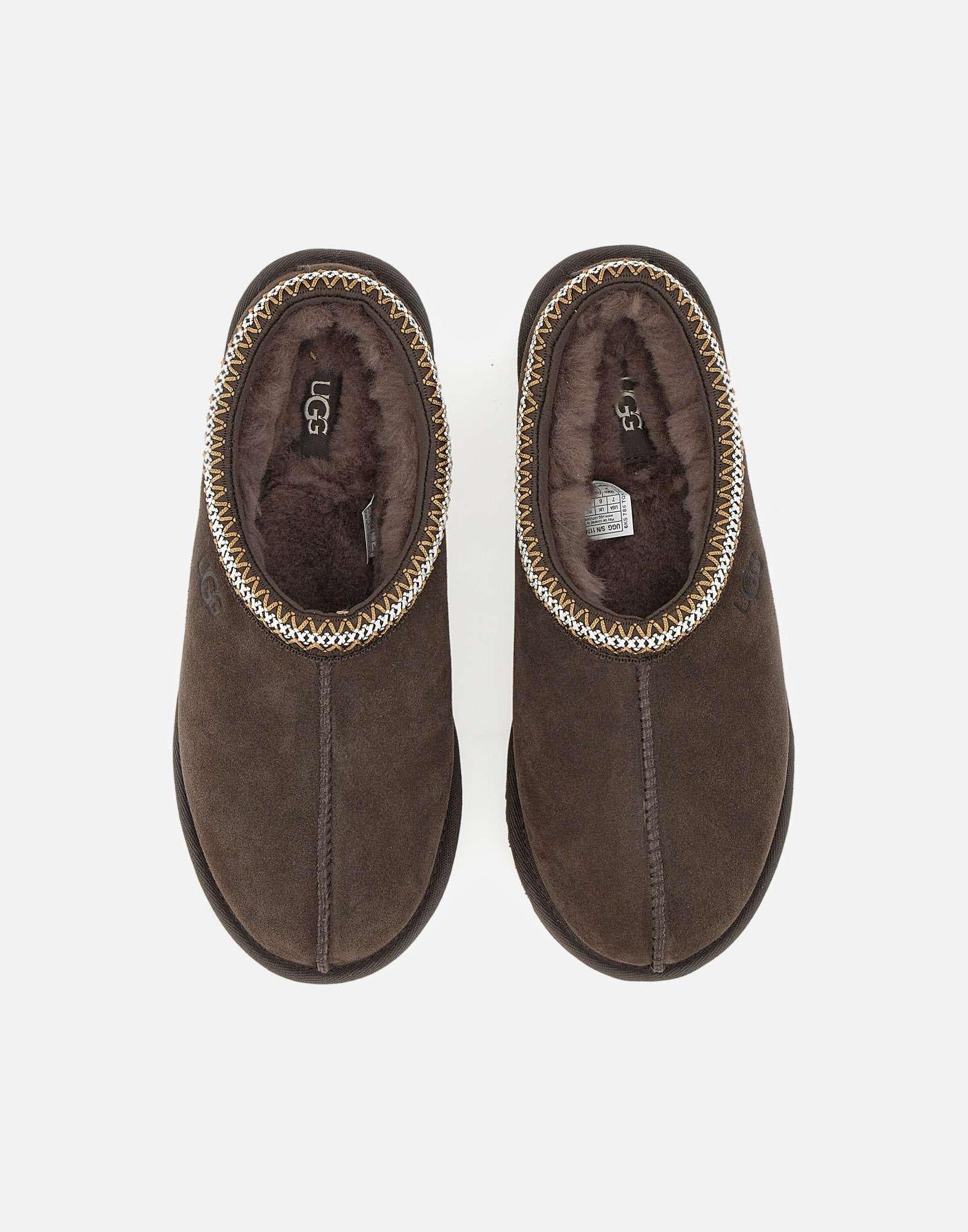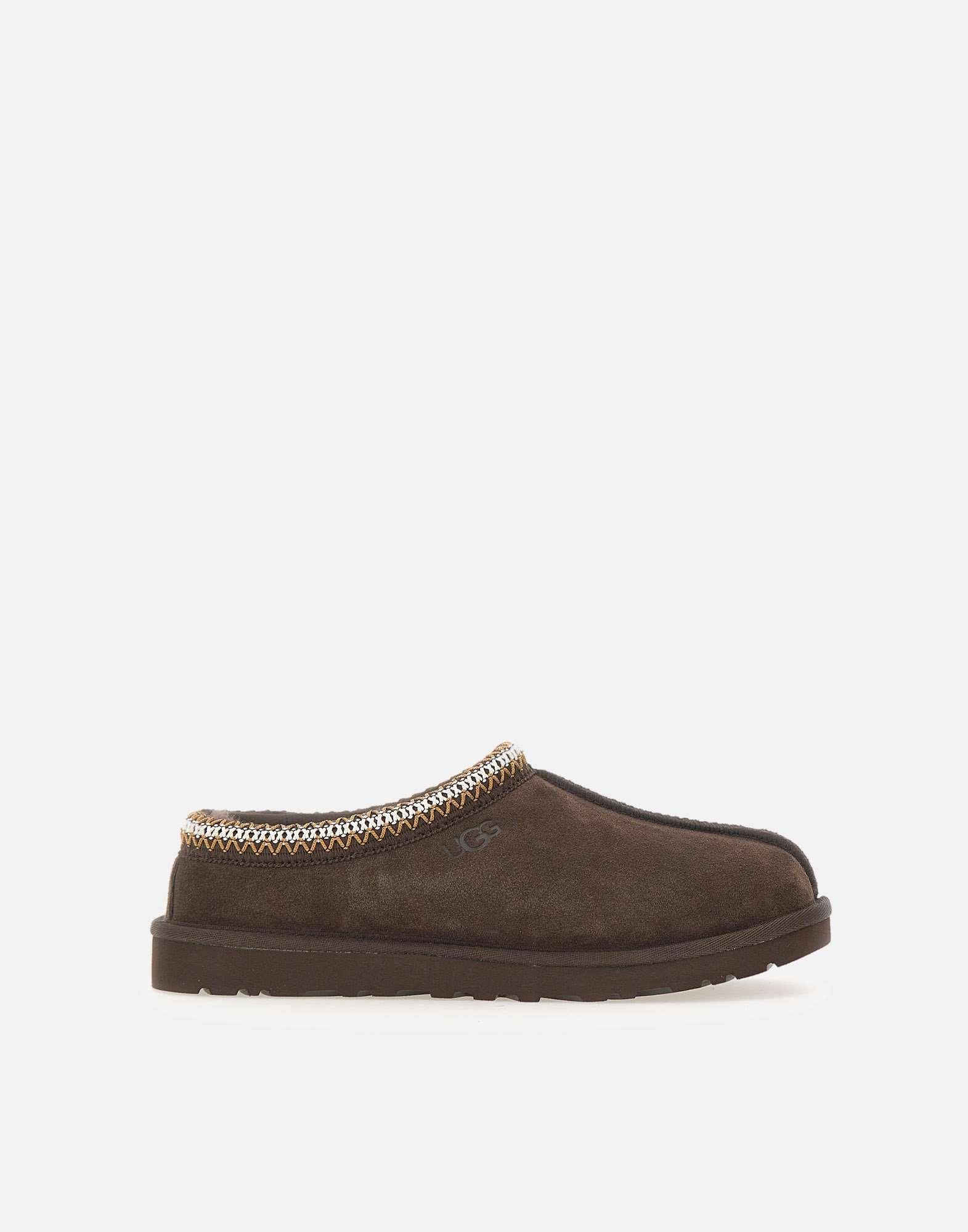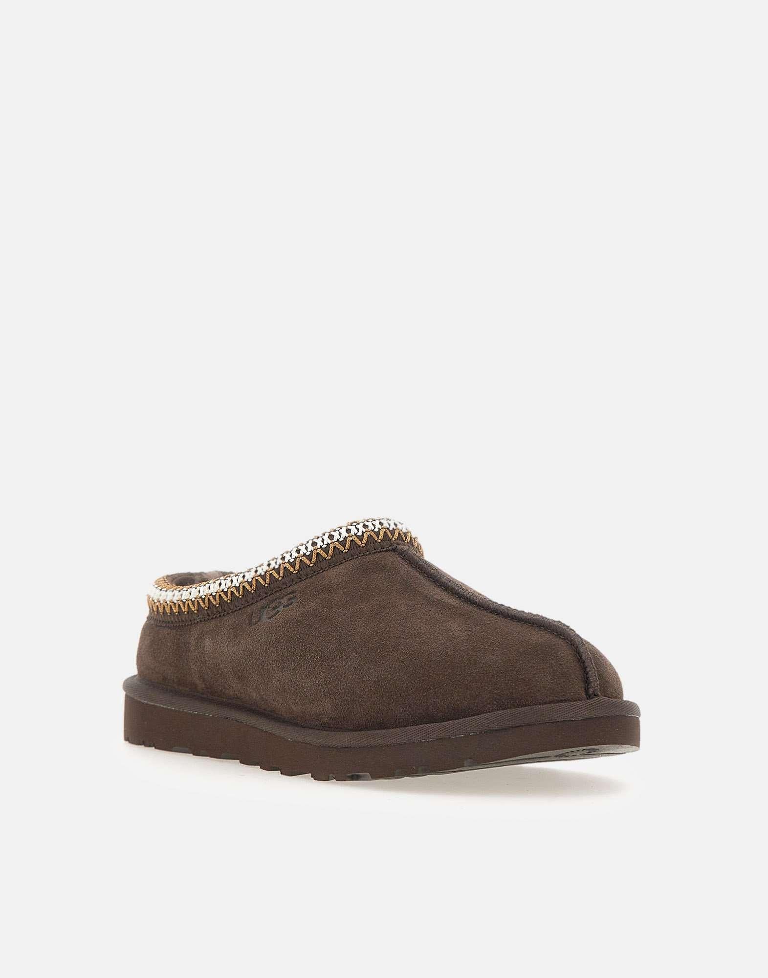Ugg men's "Tasman II" slippers, available in dark brown. The suede upper is embellished with the signature UGGbraid embroidery, made from 100% recycled polyester fibers. The 17mm sheepskin lining and insole ensure warmth and softness, while the foam insole and sugarcane-derived EVA outsole ensure lightweight comfort. Finished with a heat-embossed Ugg® logo. Regular fit. Size US 7 corresponds to EU/IT 40. See Ugg Unisex Footwear USA chart for the ideal size.