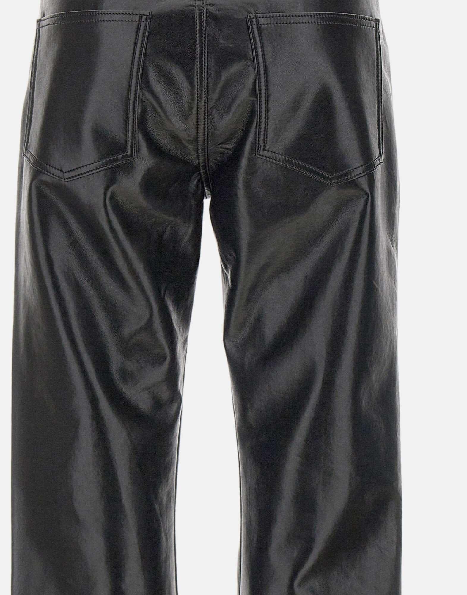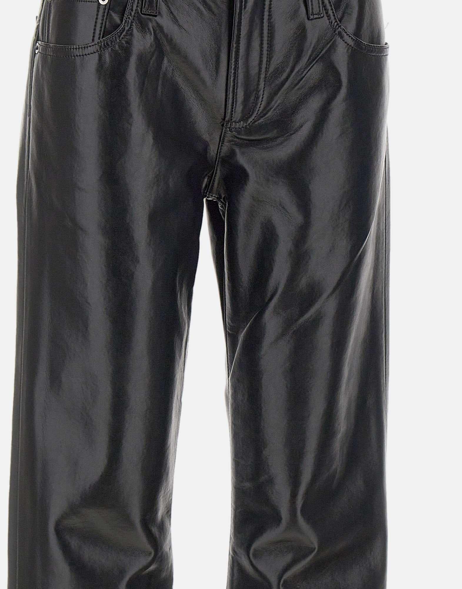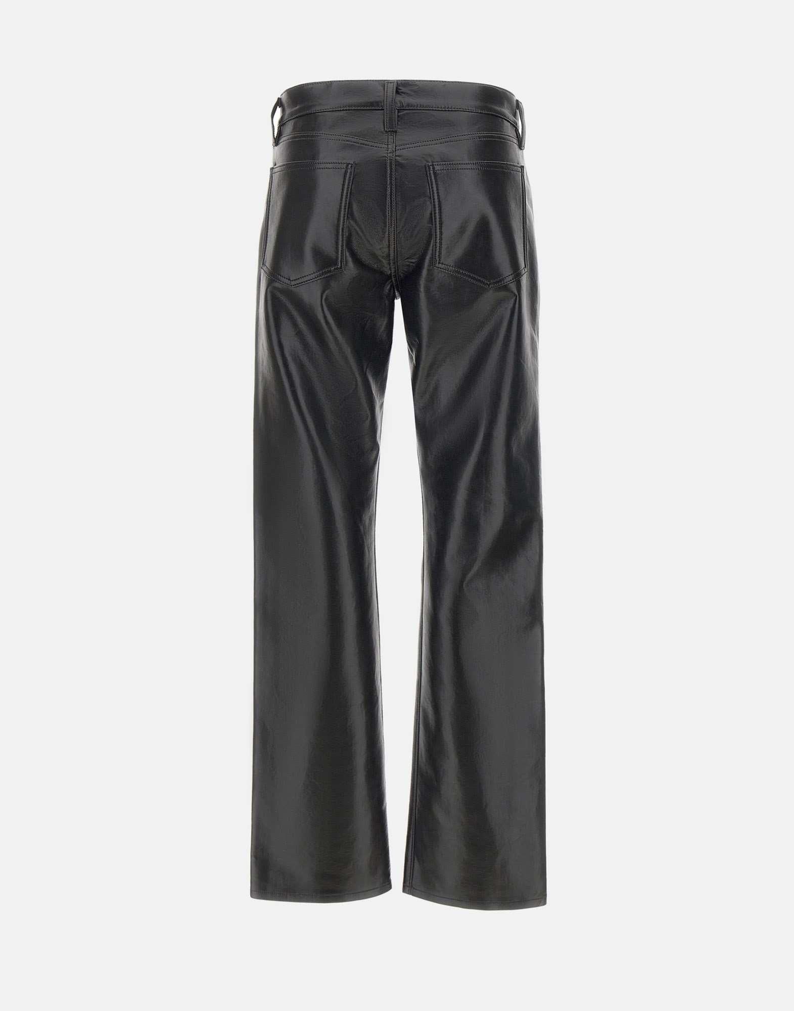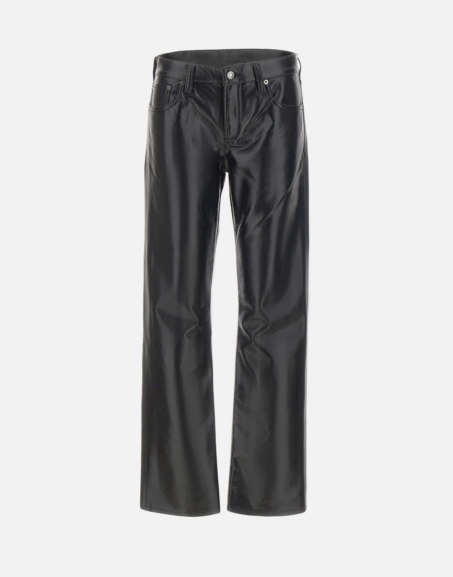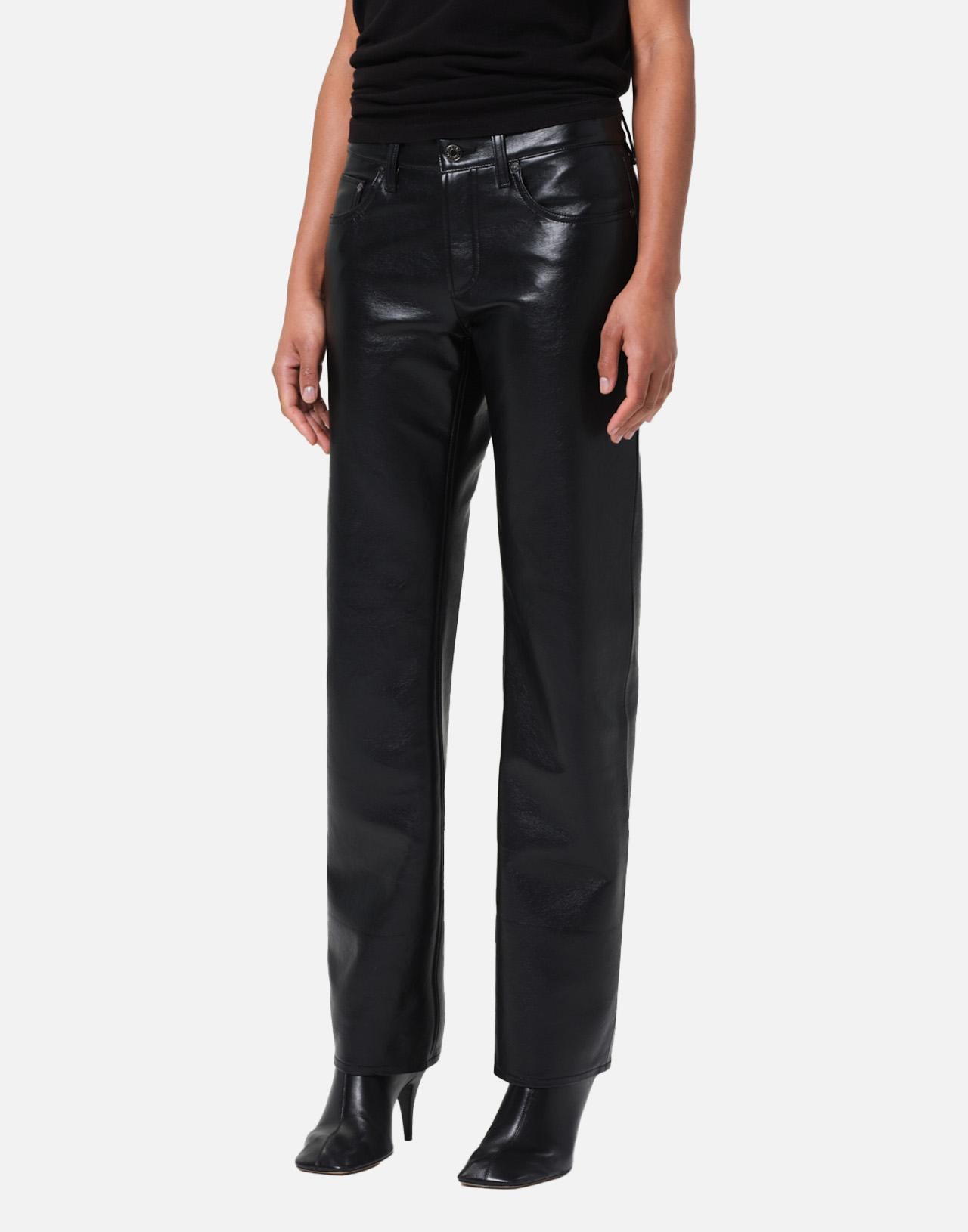 Agolde "Detox Low Rise Slim" in soft matte black leather, a must-have for a contemporary and bold style. Featuring a low waist, belt loops, and a slim straight-leg silhouette, these five-pocket jeans combine modern design and an impeccable fit. Crafted from stretch fabric, they offer maximum comfort and freedom of movement, maintaining a true-to-size fit. Product details: Low rise: 9 1/4". Inseam: 32". Leg opening: 16 1/2" (Size 27). Zip and button closure. Regular fit