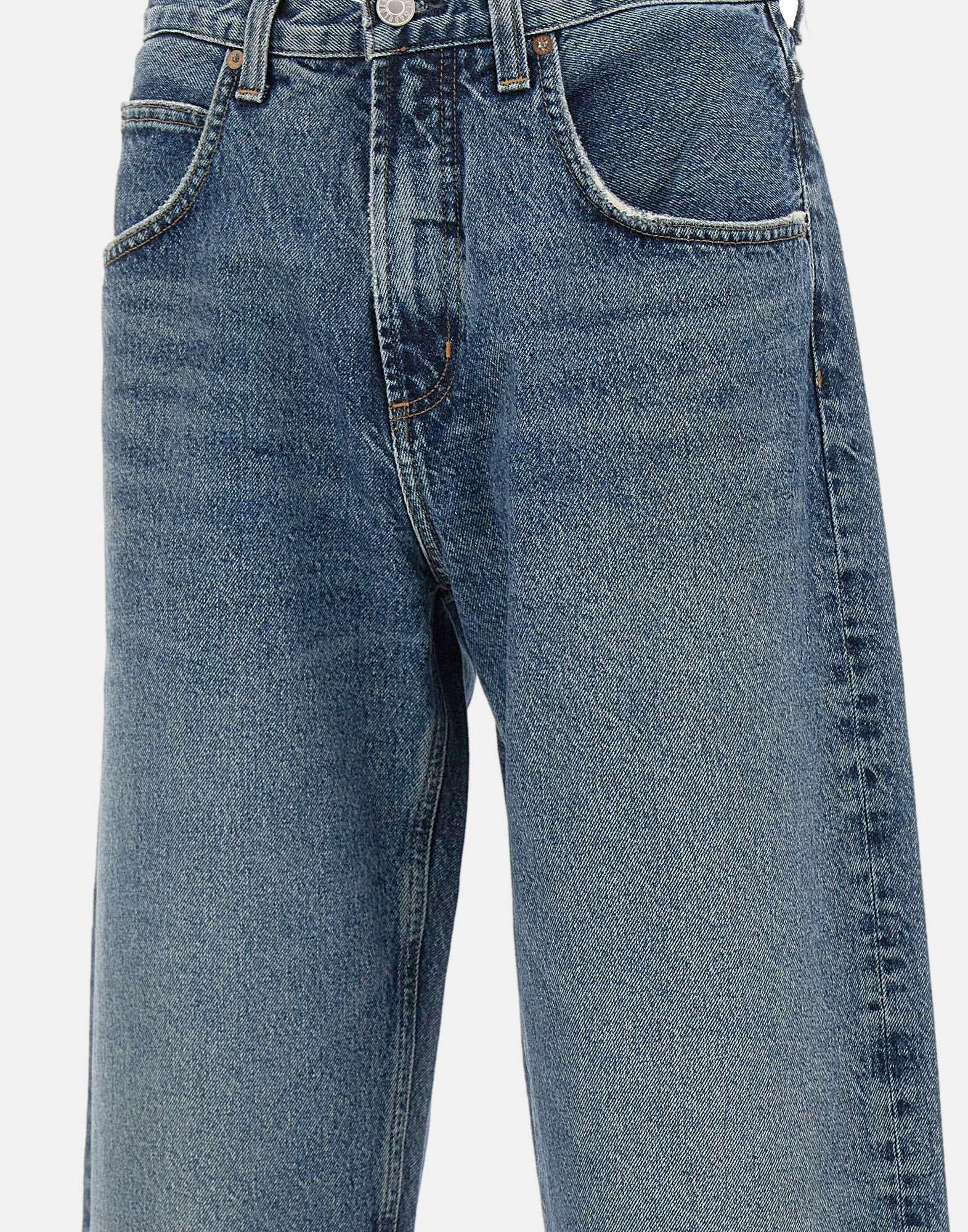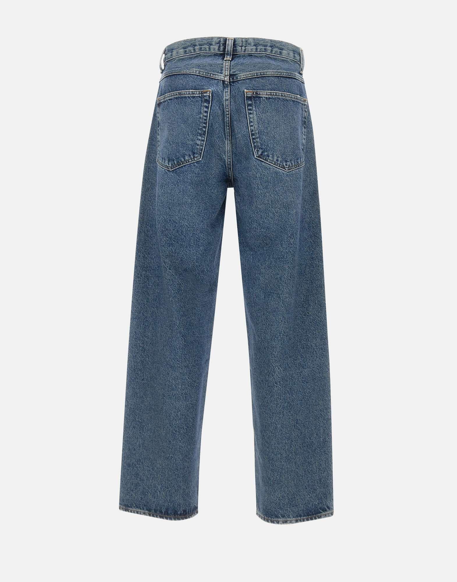 The "Fusion Jean Baggy Taper Arcadia" by Agolde blends vintage style with a contemporary silhouette. Crafted from blue denim with a distressed wash, they feature a high waist with belt loops and slightly distressed details that add an authentic, worn-in feel. The style features a classic five-pocket design, a zip and logo button closure, and a tapered fit: wide on the thigh and gradually tapering towards 22 cm hem, for a baggy yet feminine look. Ideal for those seeking jeans with a relaxed yet well-defined look.