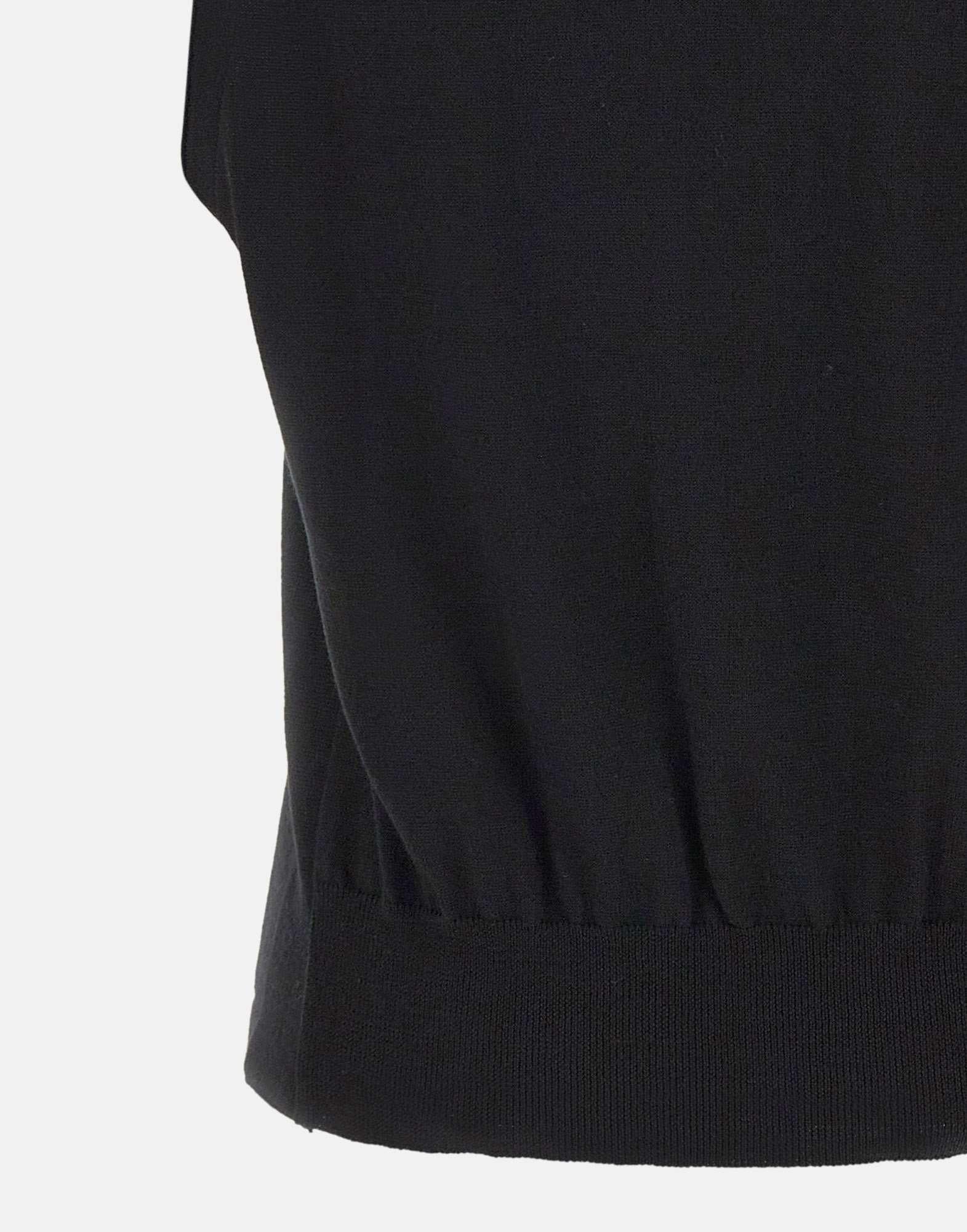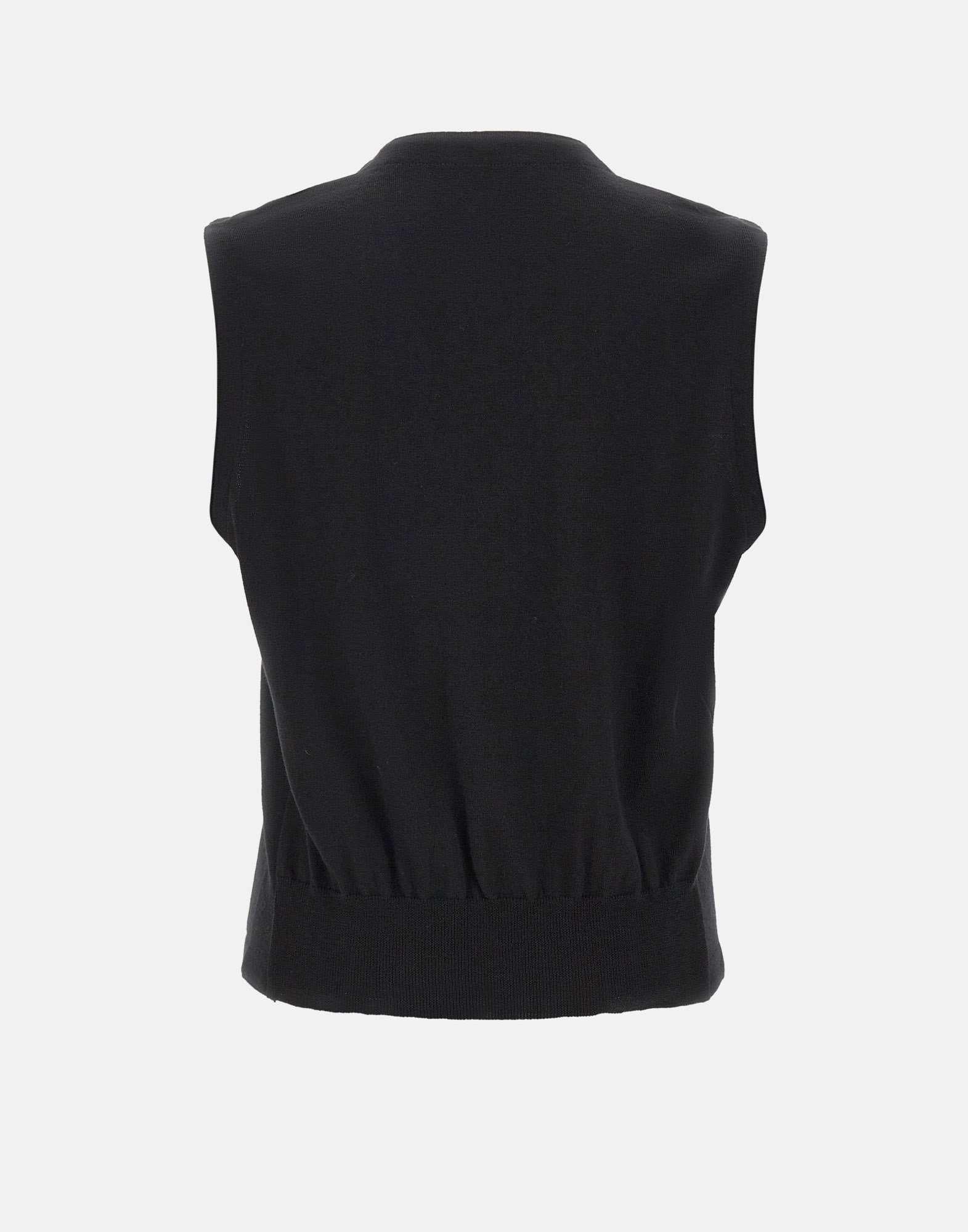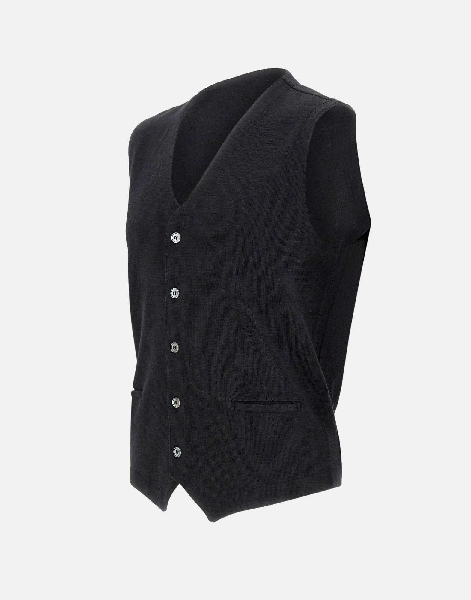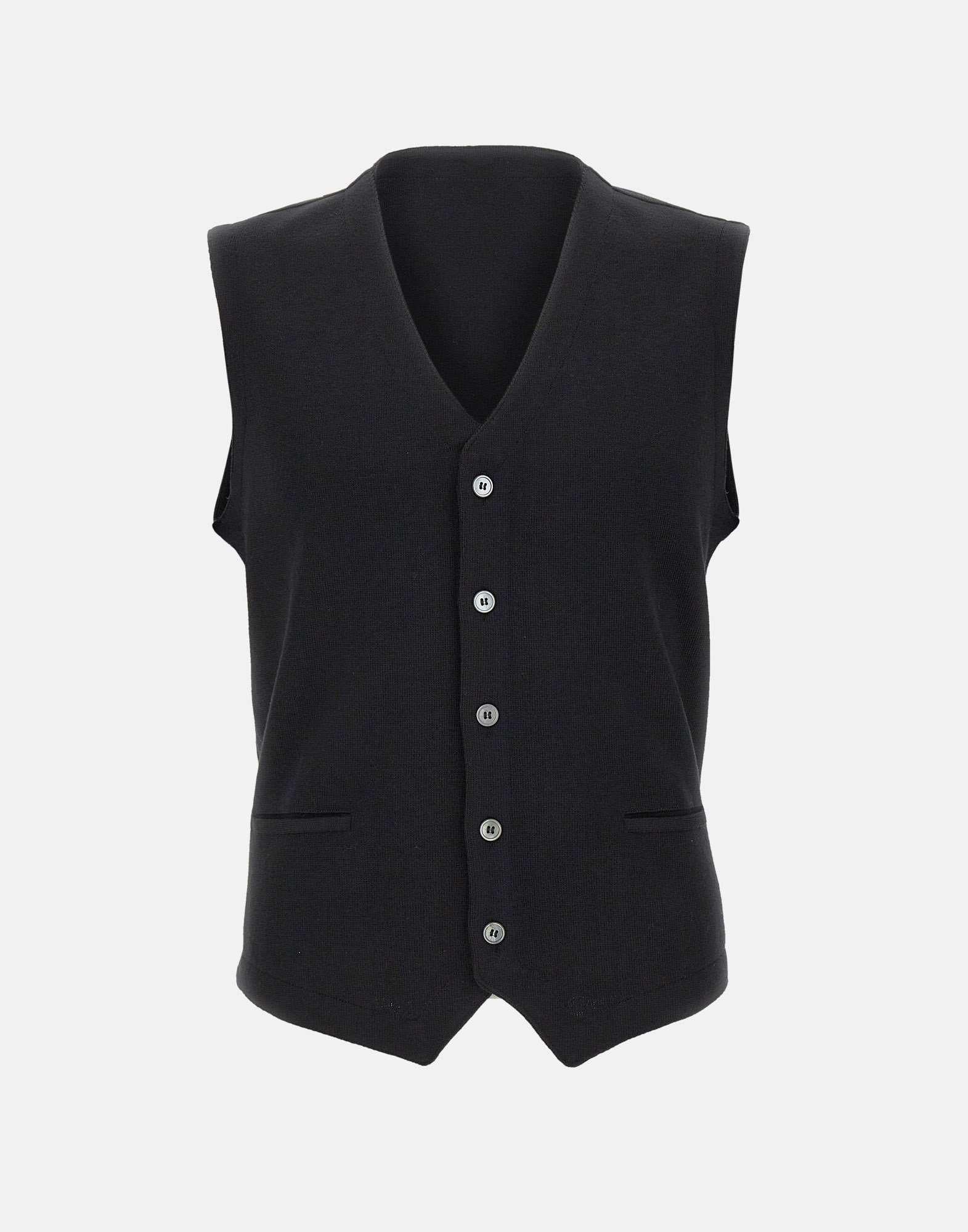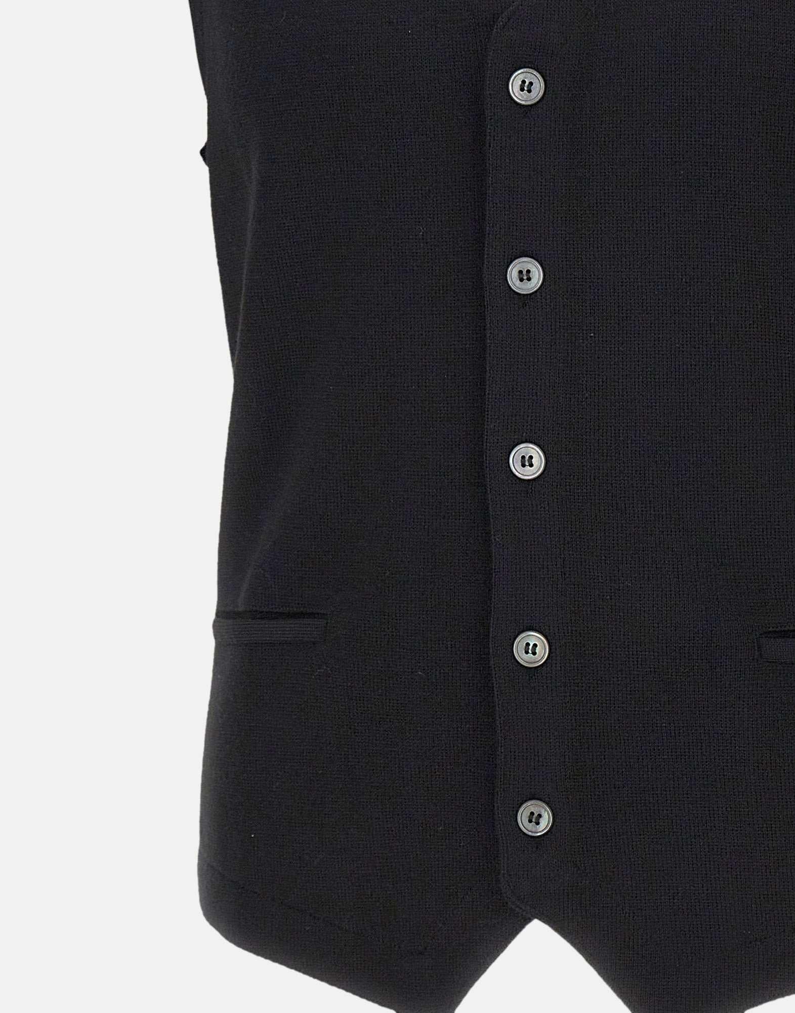 Discover elegance of Gran Sasso men's sleeveless cardigan, crafted from extra-fine merino wool with fibers less than 19.5 microns for exceptional softness and comfort. The black color lends a refined and versatile style, ideal for casual or formal looks. Featuring a mother-of-pearl button closure, front welt pockets, and a regular fit, this cardigan is synonymous with Made in Italy craftsmanship.