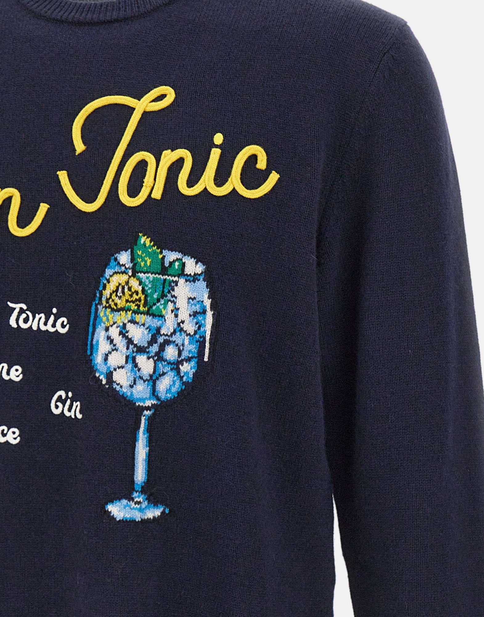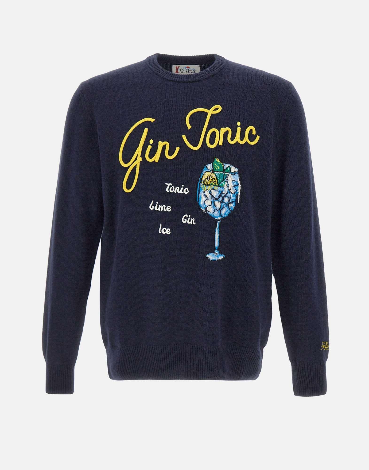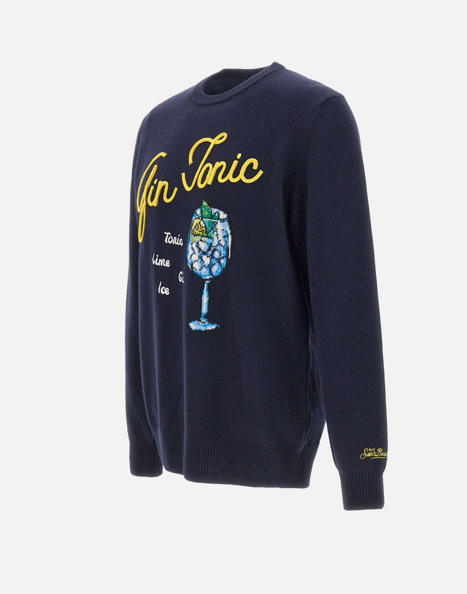 Mc2 Saint Barth "Heron Drink Gin" To Après Ski, a blue sweater made of a soft, warm wool and cashmere blend, ideal for winter parties. It features long sleeves, a classic crew neck, and ribbed cuffs for a comfortable fit. The large contrasting logo on the front and cuff adds an iconic touch and completes the design. Regular fit