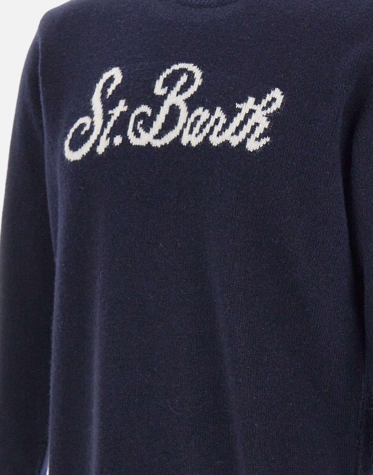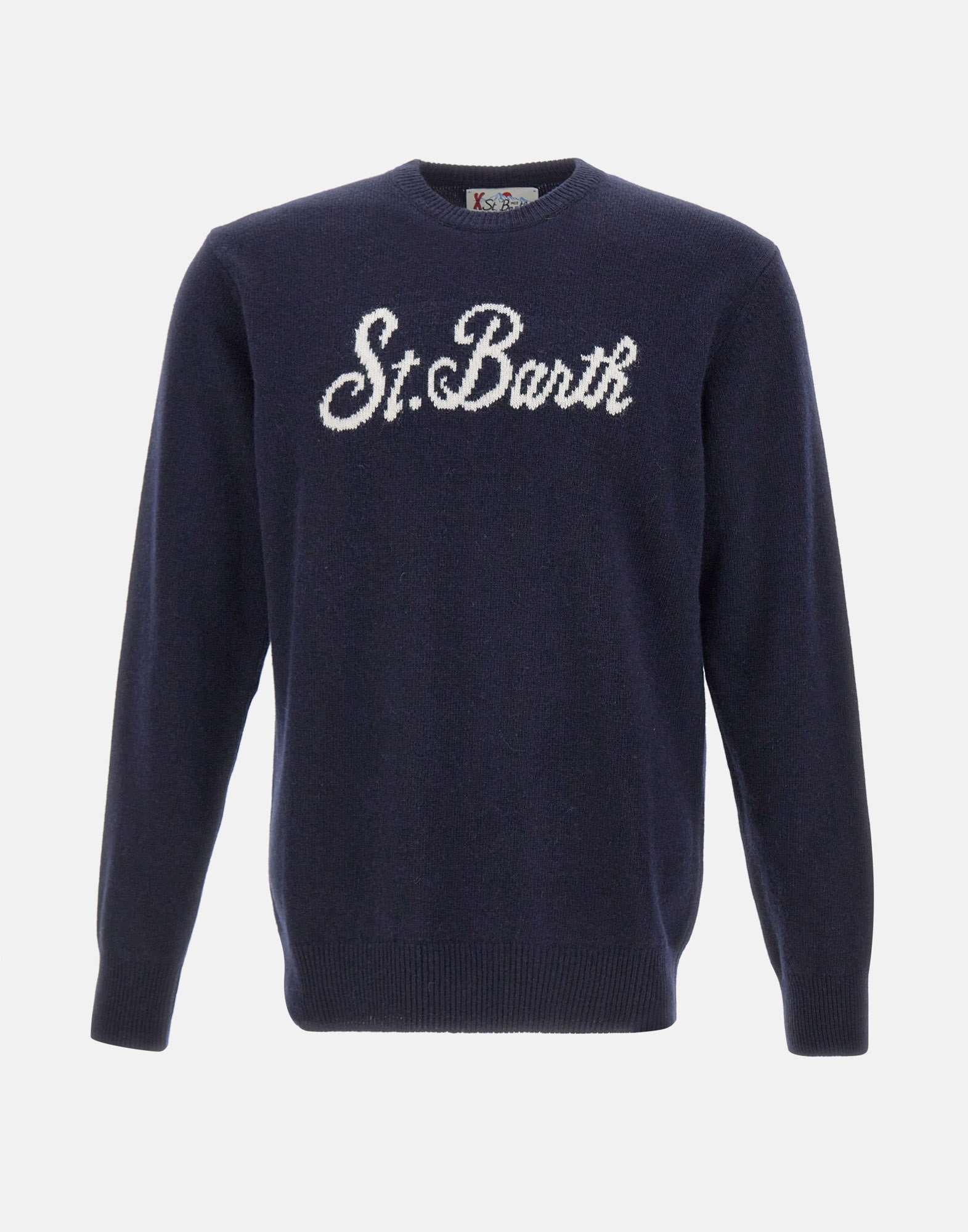 The Mc2 Saint Barth "Heron Light SB Bold" men's sweater in a soft blue wool and cashmere blend, with an après-ski feel. It features a crew neck, long sleeves, and ribbed cuffs for snug comfort. The contrasting embroidery on the front adds personality. The regular fit ensures comfort and freedom of movement. A warm and refined piece, Made in Italy, perfect for the winter season.