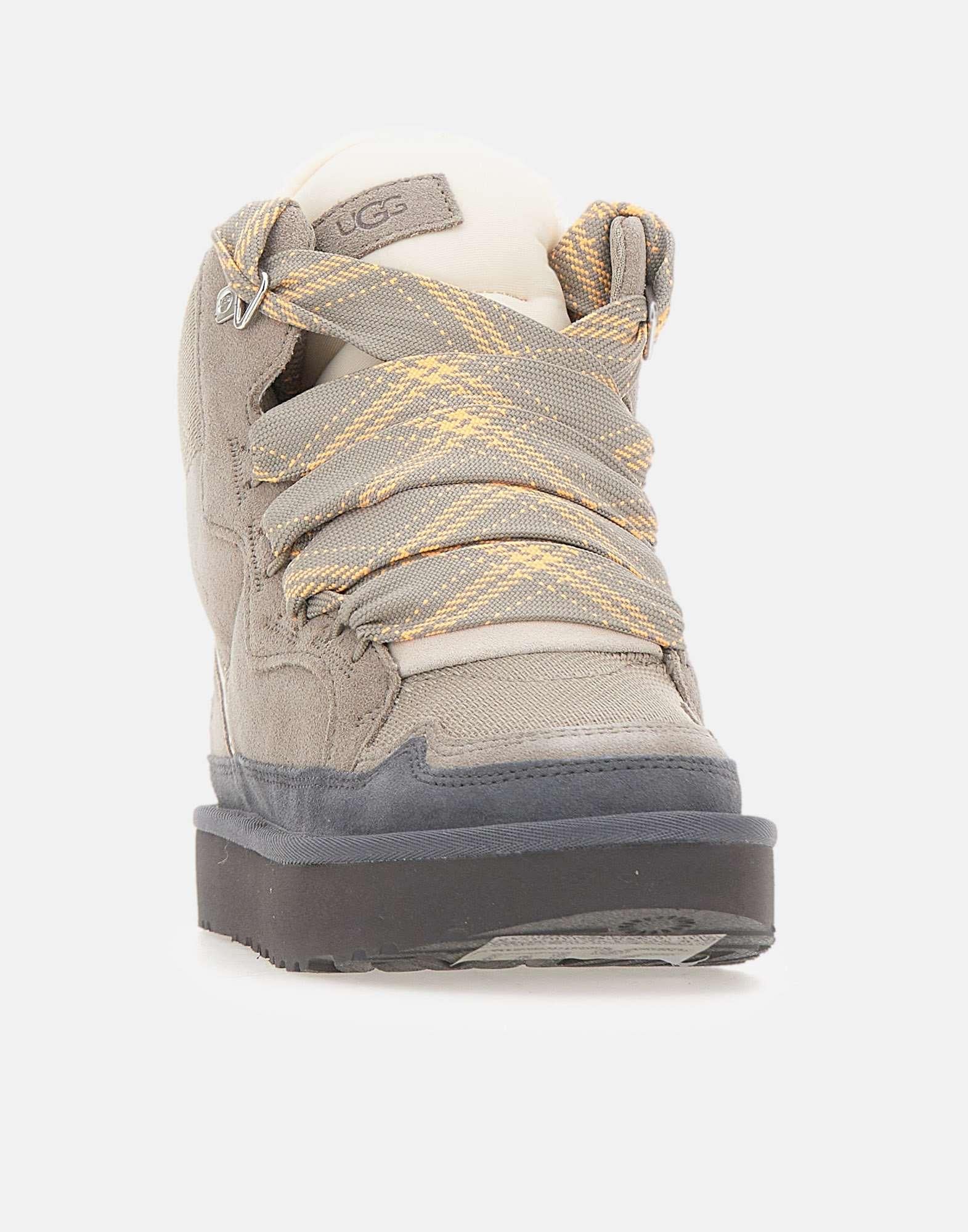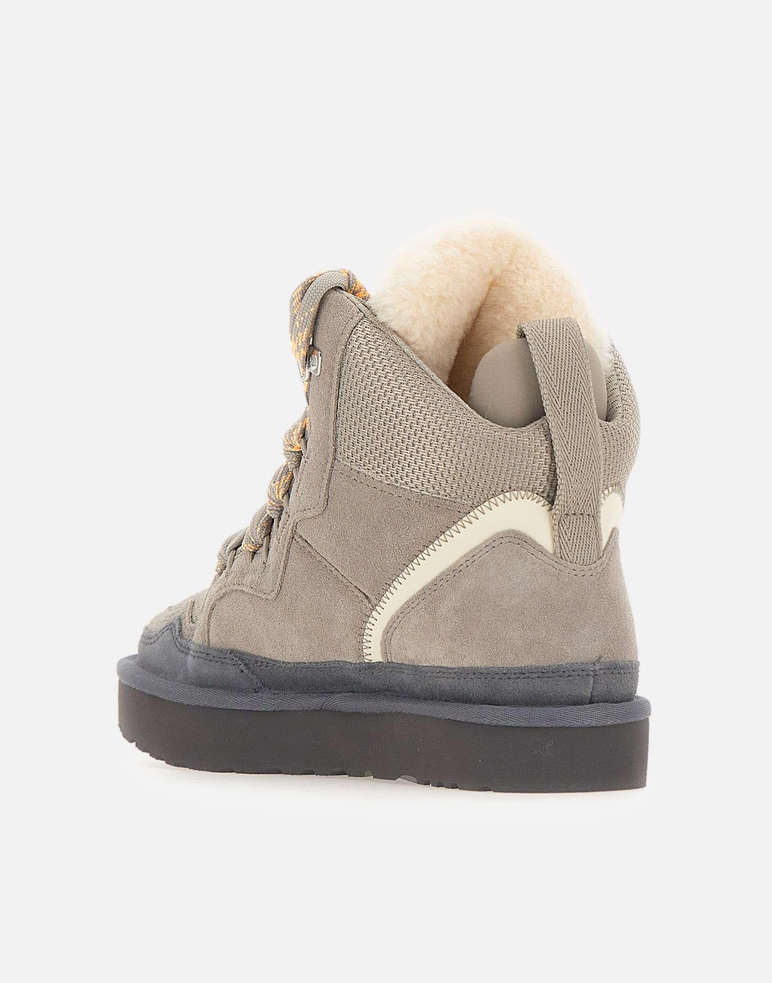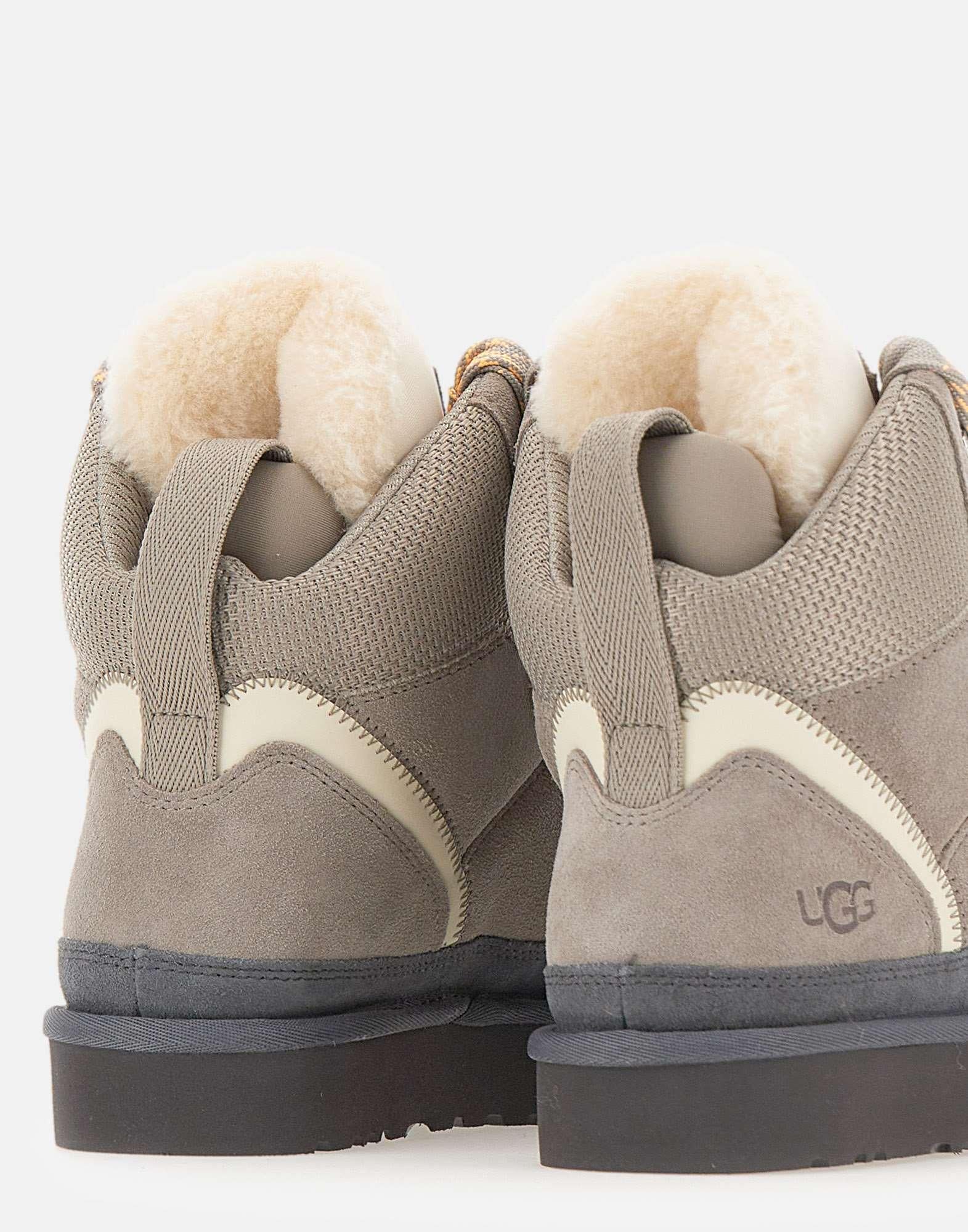 UGG "Highmel" sneakers in grey, featuring suede and recycled ballistic canvas mesh upper. Designed with heel fabric strap, padded collar, oversized tongue, and UGG logo patch. Flat two-tone laces made from 100% UNIFI recycled polyester fibers. Lined and cushioned with UGGplush (regenerated wool and lyocell) for superior comfort. EVA SugarSole outsole with embossed UGG logo. True to size fit. Size US 8 corresponds to EU/IT 39. Convert your size using the UGG WOMEN'S FOOTWEAR USA size chart.
