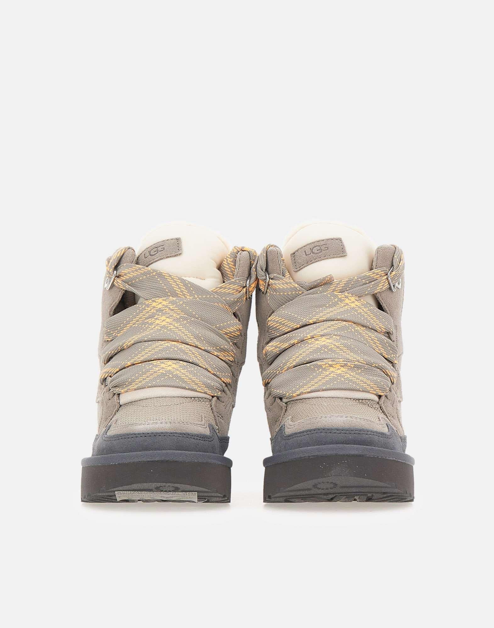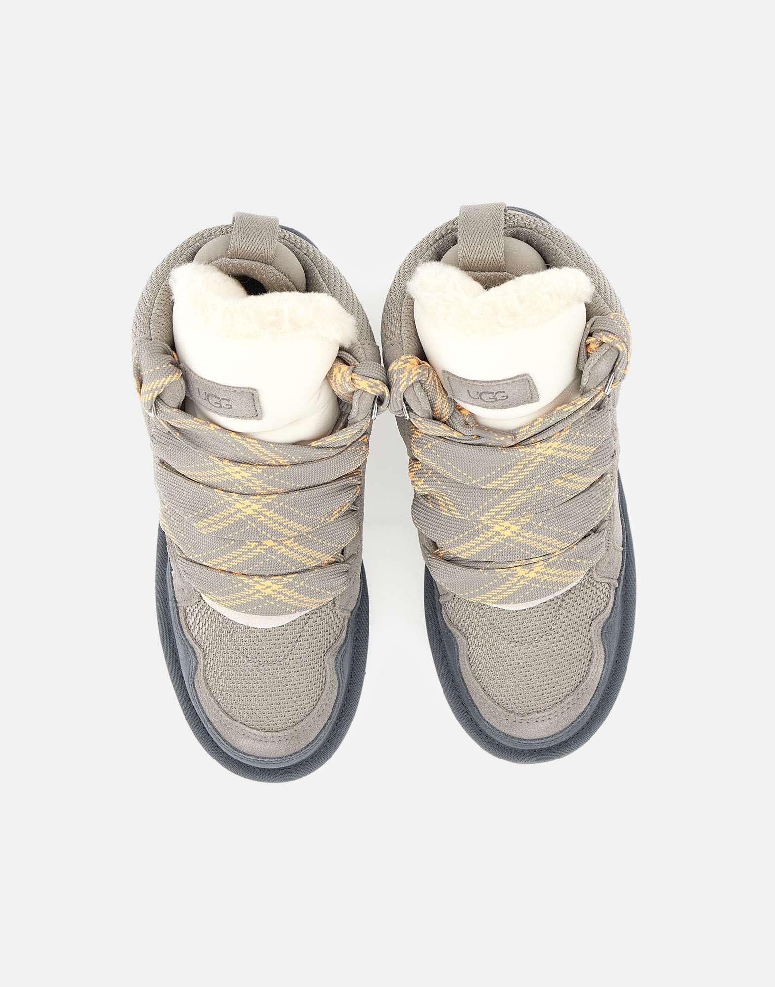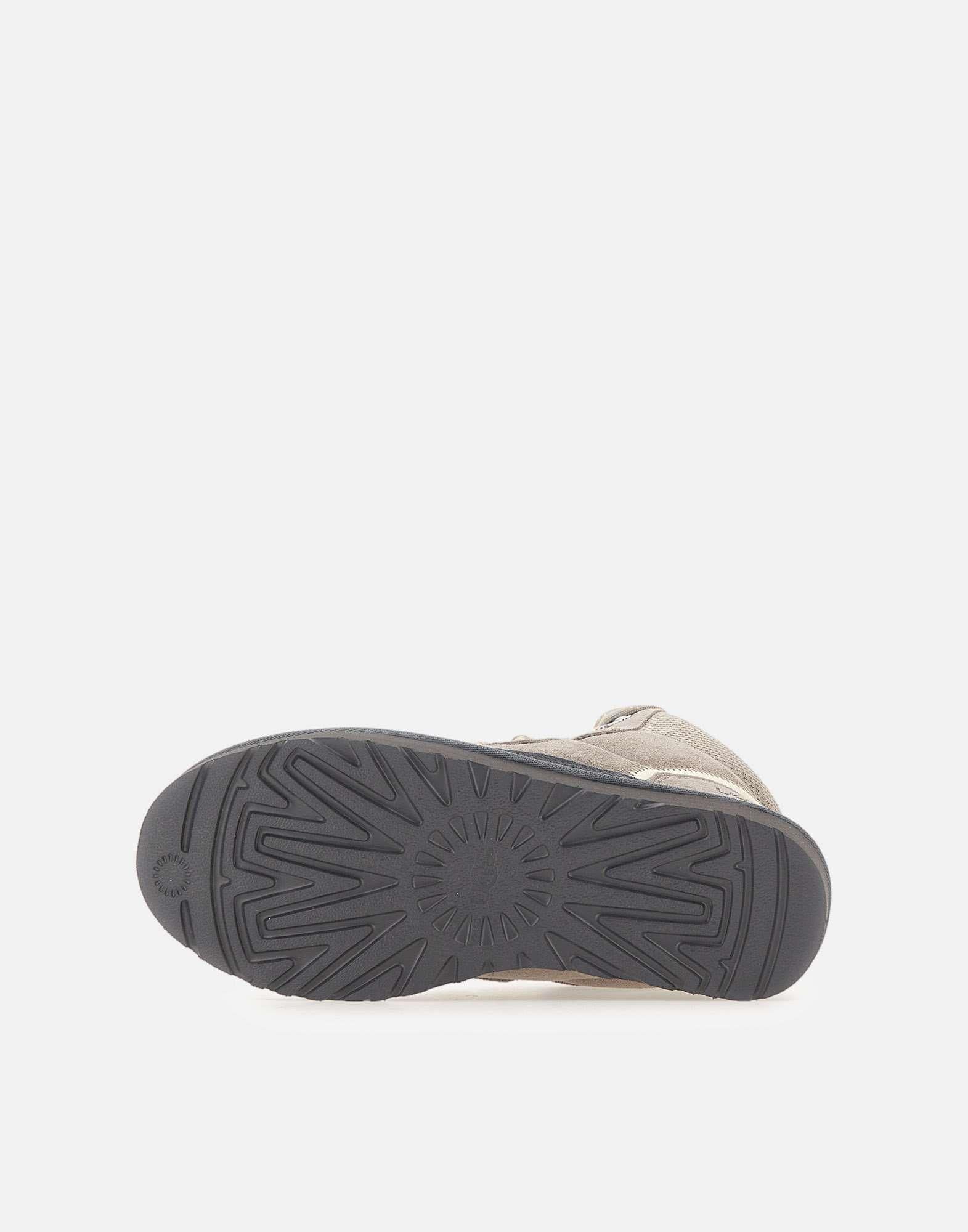 UGG "Highmel" sneakers in grey, featuring suede and recycled ballistic canvas mesh upper. Designed with heel fabric strap, padded collar, oversized tongue, and UGG logo patch. Flat two-tone laces made from 100% UNIFI recycled polyester fibers. Lined and cushioned with UGGplush (regenerated wool and lyocell) for superior comfort. EVA SugarSole outsole with embossed UGG logo. True to size fit. Size US 8 corresponds to EU/IT 39. Convert your size using the UGG WOMEN'S FOOTWEAR USA size chart.