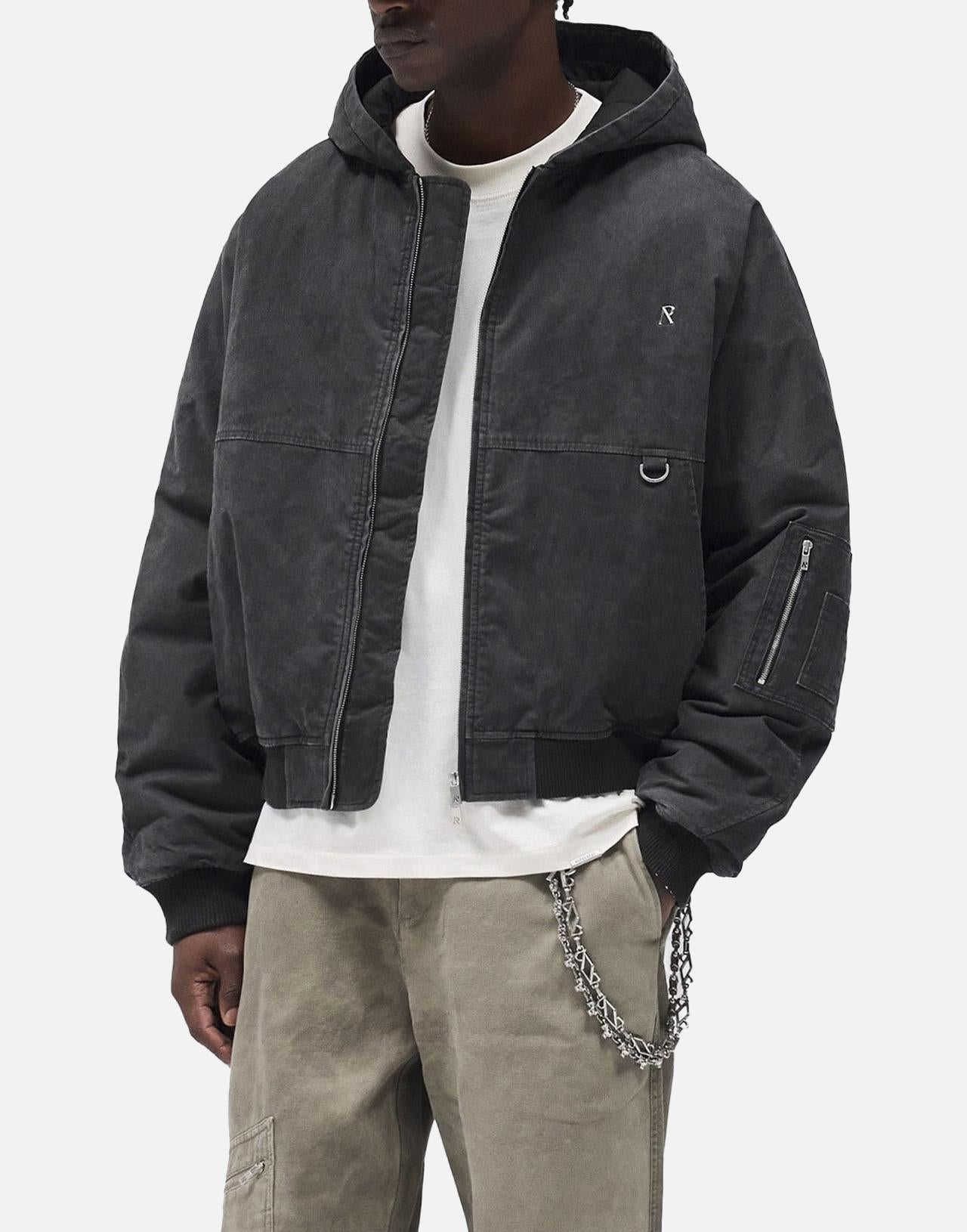 Men’s Represent "Hooded Bomber", crafted in stretch cotton with a peach-touch stone washed black finish. The design includes a hood, two-way zip fastening, and four layered side welt pockets, along with an additional sleeve pocket. Signature details include silver-tone hardware, rib-knit trims, cotton lining, and polyester padding for comfort and durability. A small metal initial logo at front completes the piece. Relaxed fit.
