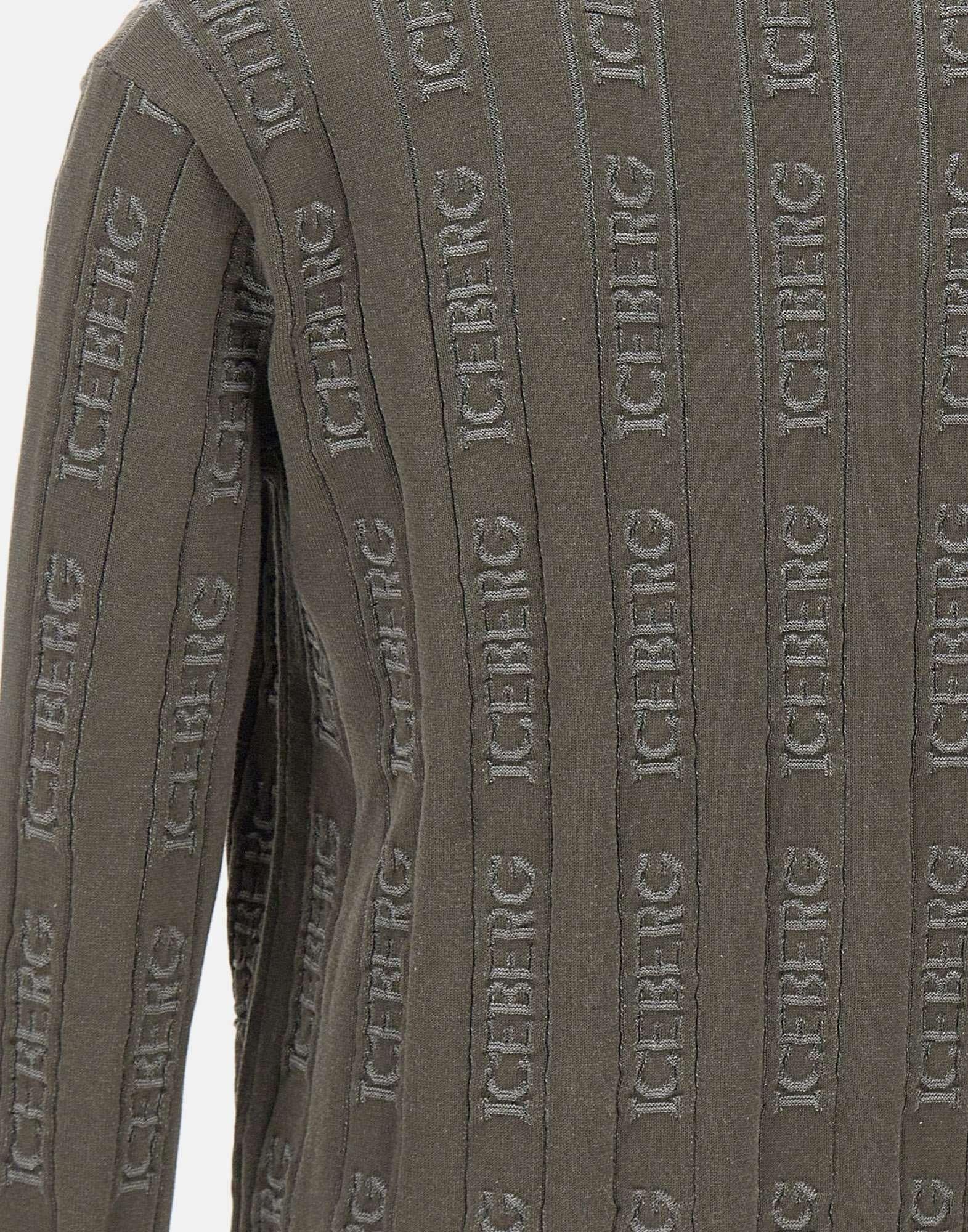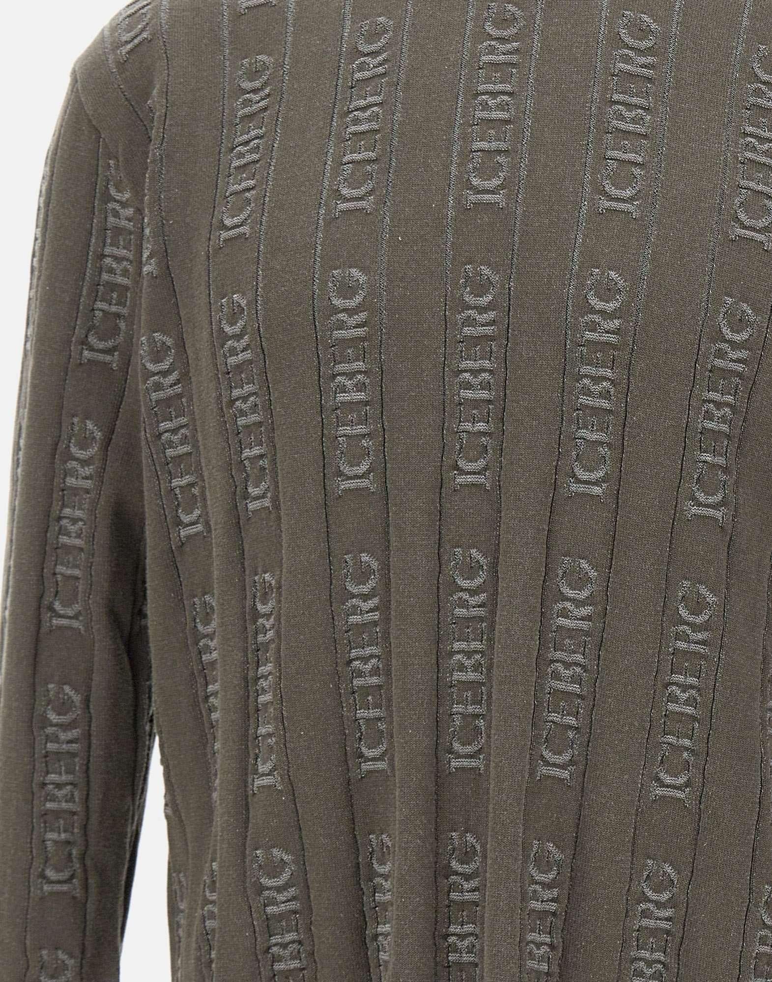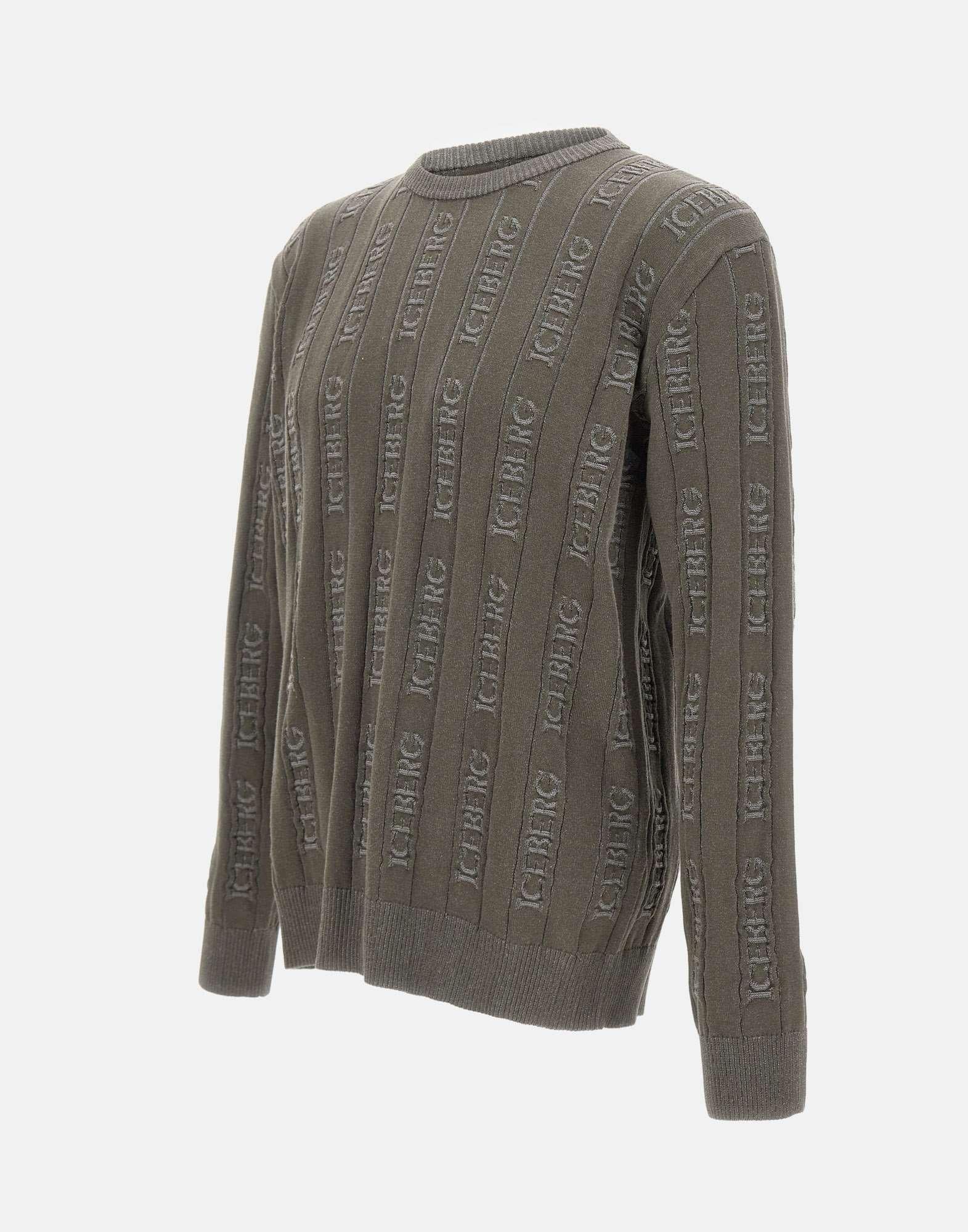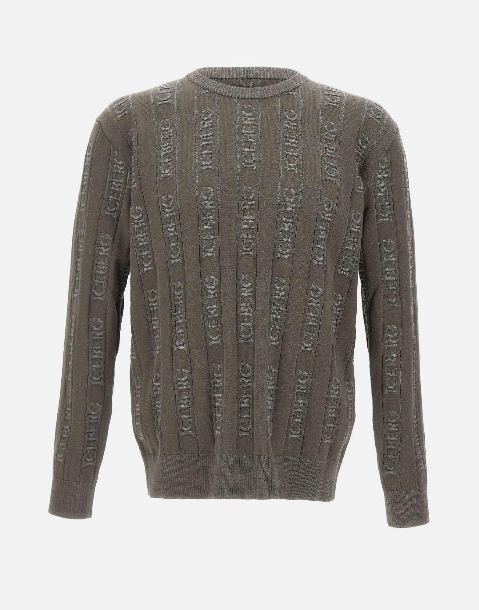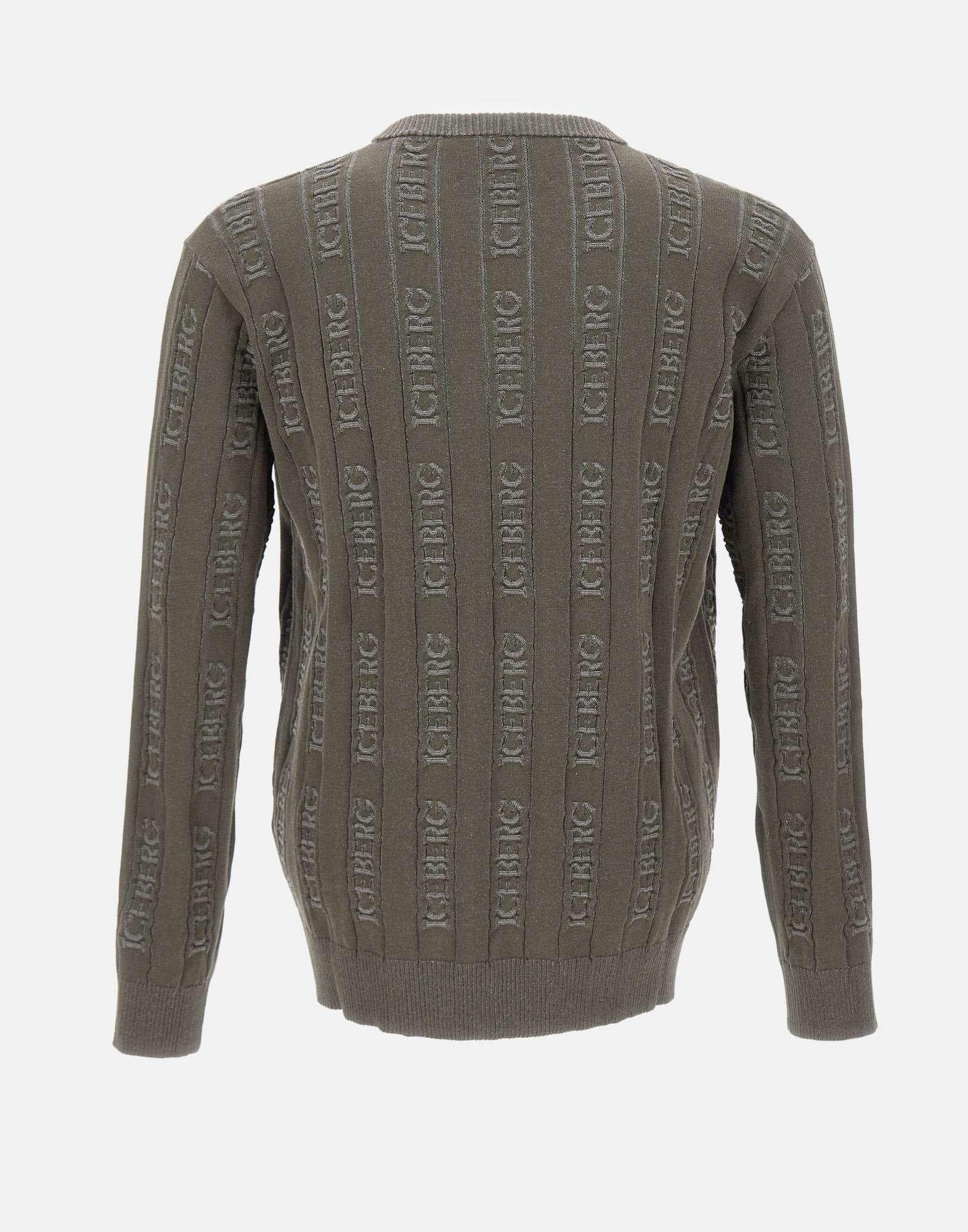 Iceberg mens sweater crafted from cotton in a military green tone, finished with a vanise knit that creates a refined, subtly shifting texture. The all-over Iceberg logo is knitted in reverse in a discreet contrasting shade, delivering an elegant, recognizable graphic effect without feeling overpowering. Clean crew-neck design, created to enhance the silhouette with a balance of contemporary minimalism and brand identity. Relaxed fit, perfect for polished casual styling.