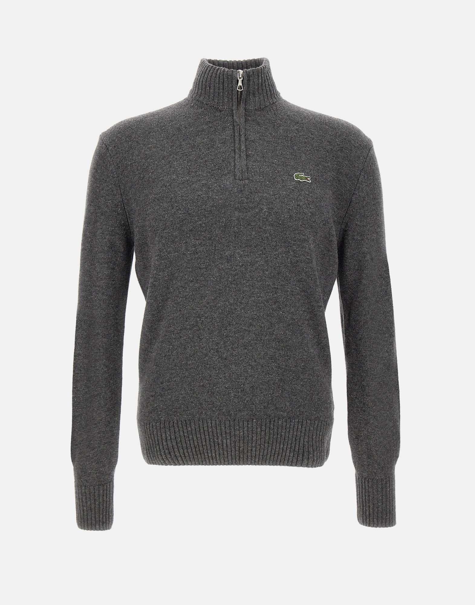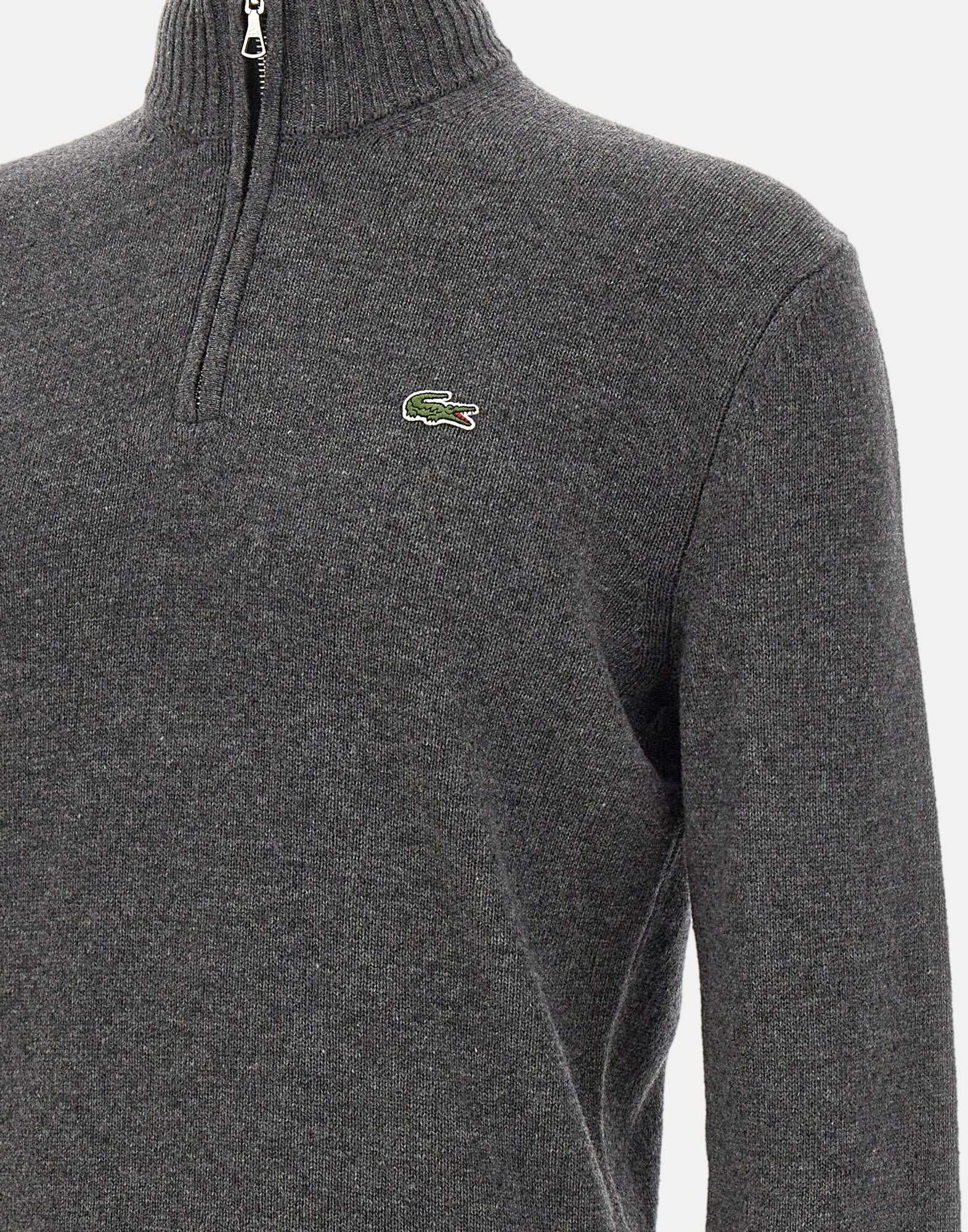 Lacoste men's sweater in carded wool in gray, featuring a chunky 7-gauge knit for warmth and comfort. The model features a high neck with a half-zip closure, long sleeves, and ribbed edges for an elegant yet sporty finish. Iconic crocodile embroidered on the chest. Classic fit.