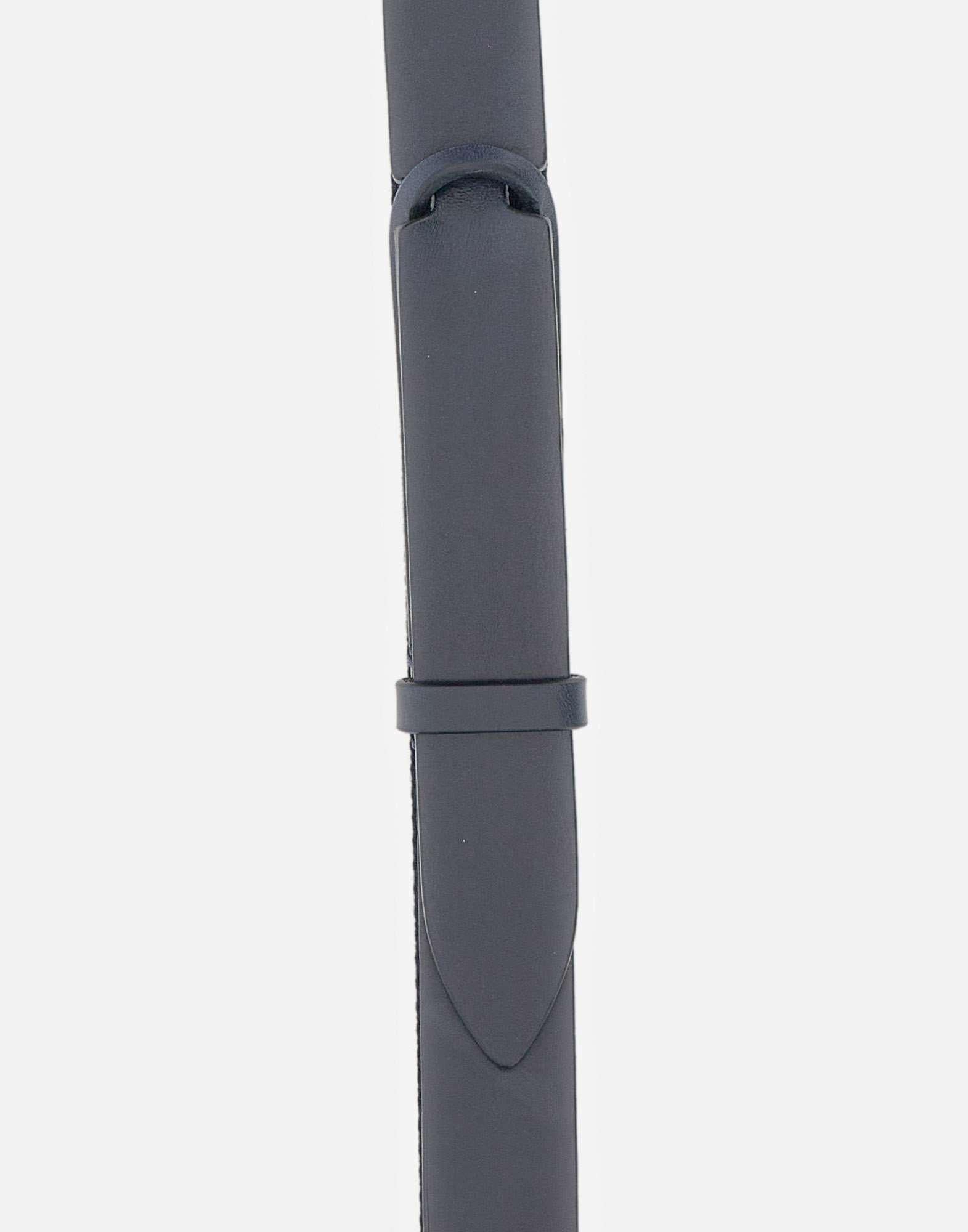 Orciani "Nobuckle bul" belt, blue, in leather with a fabric backing, featuring a simple and modern design without a buckle. Featuring a sliding ring with a matte nickel-free finish, it is one size fits all, adjustable from size 42 to 56, ideal for a variety of wearability. 3 cm wide, expertly crafted. A versatile and refined accessory, perfect for casual or formal looks. Made in Italy.