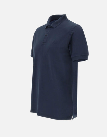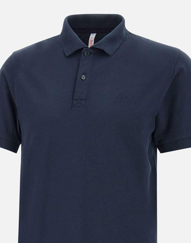 "Polo cold dye" Sun68 men, navy blue, garment dyed fabric, short sleeves, stretch cotton piquet fabric, floral print lining, classic collar closed by logo buttons, tone-on-tone embroidered logo on chest, mini slits at hem, ribbed edges, regular fit.