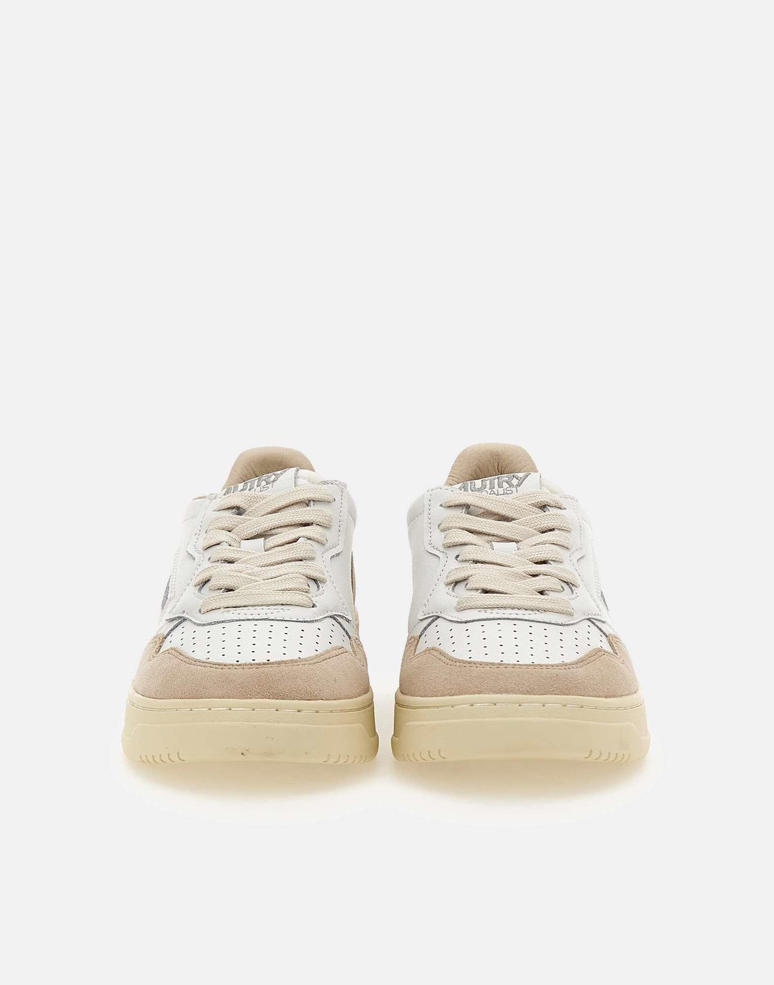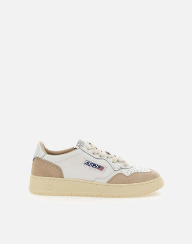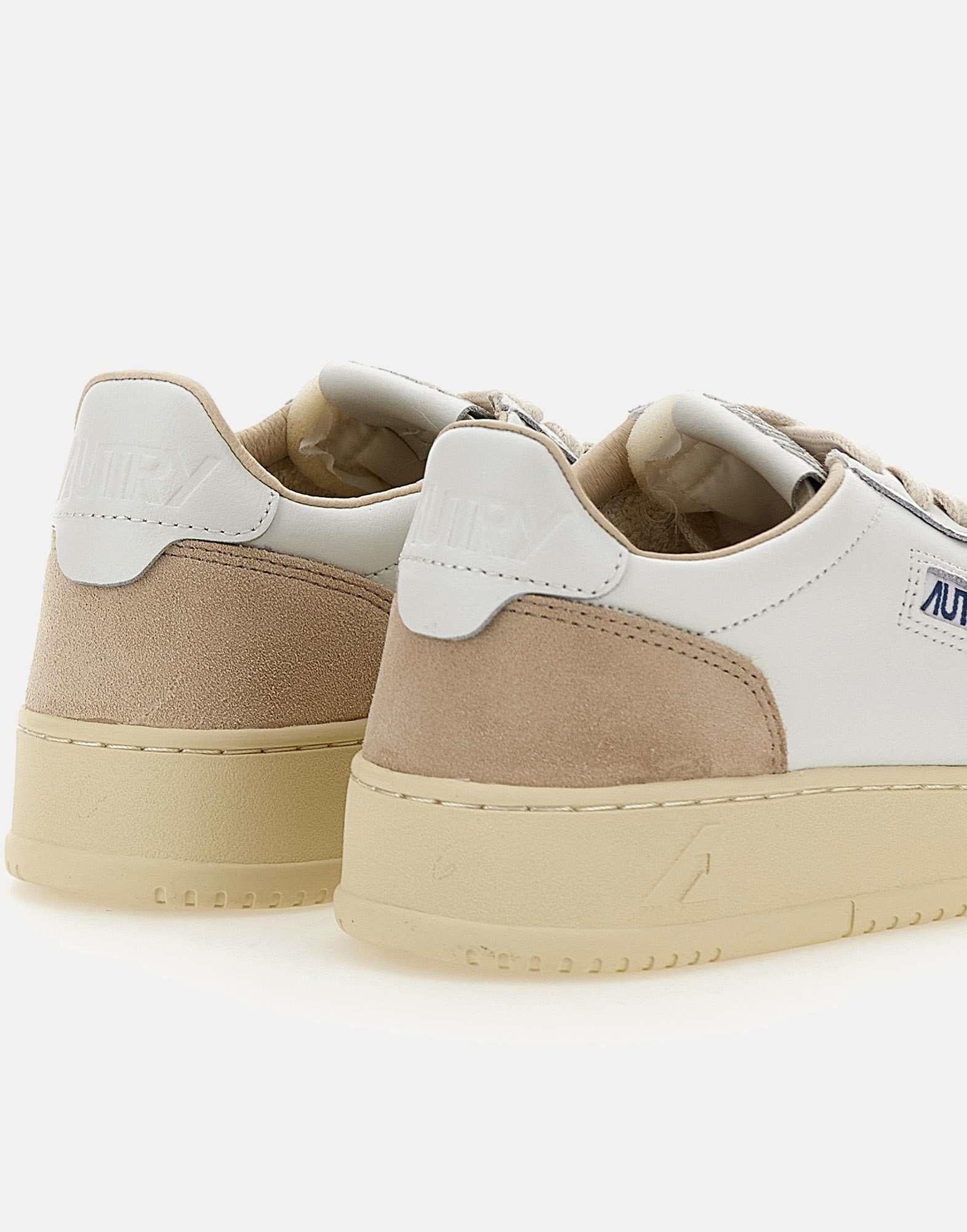 Autry "AULW LS33" women's white leather with beige suede inserts sneakers, 80s design, beige laces, logo on tongue and on back, iconic side flag, internal lining cotton and sponge, perforated toe to improve breathability, sole rubber 3.5 cm high. Case included.