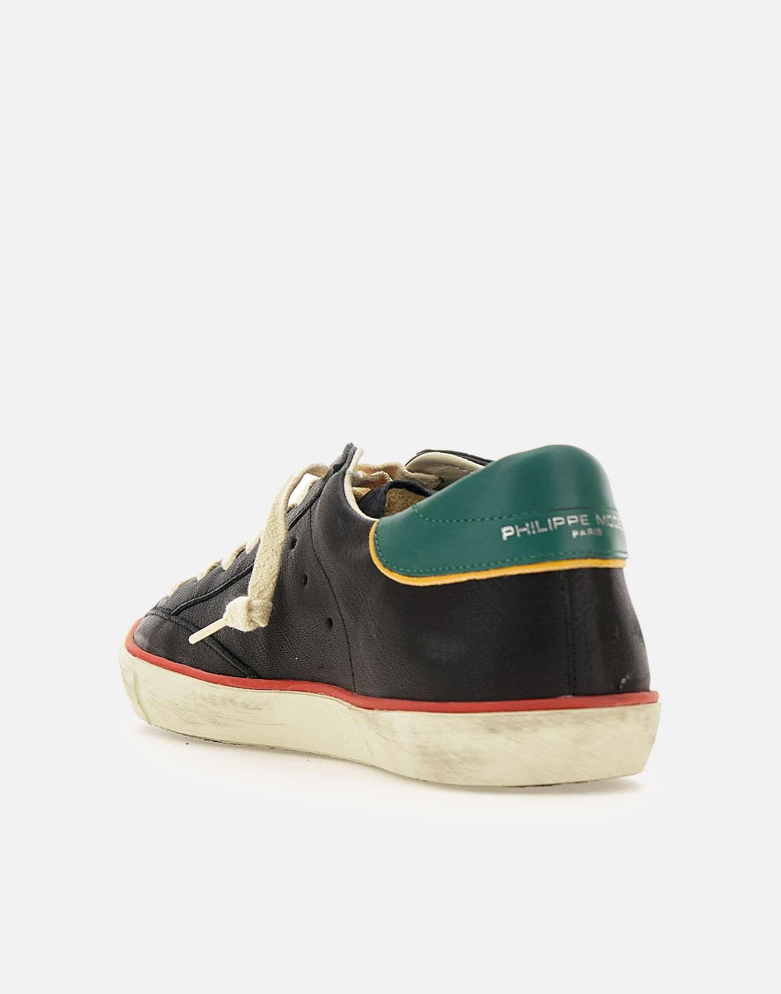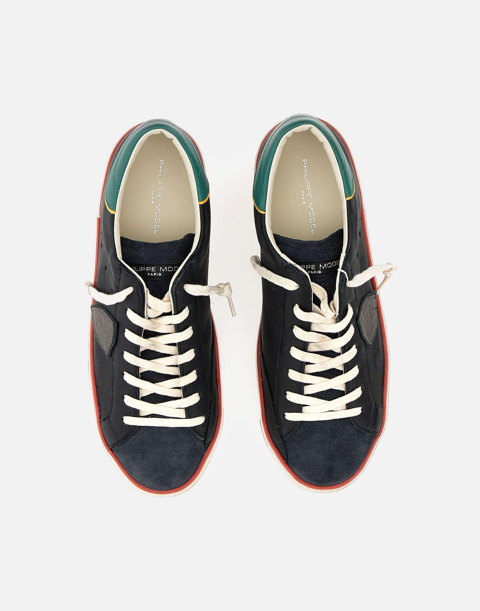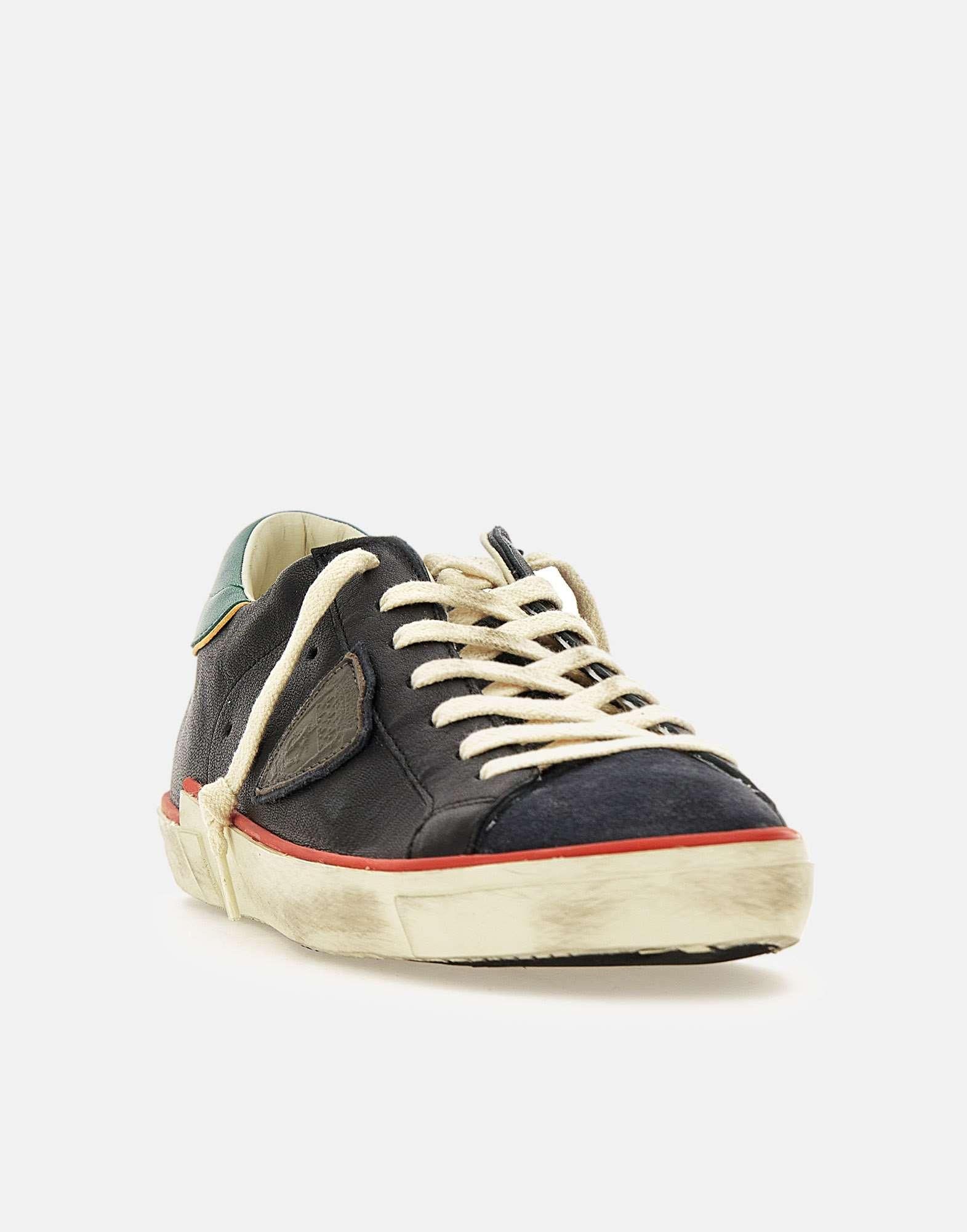 Philippe Model Paris "Prsx" men's multicolor sneakers in shades of blue, green, and red, crafted from distressed leather and suede. Low-top design with a contrasting spoiler inspired by Scudetto, laces, and deliberately distressed details for a contemporary, urban look. Cotton terry lining for breathability, a removable padded insole for personalized comfort, and a rubber sole with irregular hand-woven tread, distressing, and red piping. 2.5 cm sole. Protective case included. Made in Italy. Regular fit.