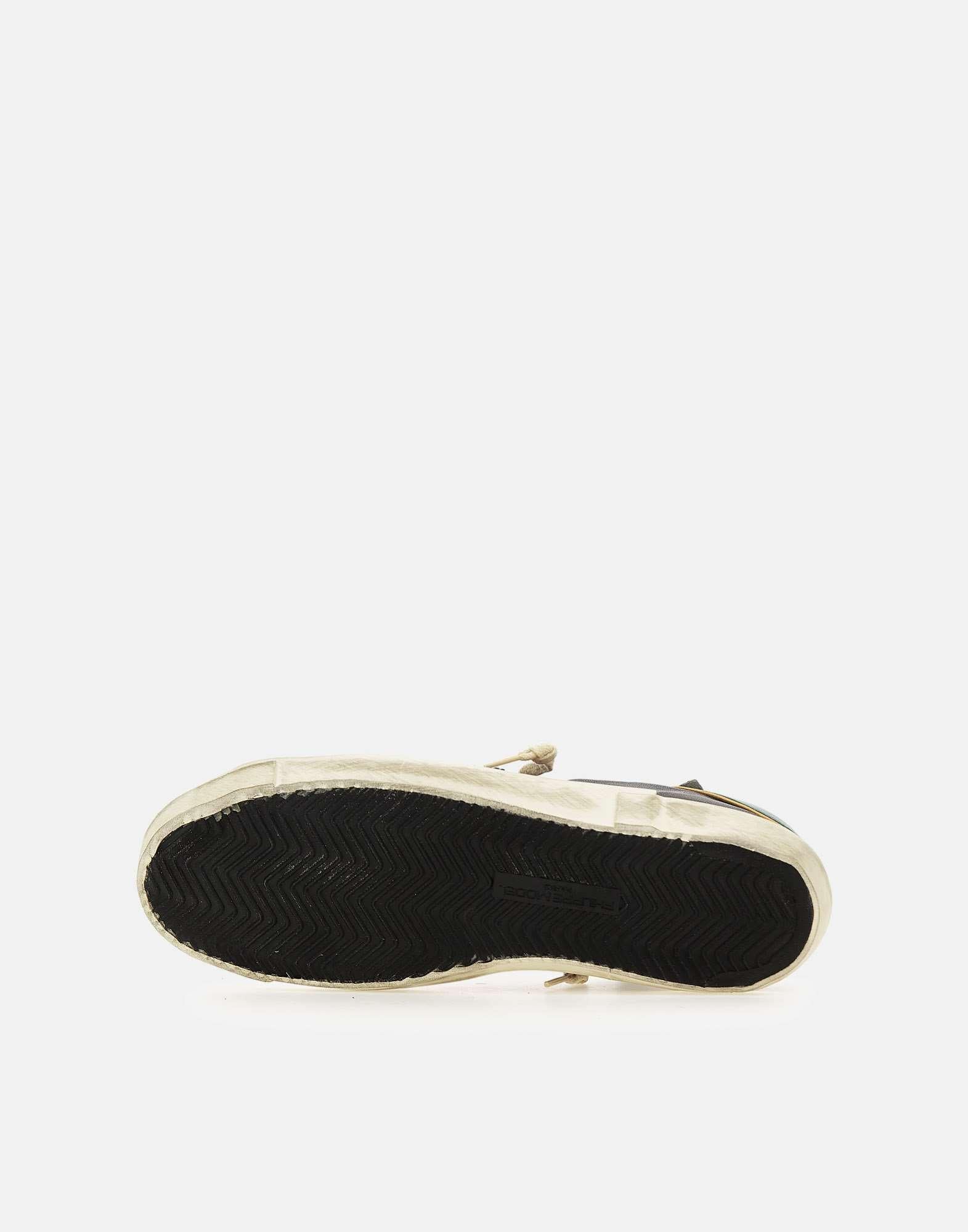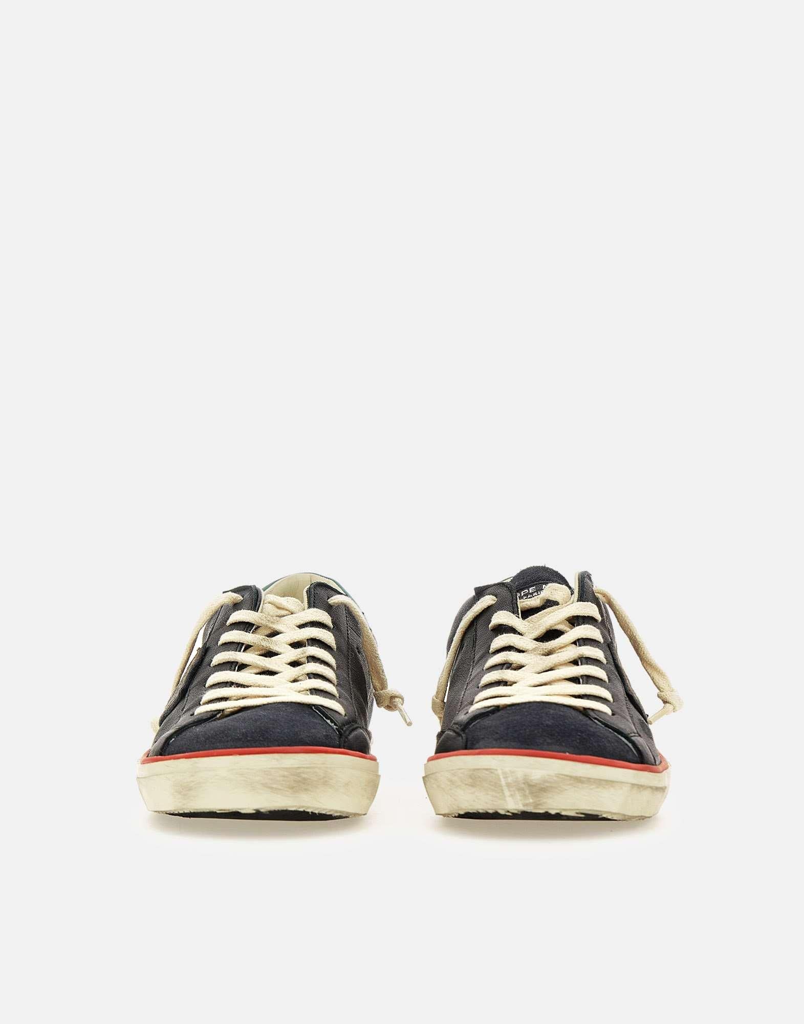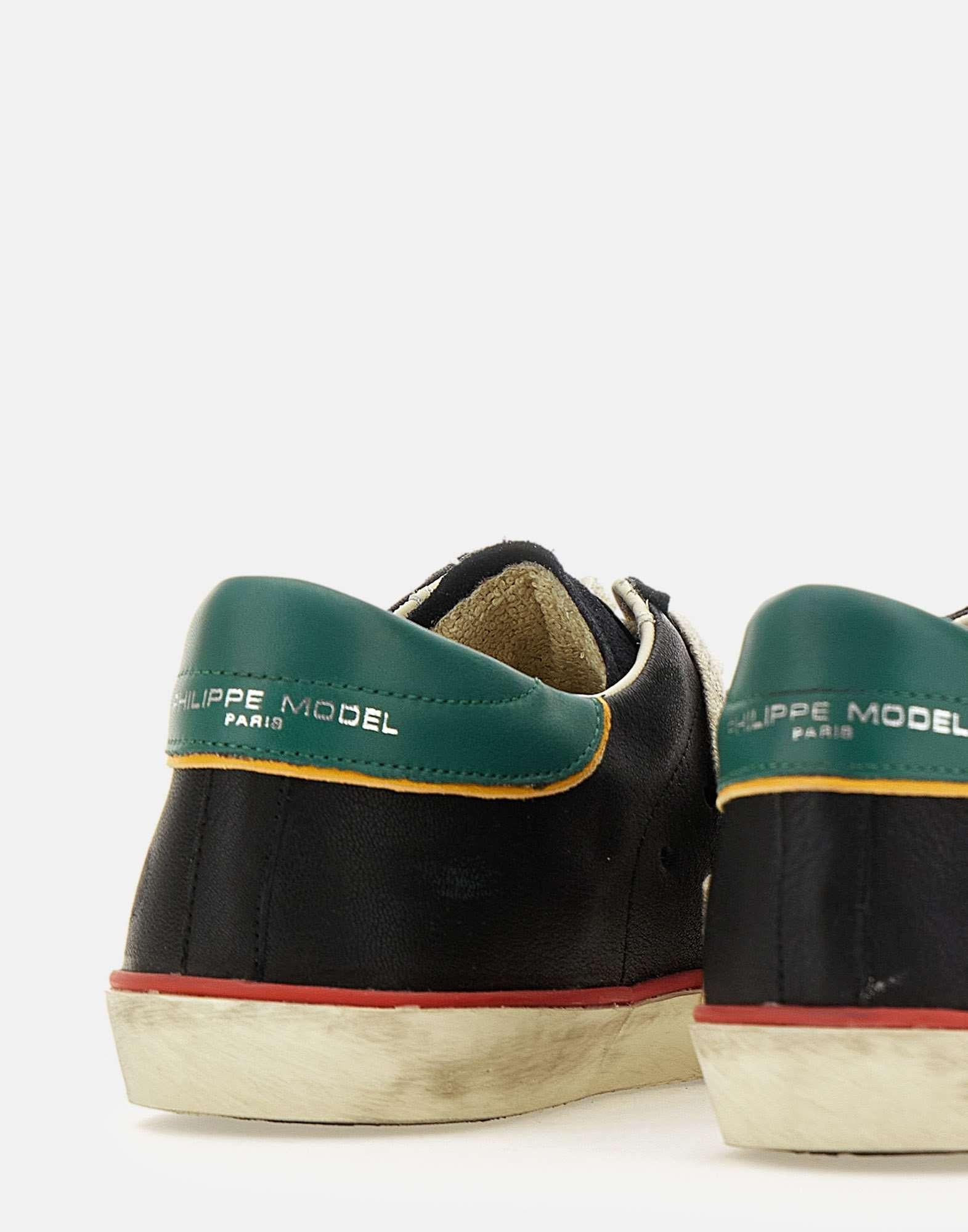 Philippe Model Paris "Prsx" men's multicolor sneakers in shades of blue, green, and red, crafted from distressed leather and suede. Low-top design with a contrasting spoiler inspired by Scudetto, laces, and deliberately distressed details for a contemporary, urban look. Cotton terry lining for breathability, a removable padded insole for personalized comfort, and a rubber sole with irregular hand-woven tread, distressing, and red piping. 2.5 cm sole. Protective case included. Made in Italy. Regular fit.