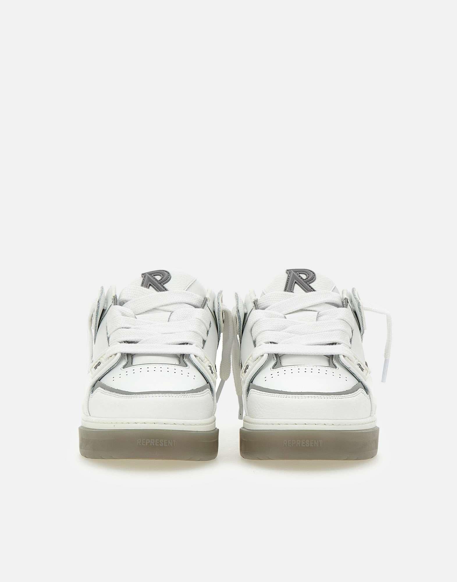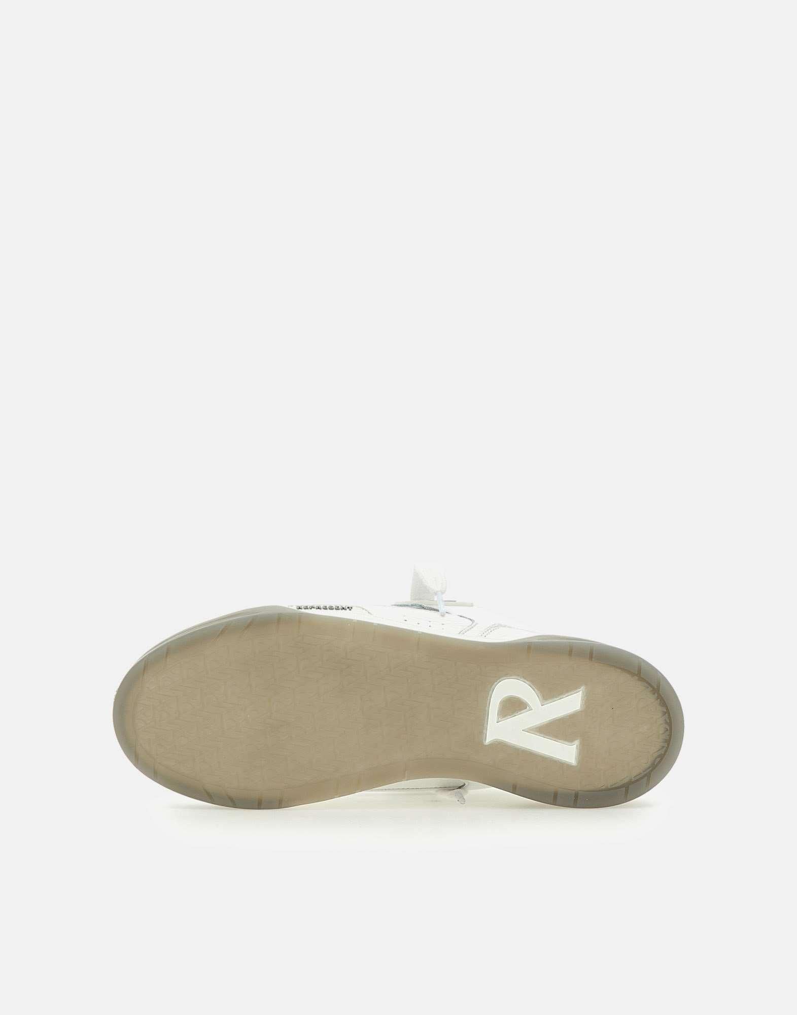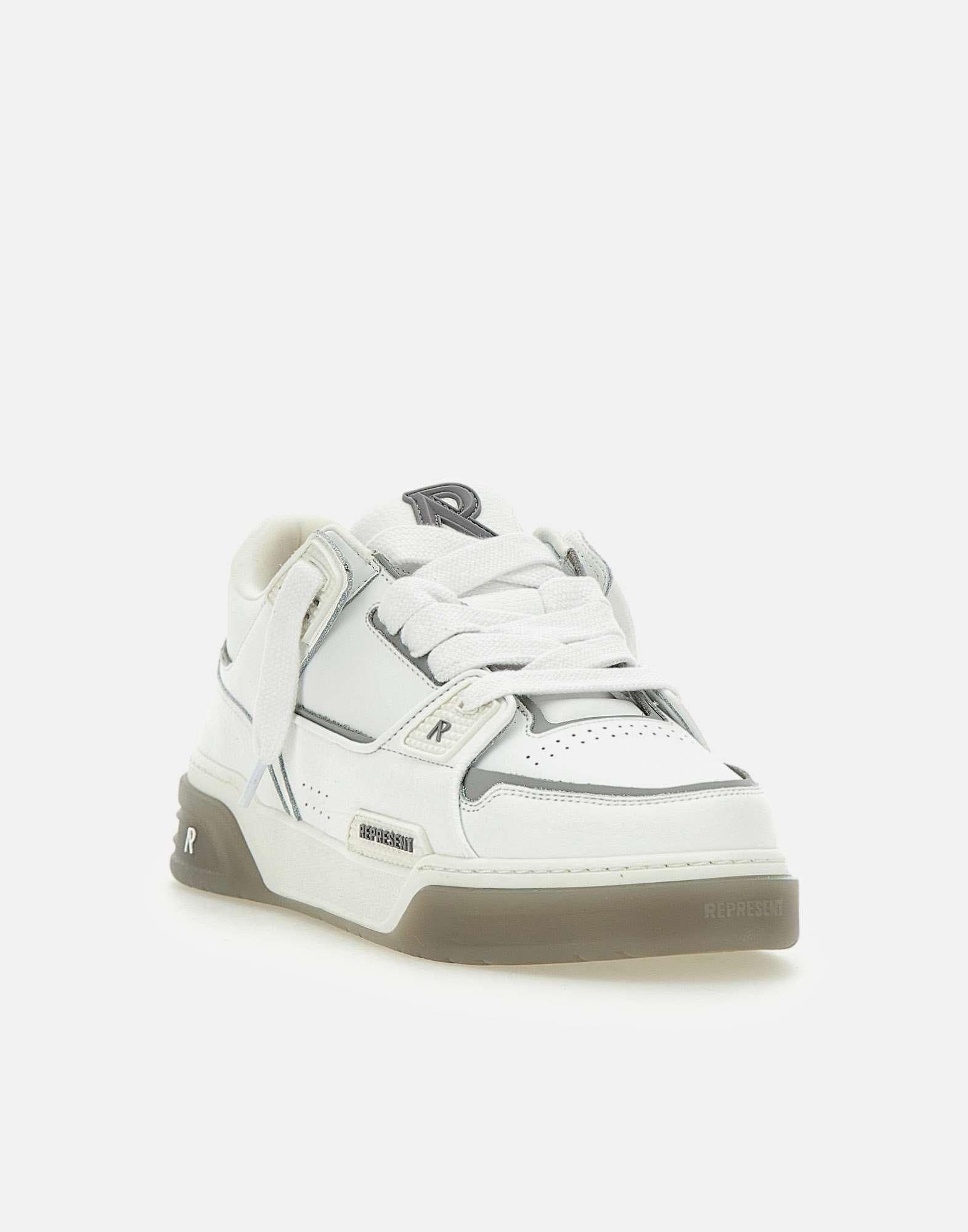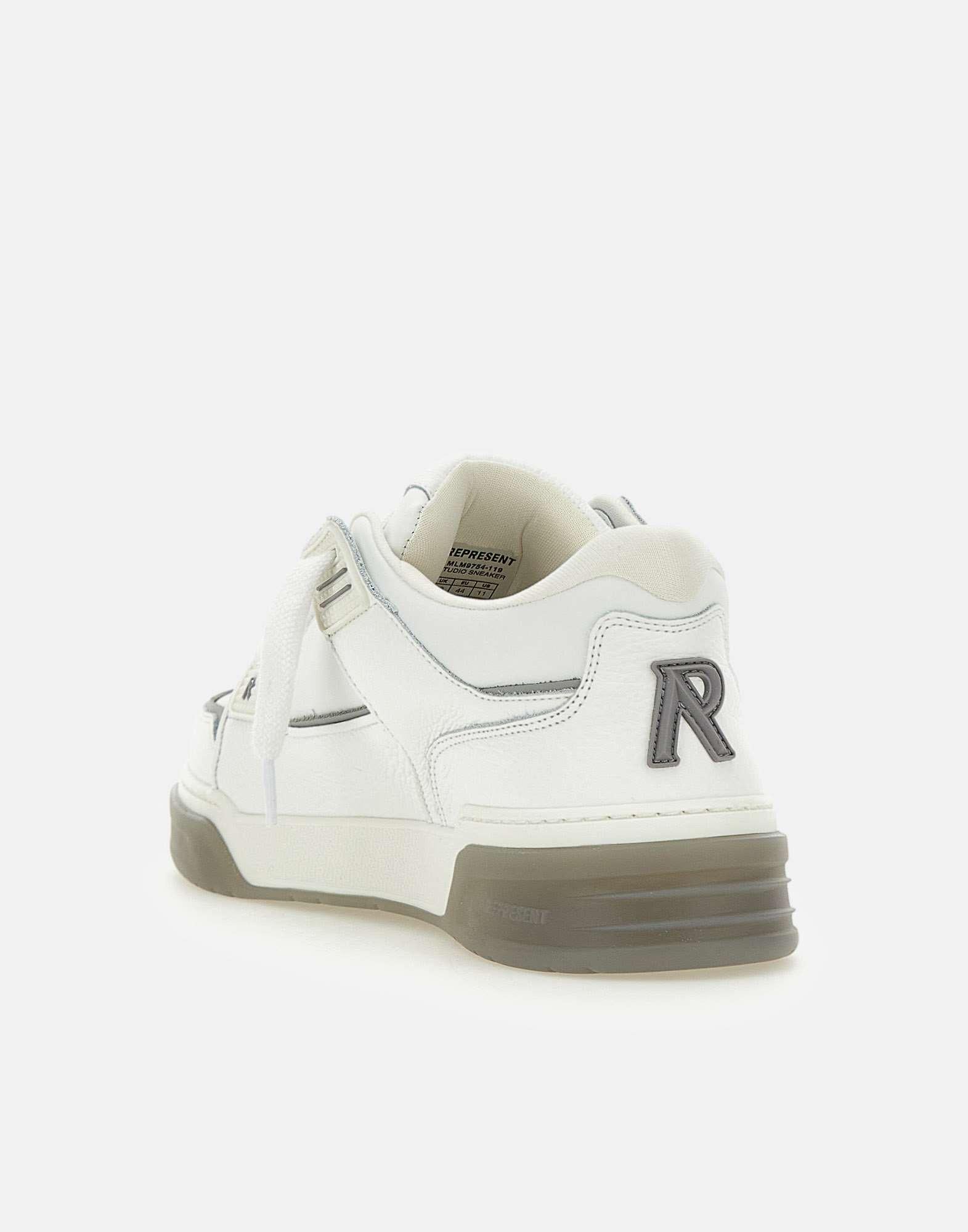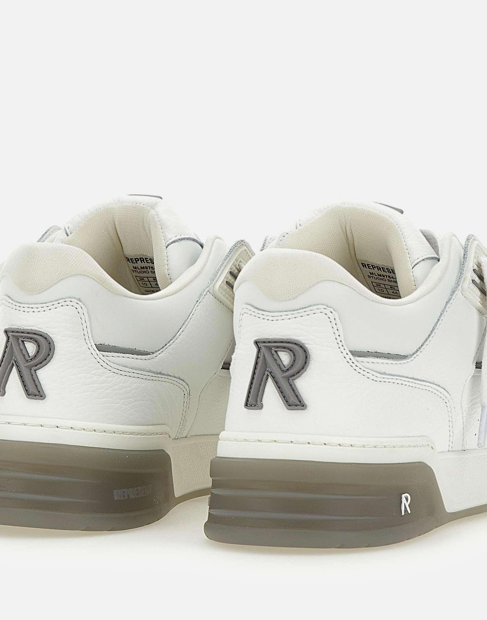 Men's "Studio" Represent leather sneakers, grey and white, upper entirely leather, smooth and hammered, mesh lining, leather insole, TPU profiles with branding on the eyestay and on quarter, extra-large black laces, "Initial R" in TPU with branding on tongue and on heel decorated with a beveled shape, elastic gusset on tongue, large amount of internal padding, twin cupsole rubber outsole height 5 cm. Regular fit.