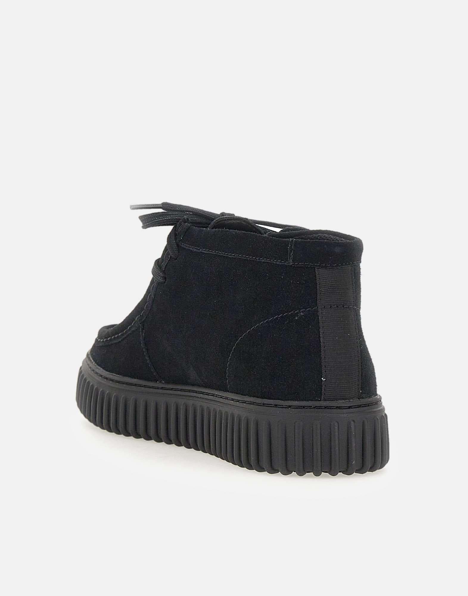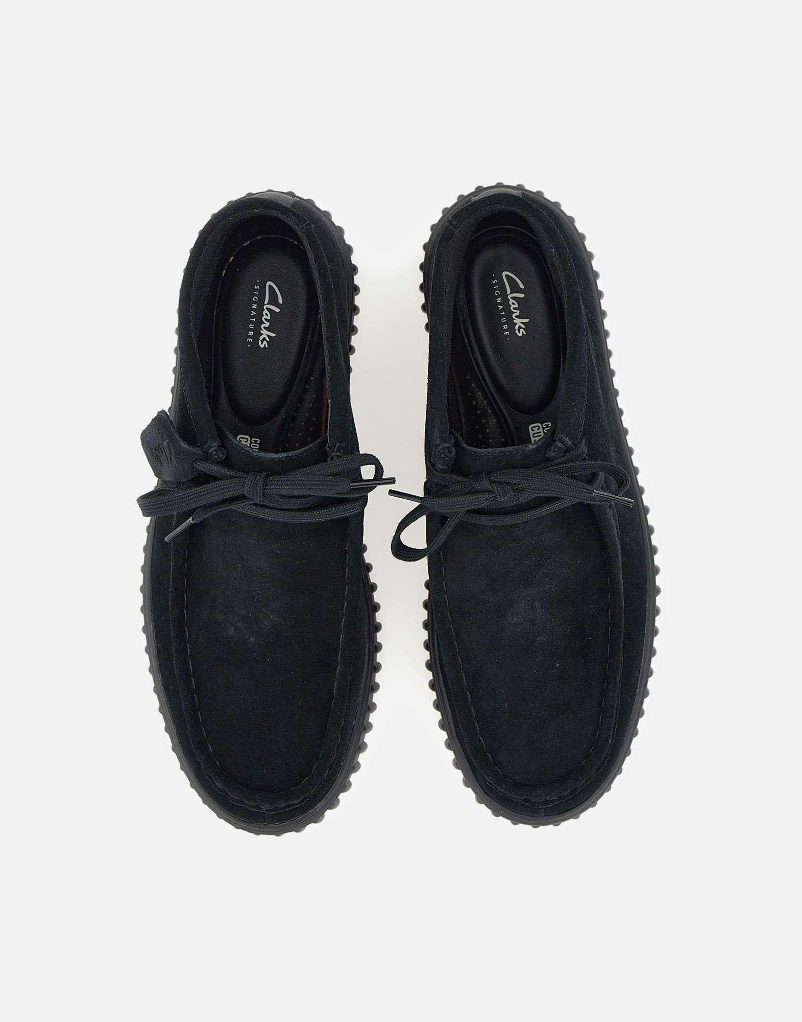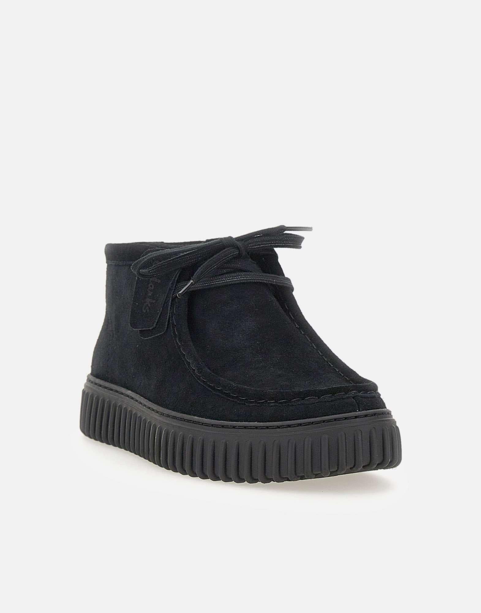 The Clarks "Torhill Hi", crafted from premium suede in classic black, features a streamlined, lace-up design with fluid, contemporary lines. The upper, paired with a soft, naturally breathable sheepskin lining, ensures maximum comfort all day long. The removable, molded Contour Cushion footbed, made partly from recycled materials, provides anatomical support with every step. The model is completed by a TPR (thermoplastic rubber) outsole, known for its flexibility and grip, and the Clarks and Torhill logos, underscoring the brand's authenticity and heritage. Regular fit. UK size 10 corresponds to EU size 44.5. Convert your size using the CLARKS MEN'S FOOTWEAR UK size chart.