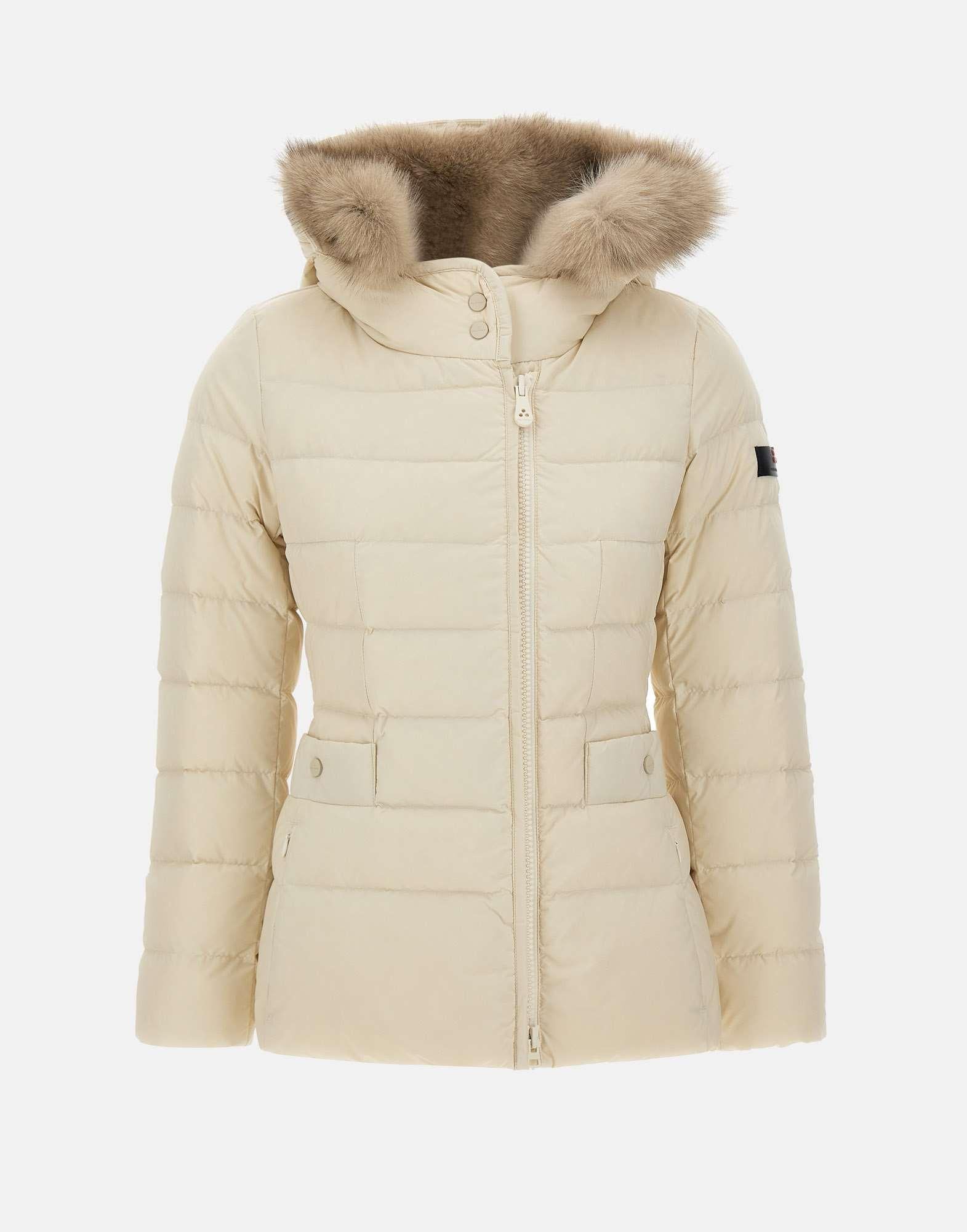 Peuterey "Turmalet ML 06 Fur" down jacket in a refined cream color, made of lightweight nylon poplin and polyester microfiber, treated at high temperatures to give it a firm feel and a powdery texture. The hood is embellished with a removable fox fur trim.