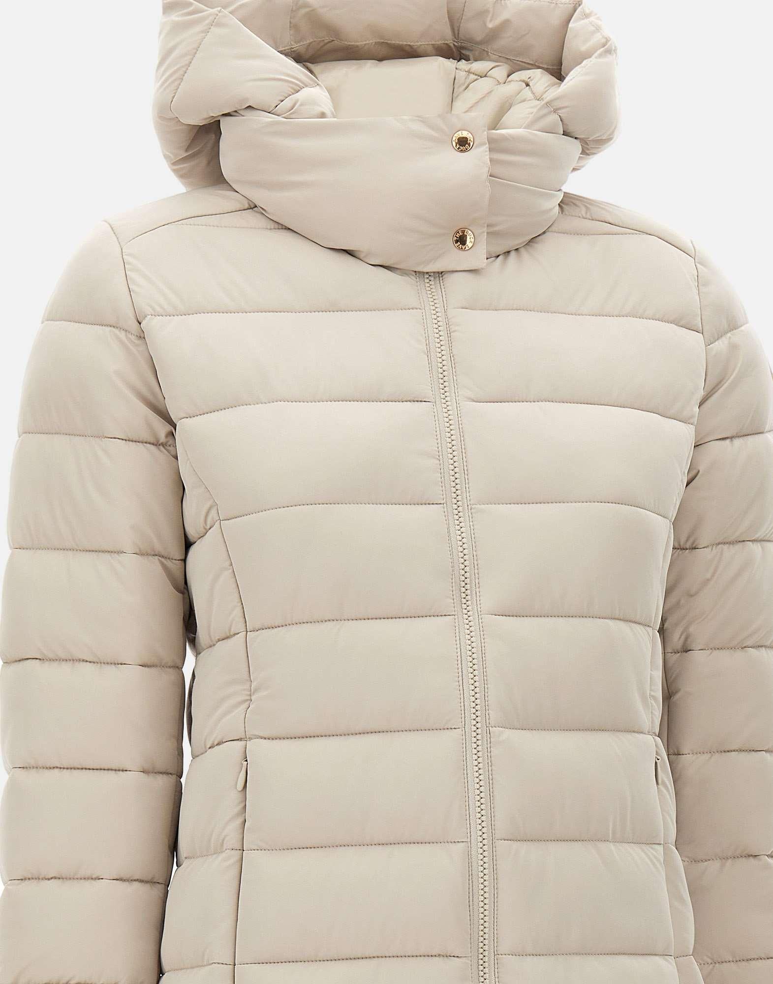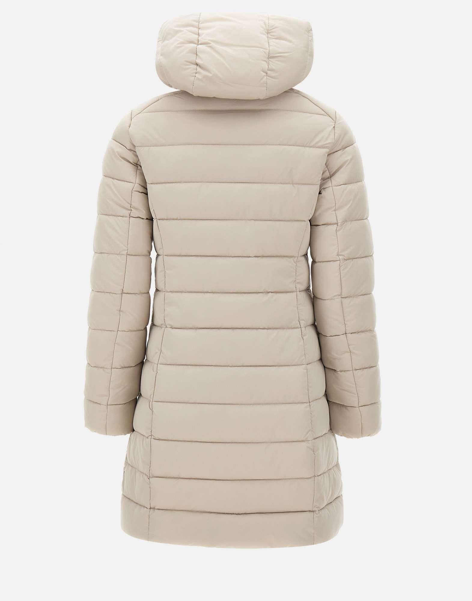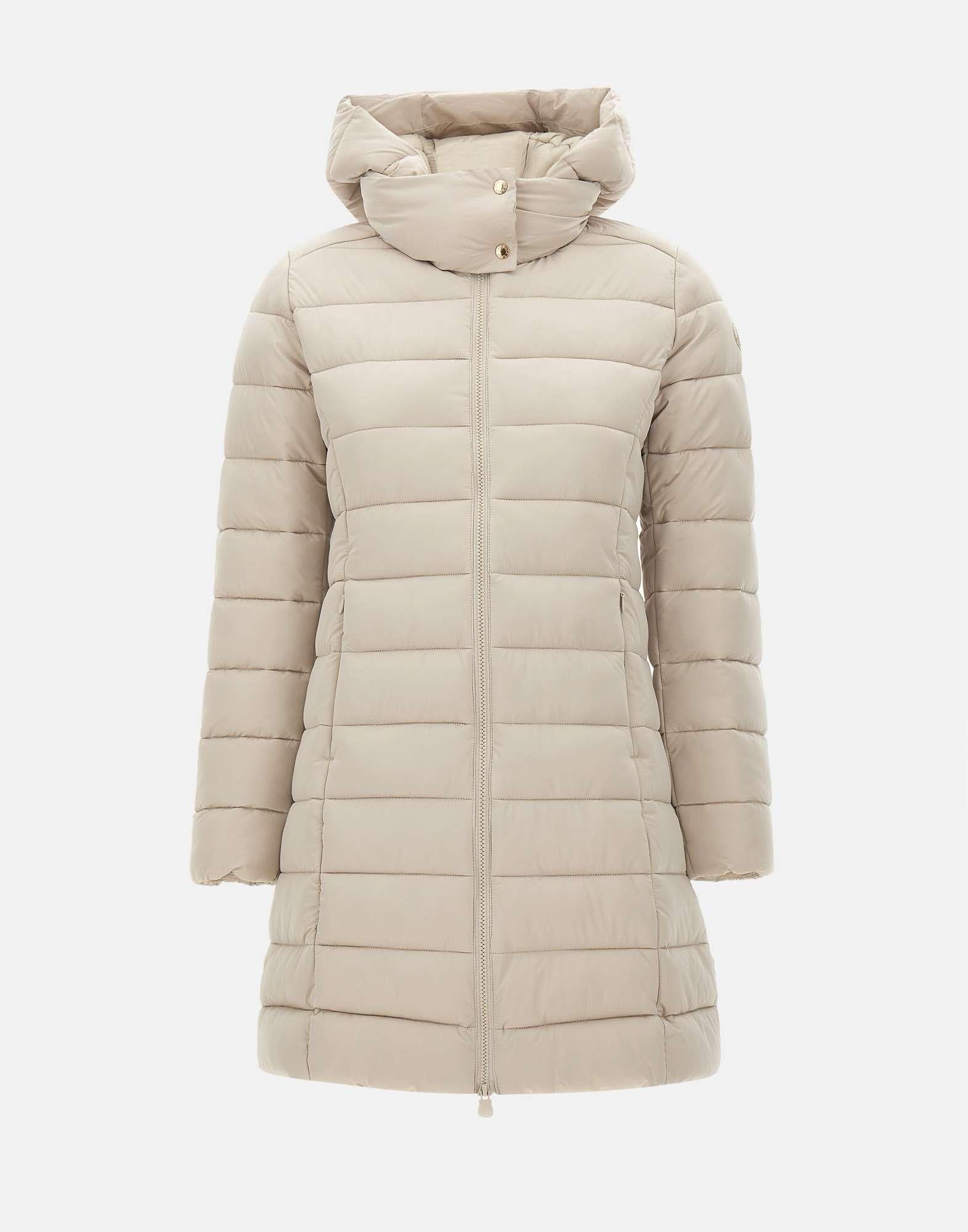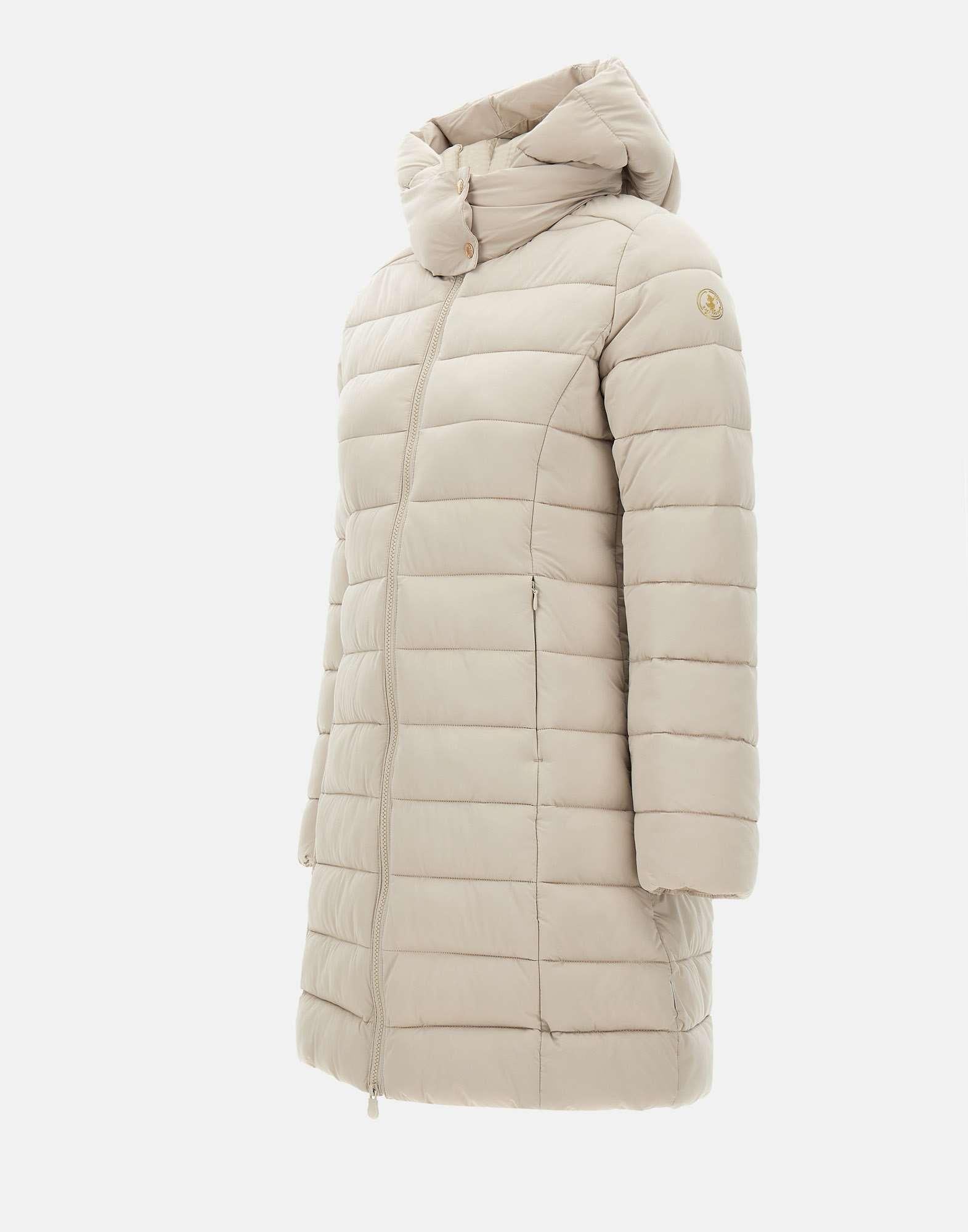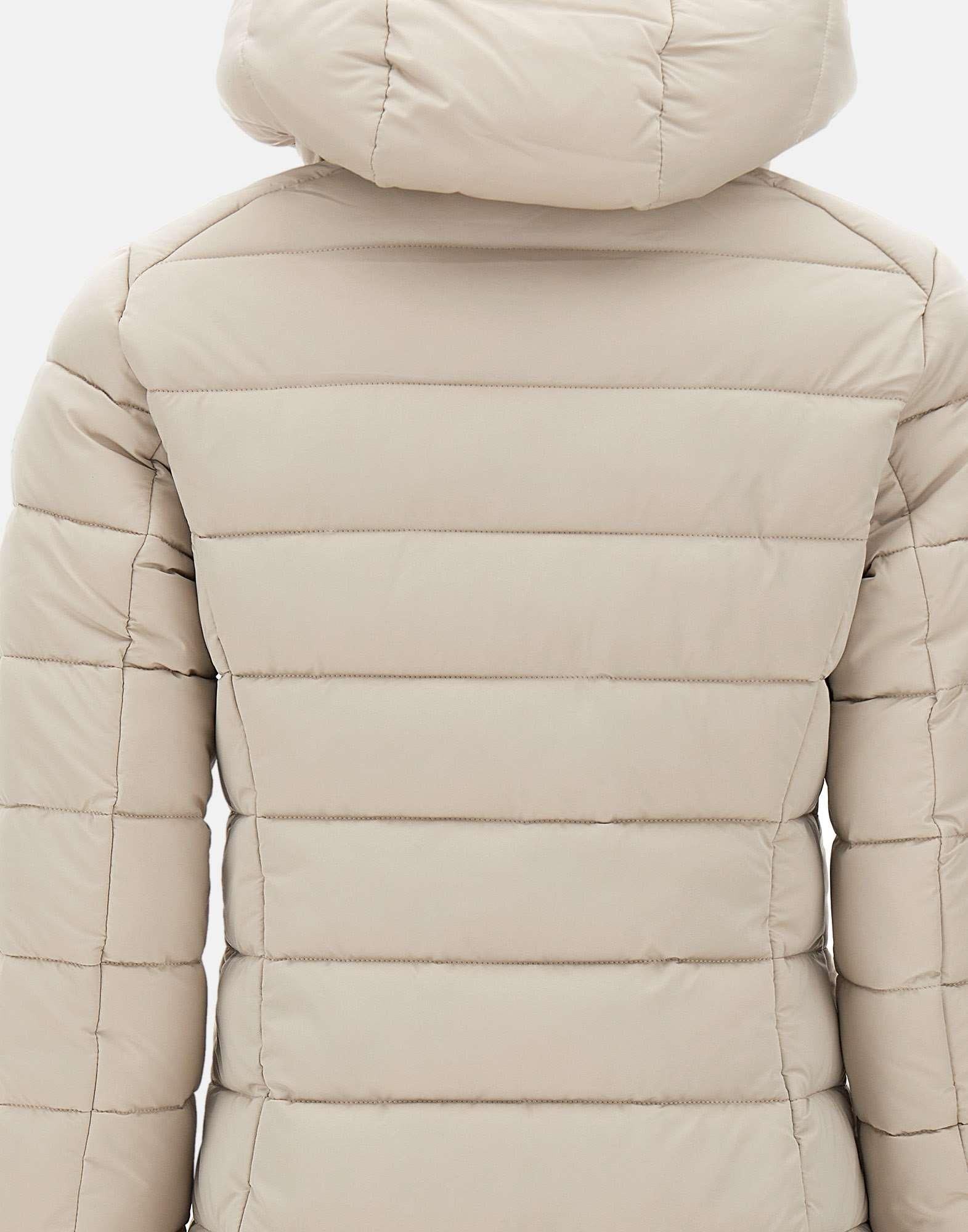 The "Edel21Enis" women's down jacket by Save The Duck, in sand, combines style and functionality in a feminine and sustainable silhouette. Made of windproof and water-resistant nylon with 100% animal-free padding, it features a removable hood, a padded collar with gold logo buttons, and a central zip closure. Side zip pockets complete an elegant and practical design, ideal for cold season. Slim fit.